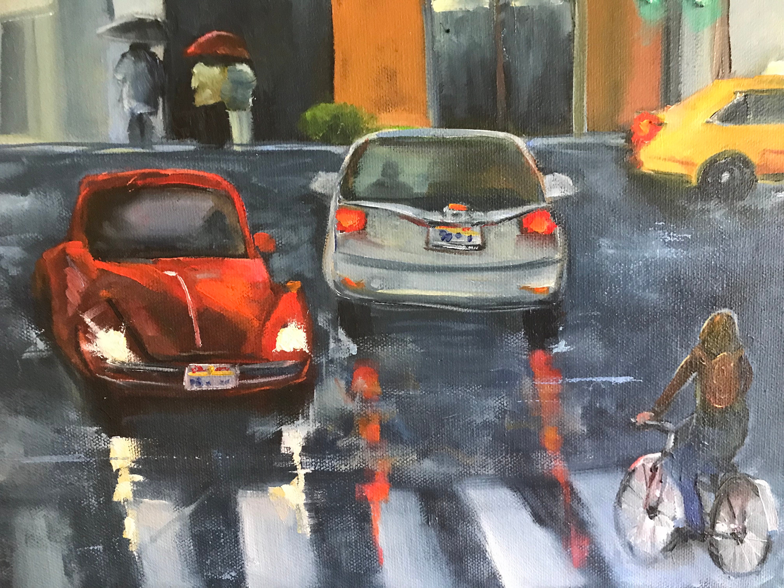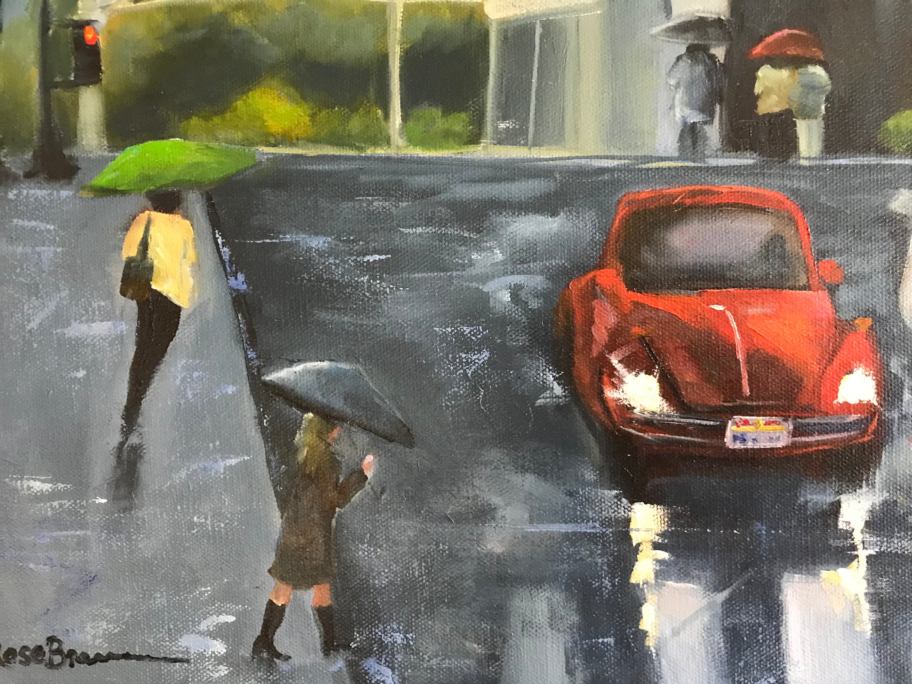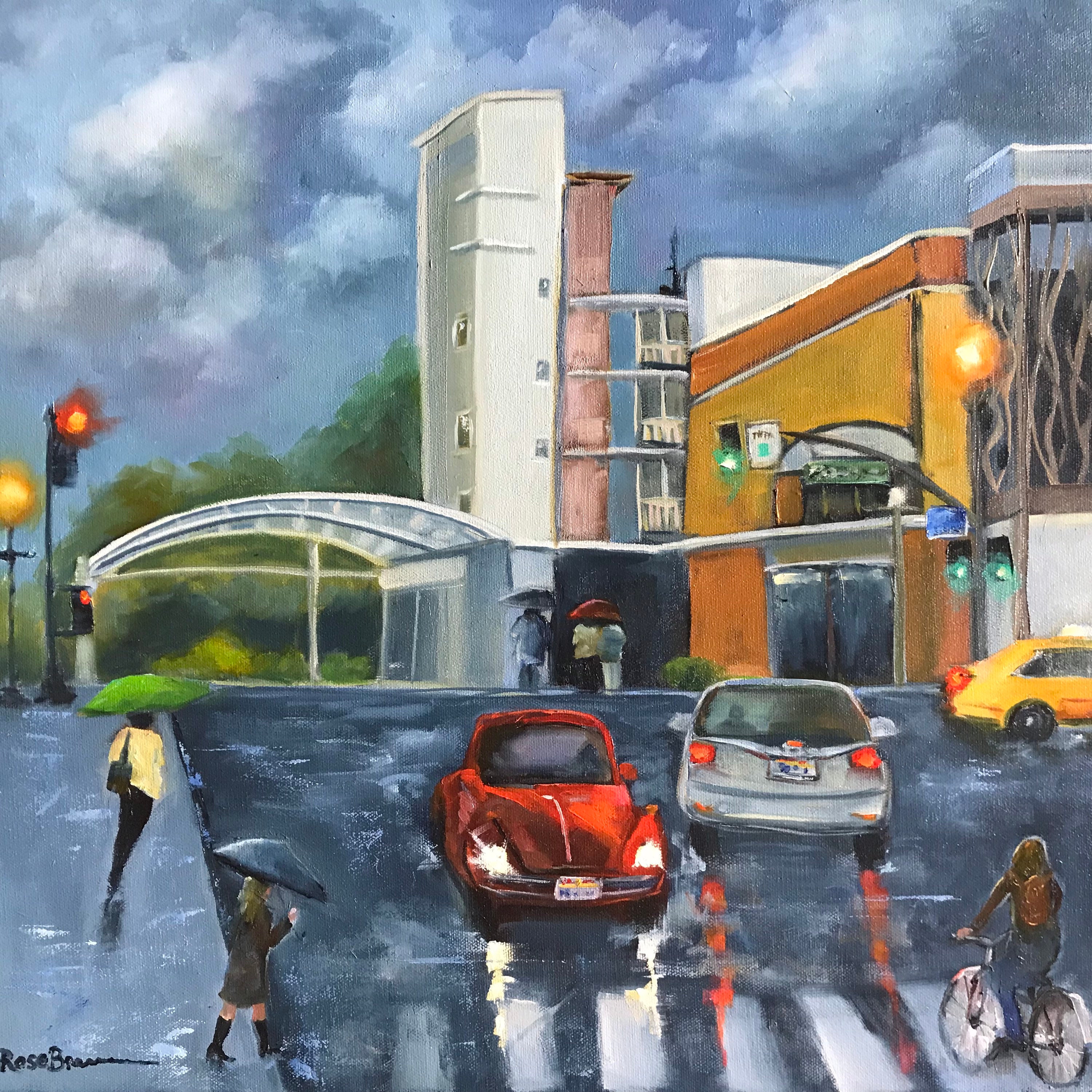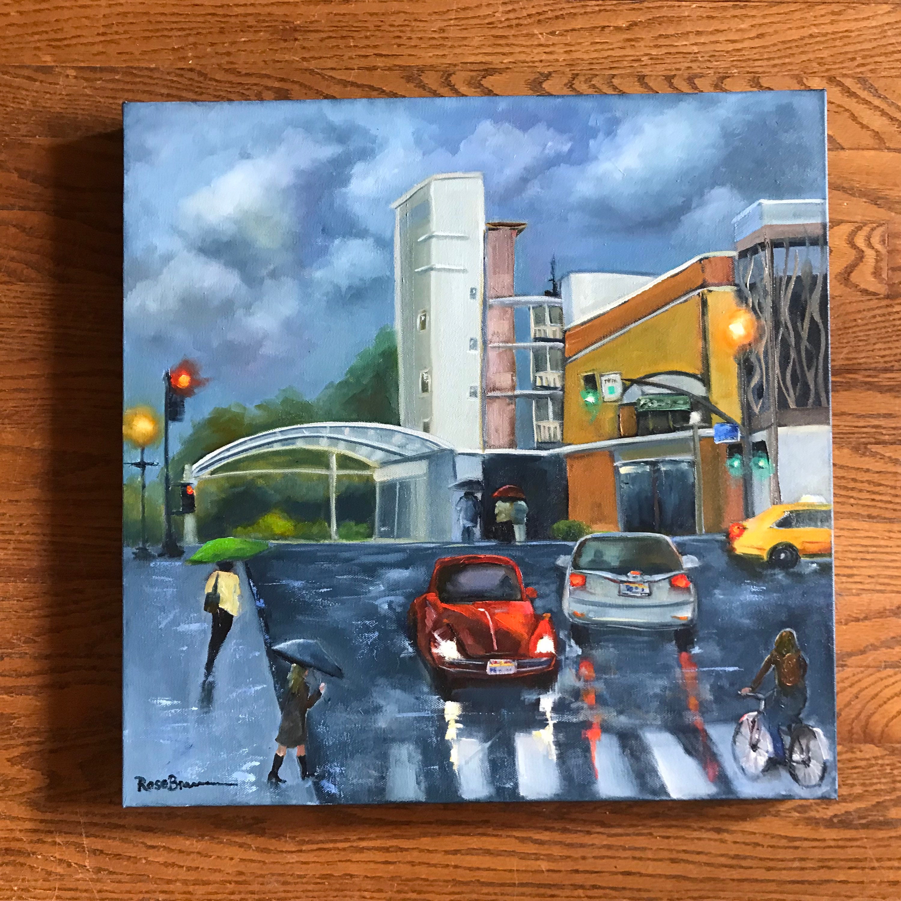 SUNNYVALE CALIFORNIA is an original 20” x 20” UNFRAMED oil painting on a quality linen canvas. This incredible painting of a city scene. It’s raining, so people are walking with umbrellas. There’s a woman on a bike. Cars are coming and going. This is an impressionistic feel to the whole painting, which is very pleasing. The paint is applied with bold strokes and the colors are bold.