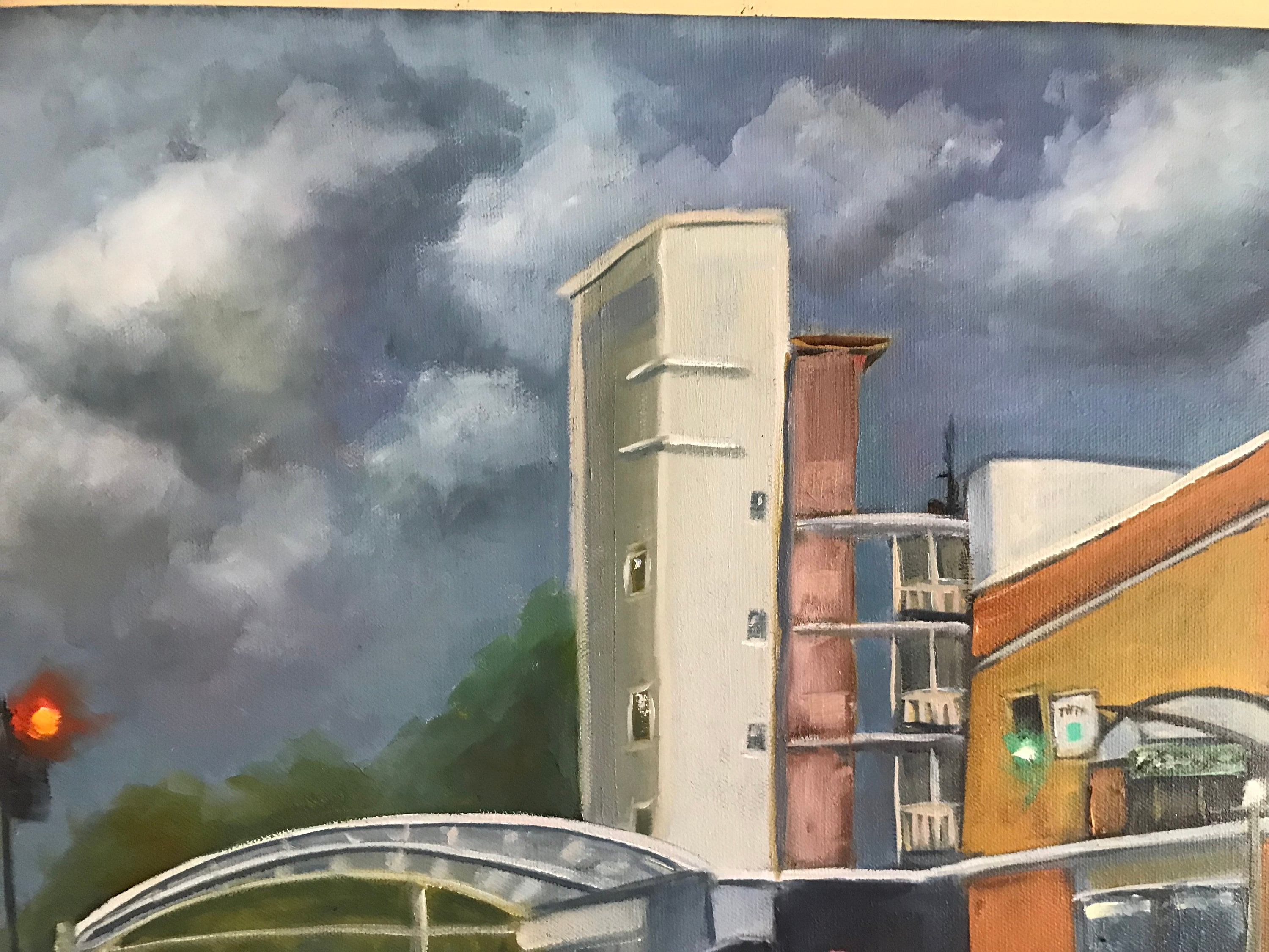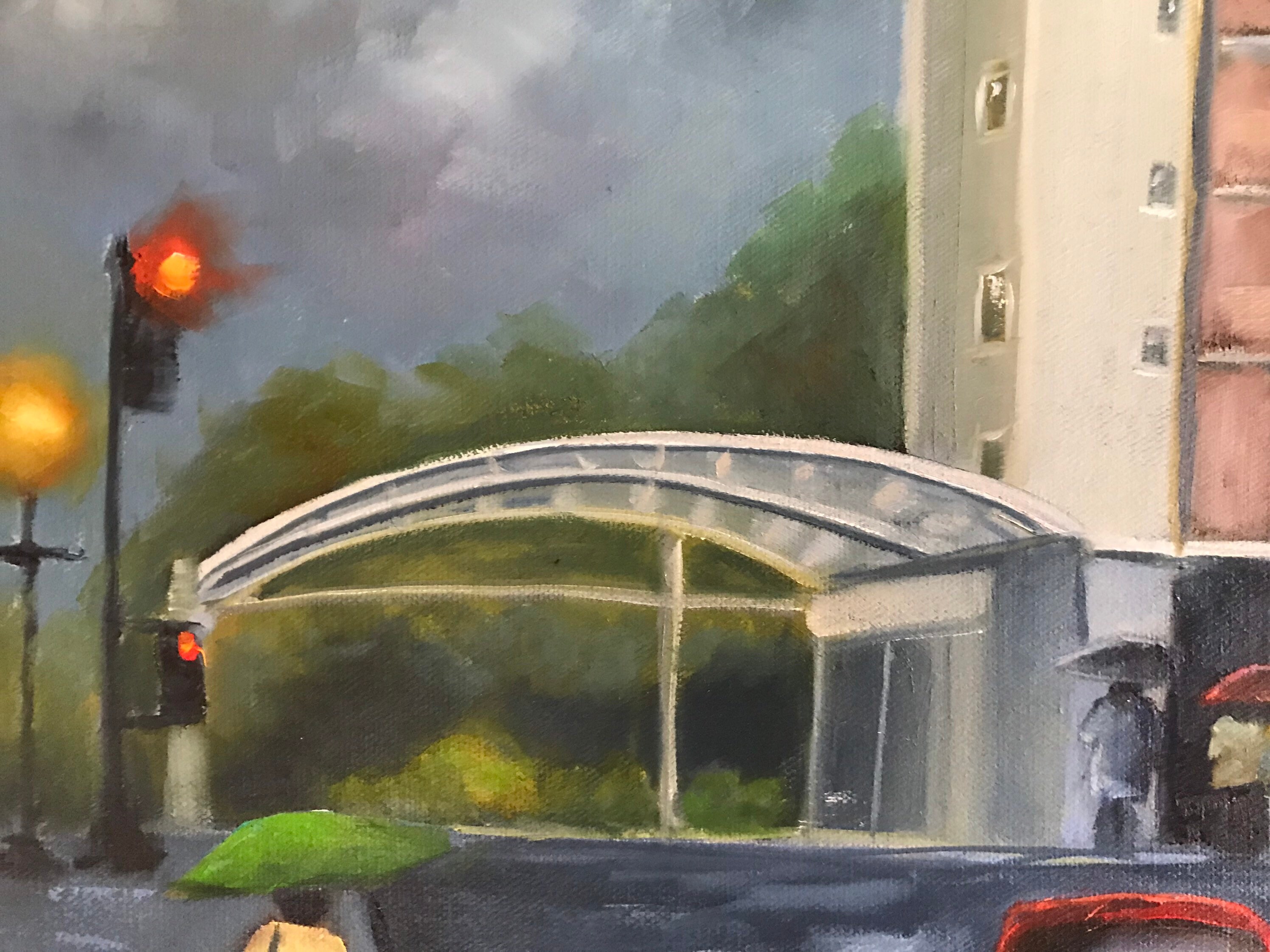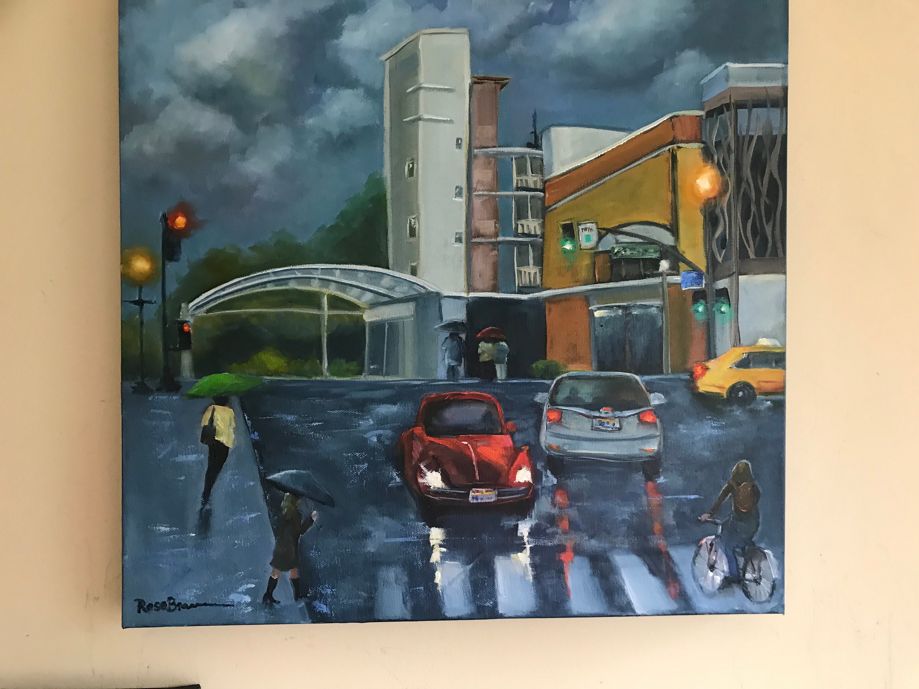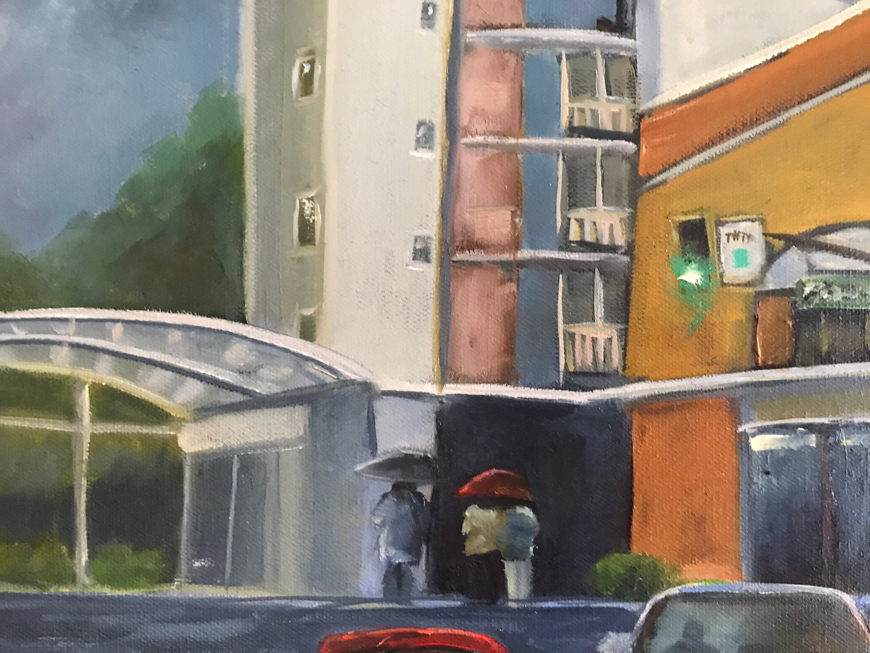 SUNNYVALE CALIFORNIA is an original 20” x 20” UNFRAMED oil painting on a quality linen canvas. This incredible painting of a city scene. It’s raining, so people are walking with umbrellas. There’s a woman on a bike. Cars are coming and going. This is an impressionistic feel to the whole painting, which is very pleasing. The paint is applied with bold strokes and the colors are bold.