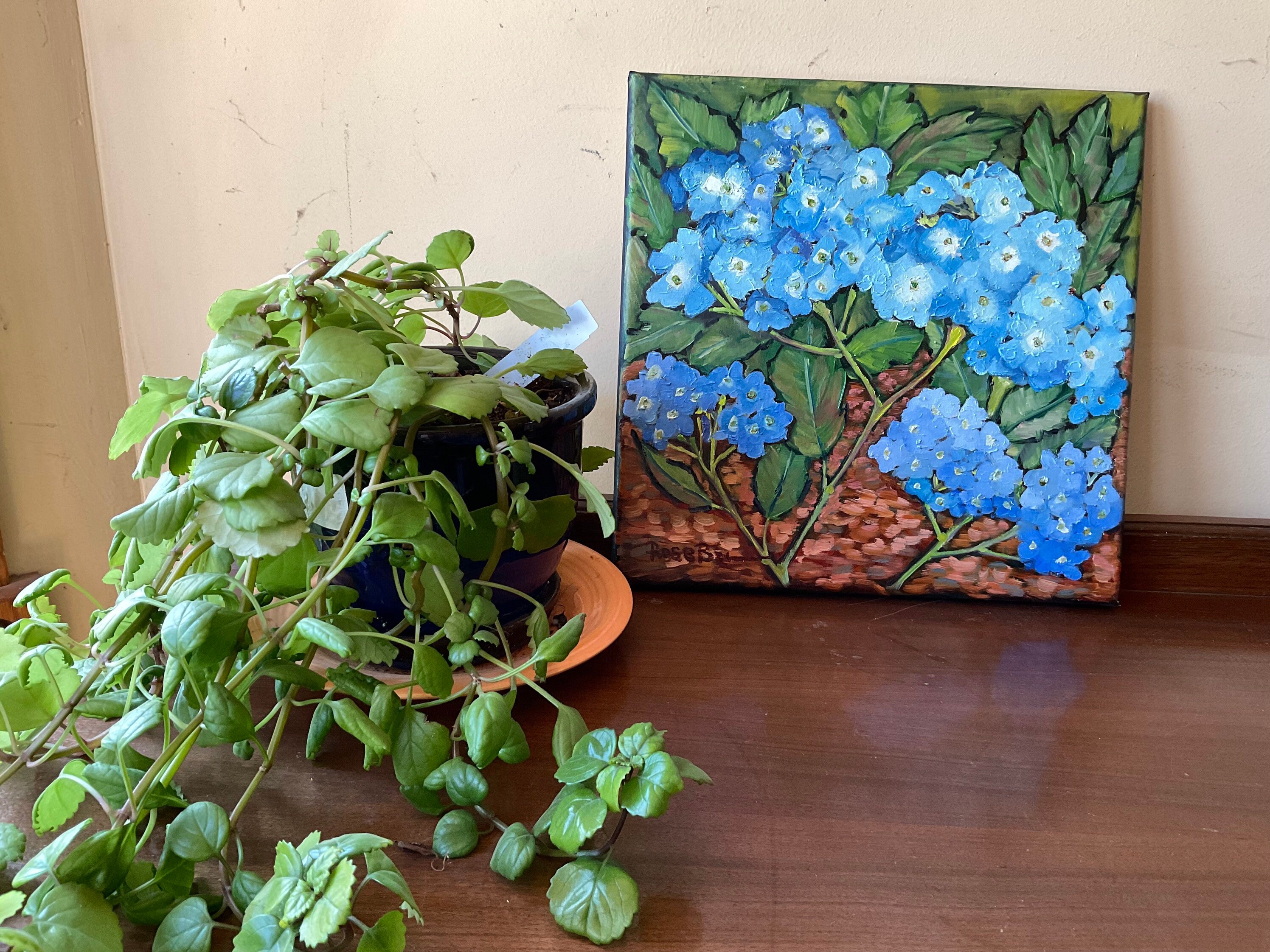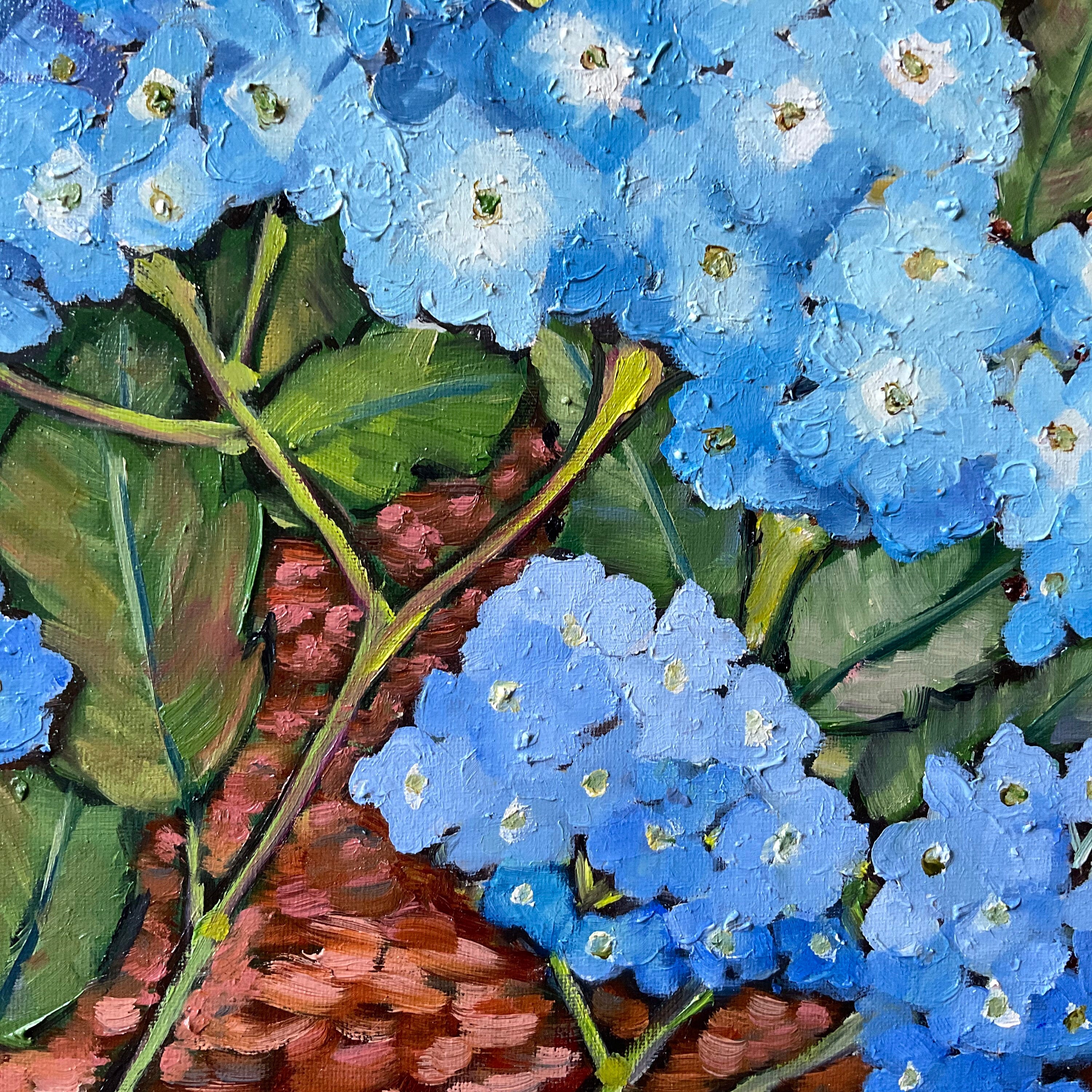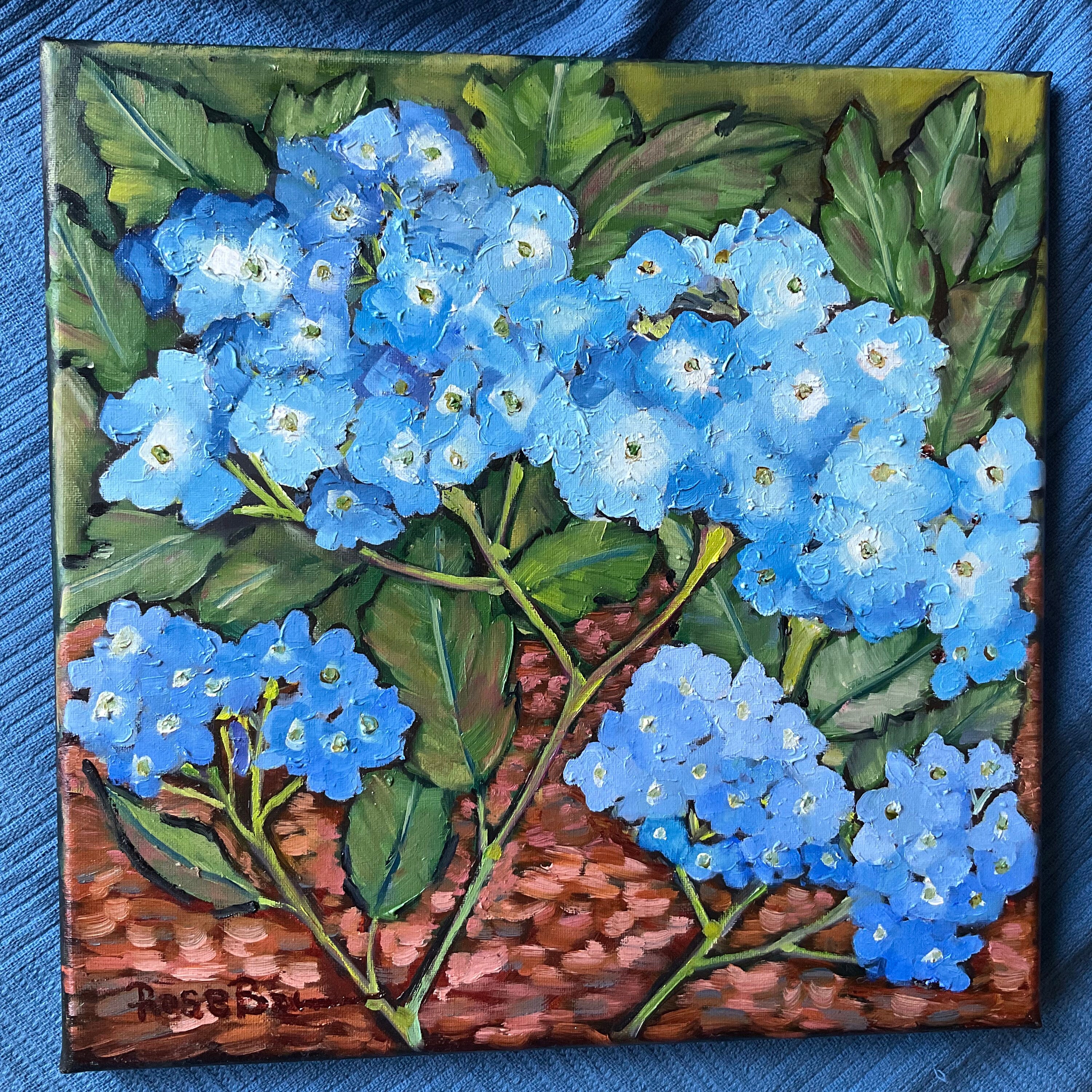 BLUE HYDRANGEA BUSH is an original 12" x 12" UNFRAMED oil painting on a quality canvas. This is a beautiful painting! This is a painting of a blue hydrangeas in dappled sunlight. It’s painted in the style of Vincent Van Gogh. Some of the flowers and leaves are lit by sunlight, and some are in the shade. This is a wonderful painting that will light up any room. It is painted on a high quality canvas. The paint is applied with bold strokes and the colors are striking.