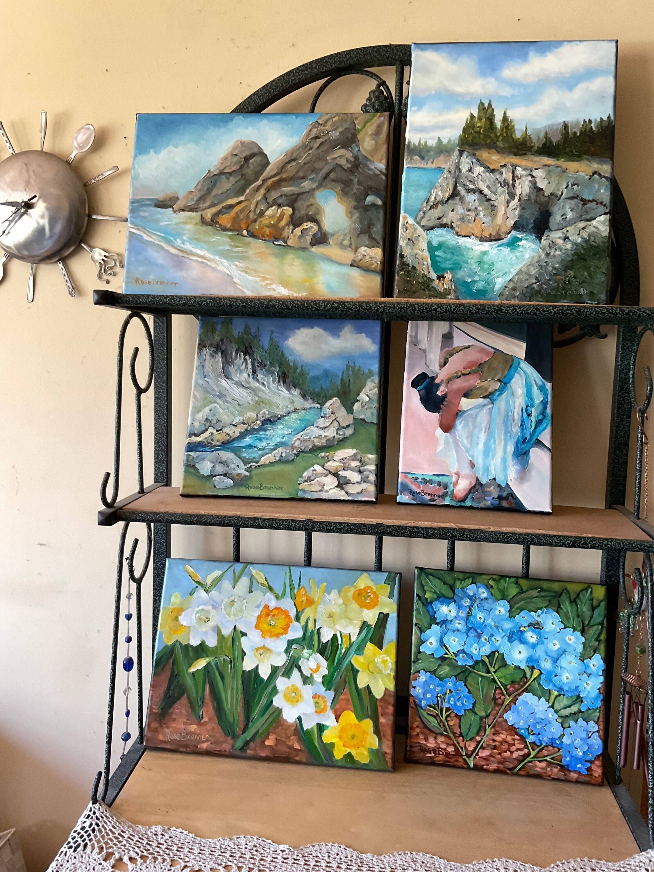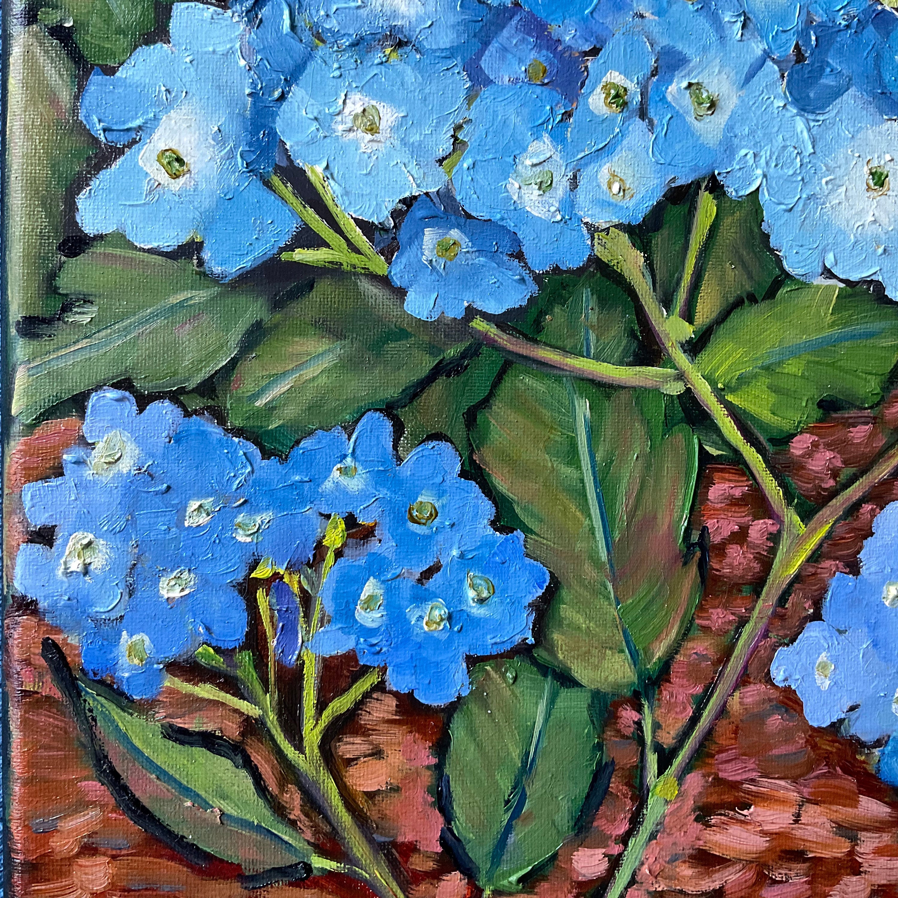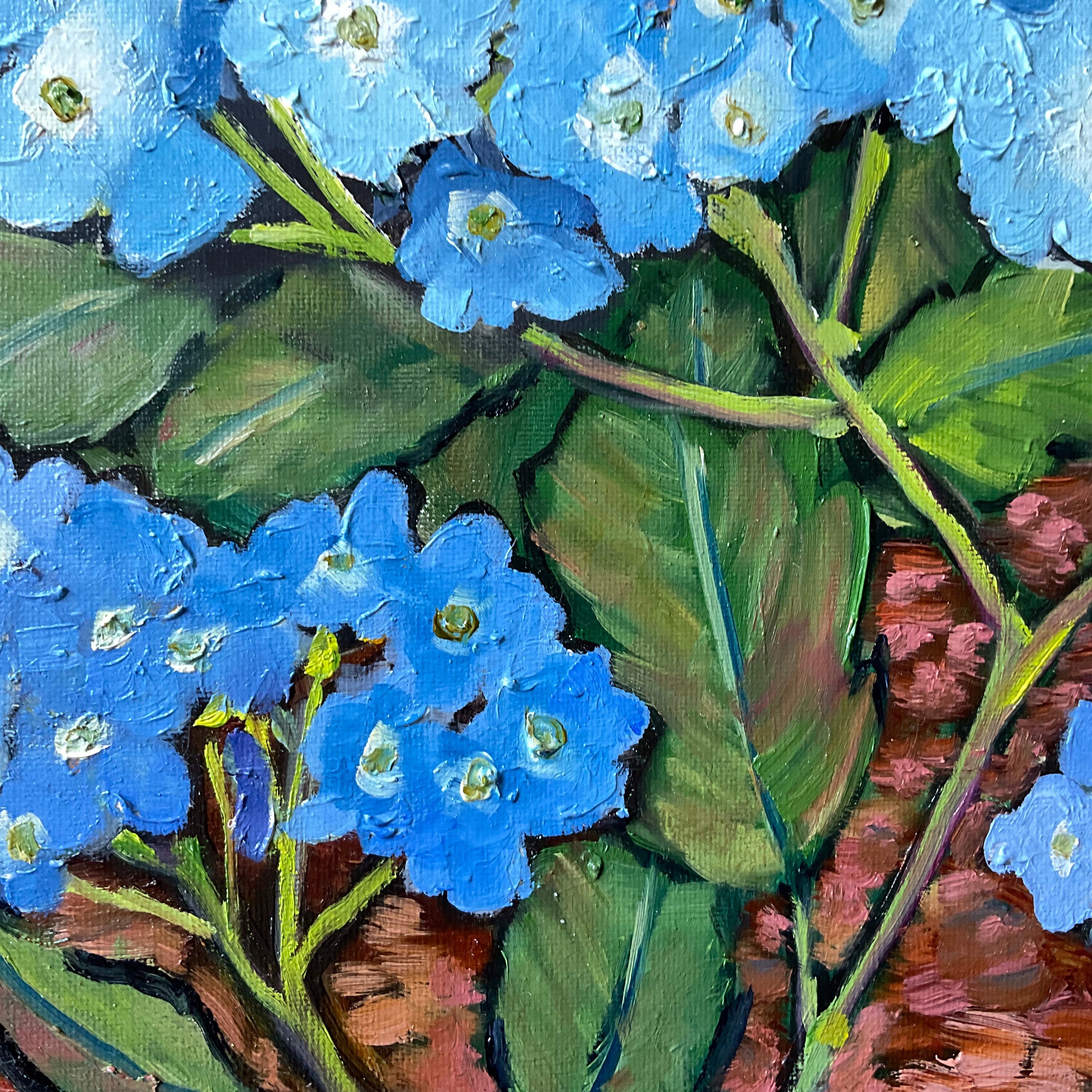 BLUE HYDRANGEA BUSH is an original 12" x 12" UNFRAMED oil painting on a quality canvas. This is a beautiful painting! This is a painting of a blue hydrangeas in dappled sunlight. It’s painted in the style of Vincent Van Gogh. Some of the flowers and leaves are lit by sunlight, and some are in the shade. This is a wonderful painting that will light up any room. It is painted on a high quality canvas. The paint is applied with bold strokes and the colors are striking.