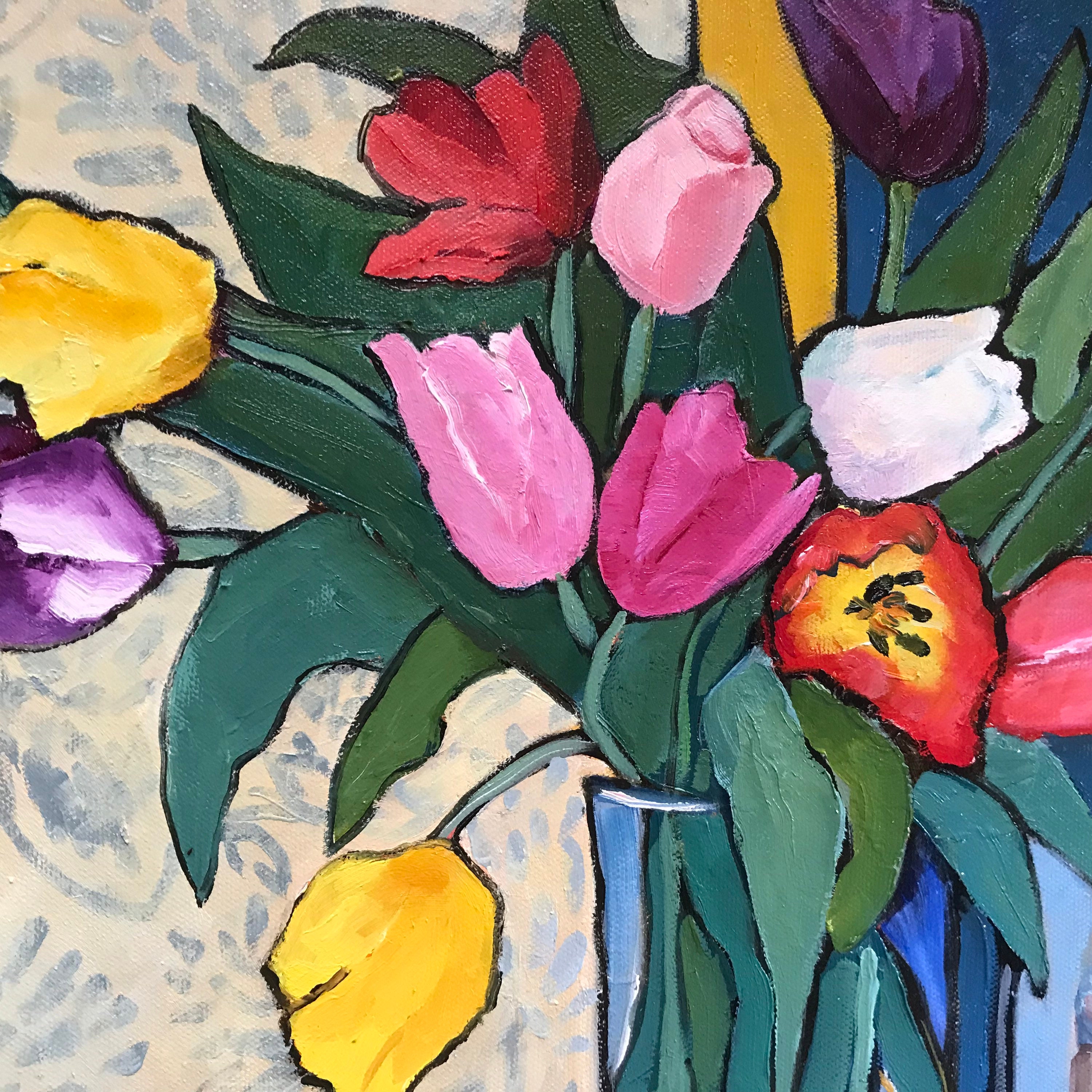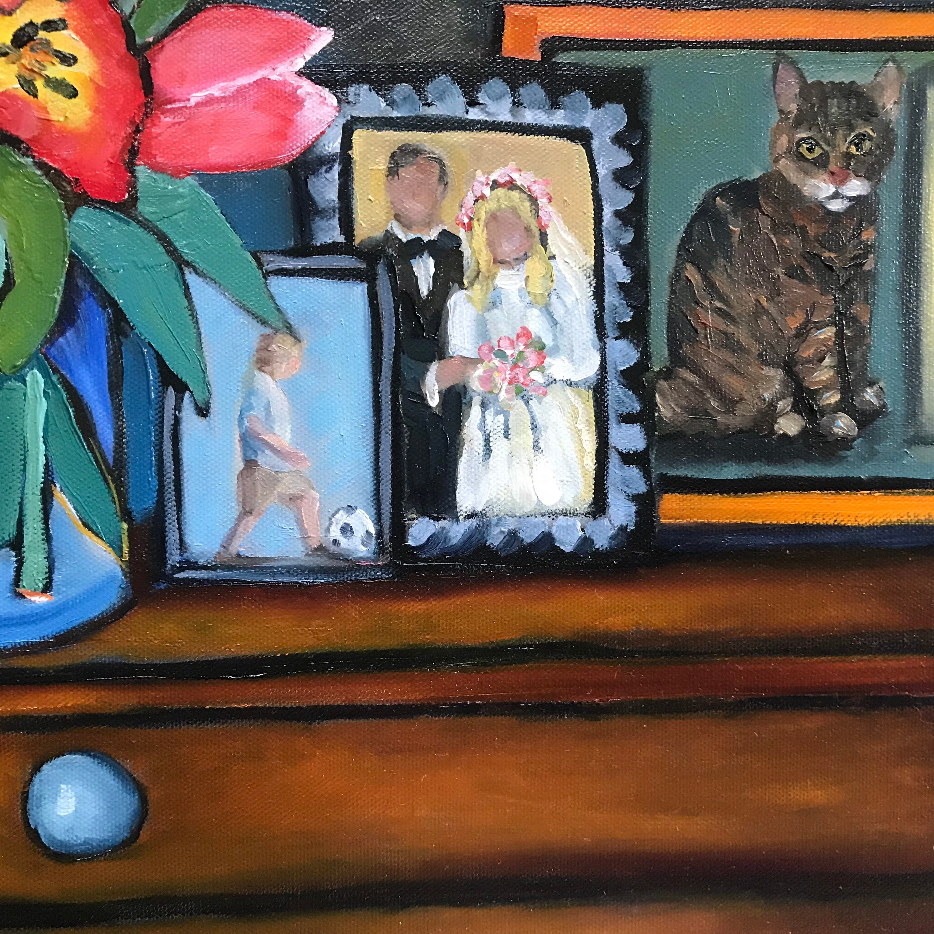 THE DRESSER is an original 20" x 20" oil painting on a gallery wrap canvas. This is an incredible painting! It is a bright scene of multi-colored tulips in a vase on the dresser. It’s my dresser. There are 4 pictures in frames on the dresser - a couple in their wedding outfits (my husband and I), a child playing soccer (our grandson), a cat (my daughters) and a large one of a dog. This painting will bathe any room you put it in with bright, colorful light. The colors are bright and vivid. It’s painted in the style of Van Gogh. The background wall has a pleasing wallpaper look.