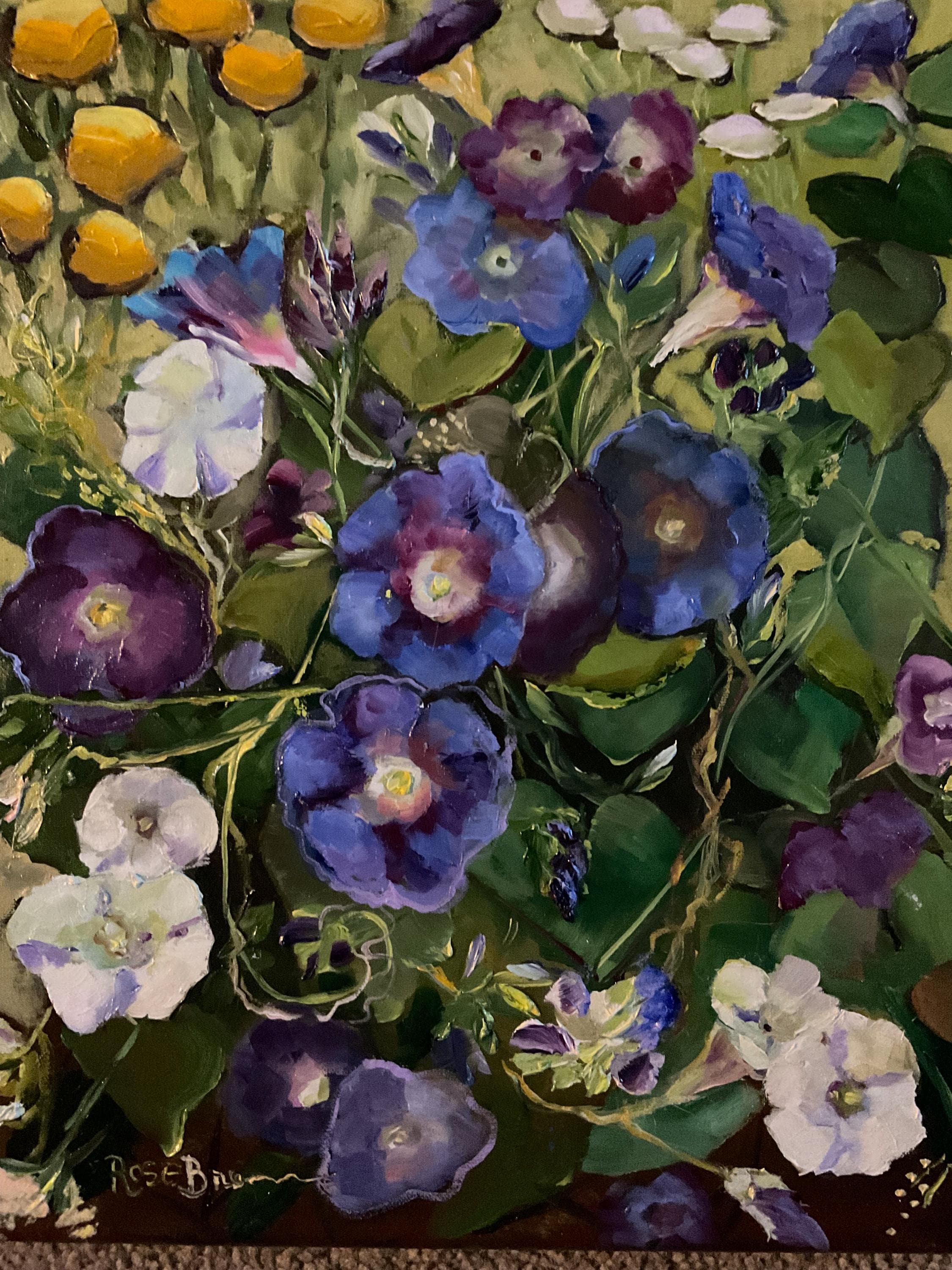MORNING GLORIES is an original 11” x 14” oil painting on a high quality canvas. The painting is a beautiful rendition of morning glories. I painted these from real life. I participated in a plein air event and got there in the early morning. The morning glories were opened in full bloom. I finished painting at noon because the morning glories had closed up for the day. The blues and violets of the flowers were so vivid . This is an impressionist painting with strong contrasts. It will enhance many color schemes. It will light up a room, especially if other objects pick up the bright pinks, blues or whites. The painting was done in strong vivid colors with thick paint. It’s painted in the style of Vincent Van Gogh.