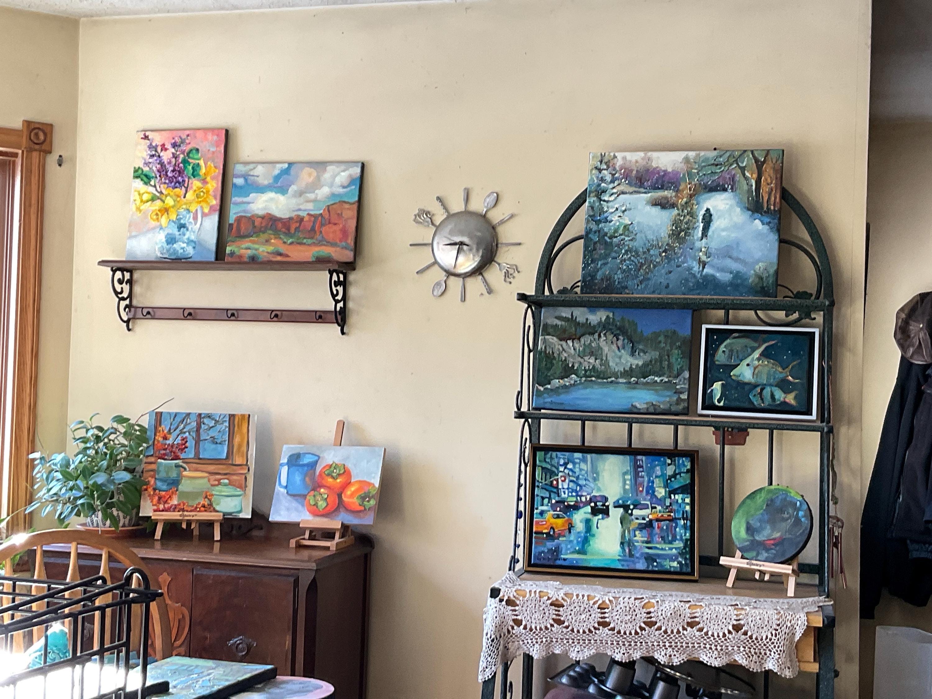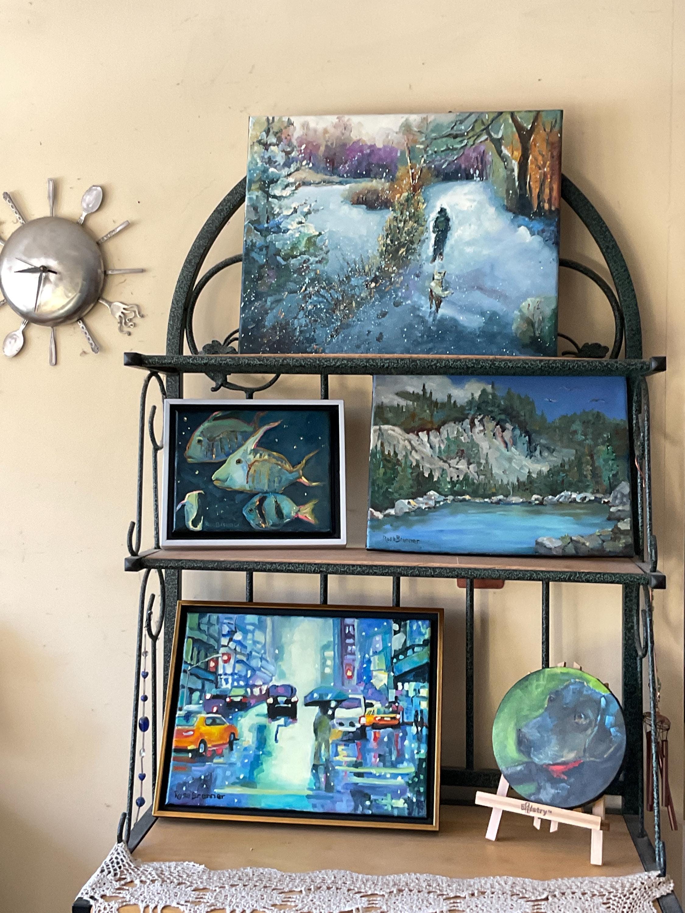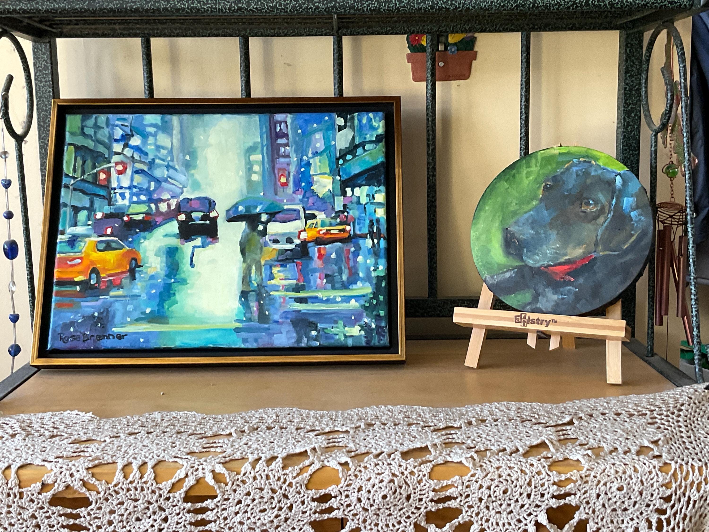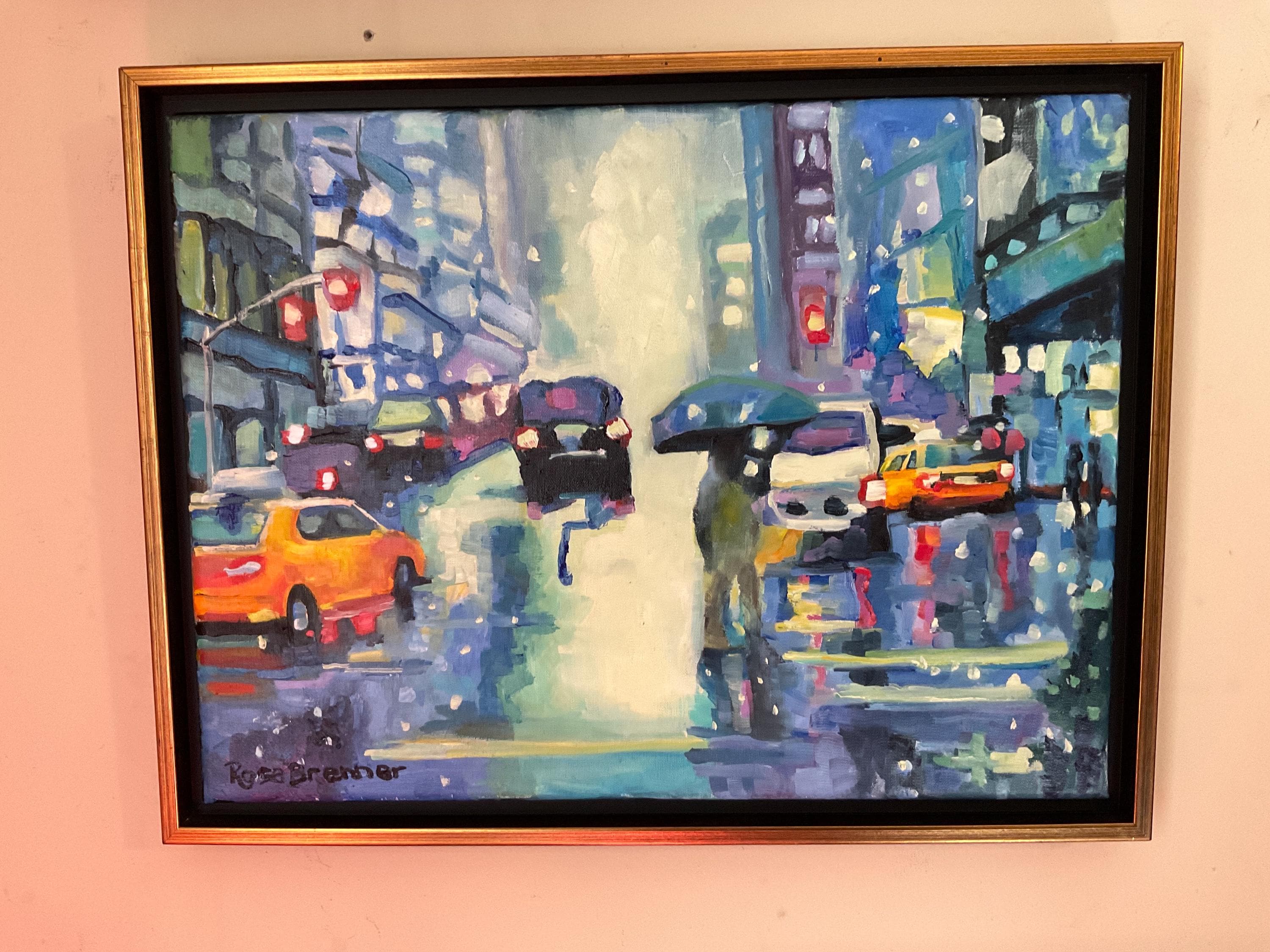 CITY SNOW SHOWERS is an original !2”x16” x 1” FRAMED oil painting on a high quality canvas. This is a painting of a person crossing a busy street with an umbrella to keep the snow off. There are cars whizzing by and taxis. The city buildings tower on the right and left of the person. The style is very impressionist and the colors are bold and vivid. This is a very pleasing city scene. it will come framed in the brass floater style frame shown in the photographs. it will be ready to hang.
