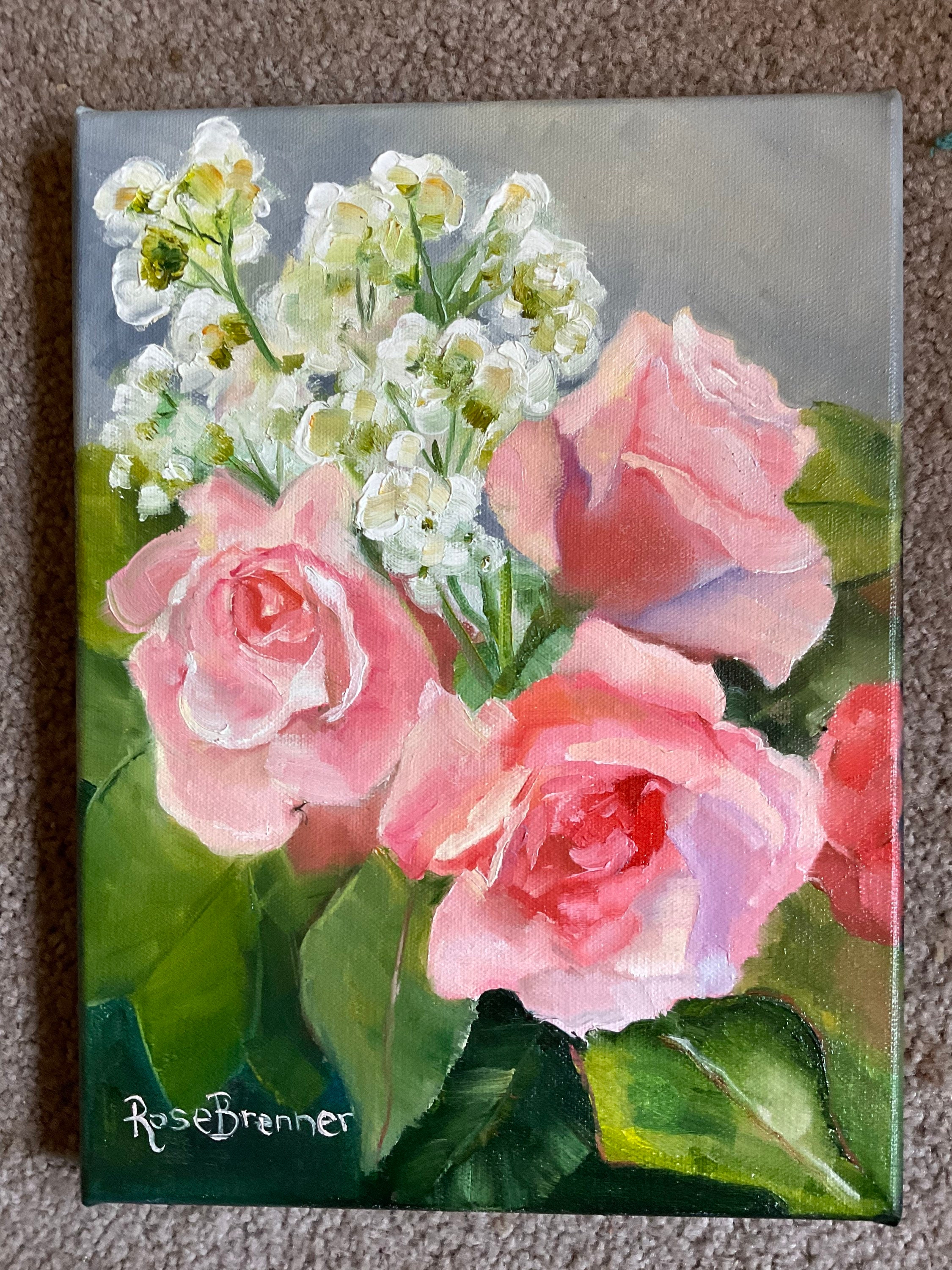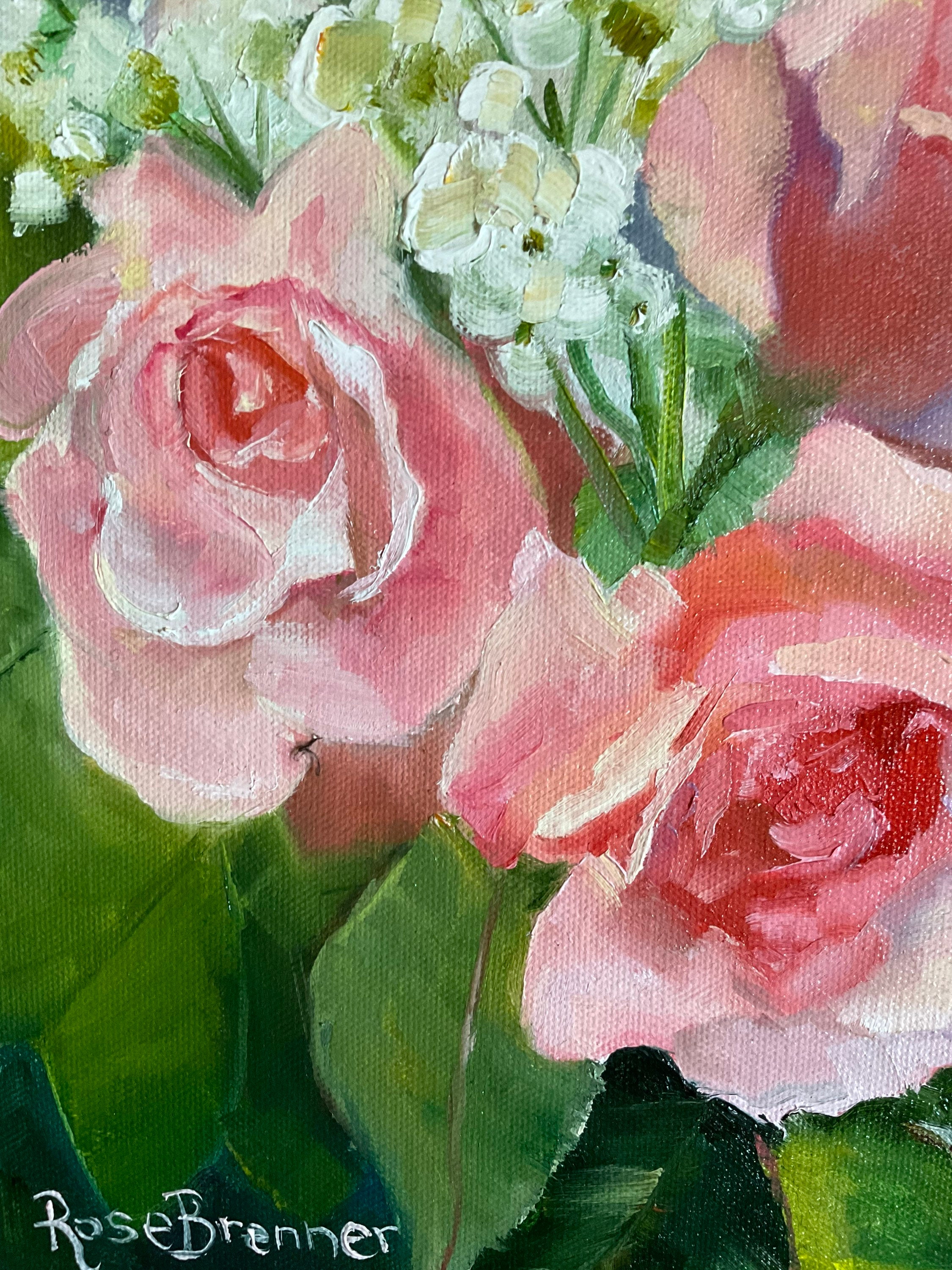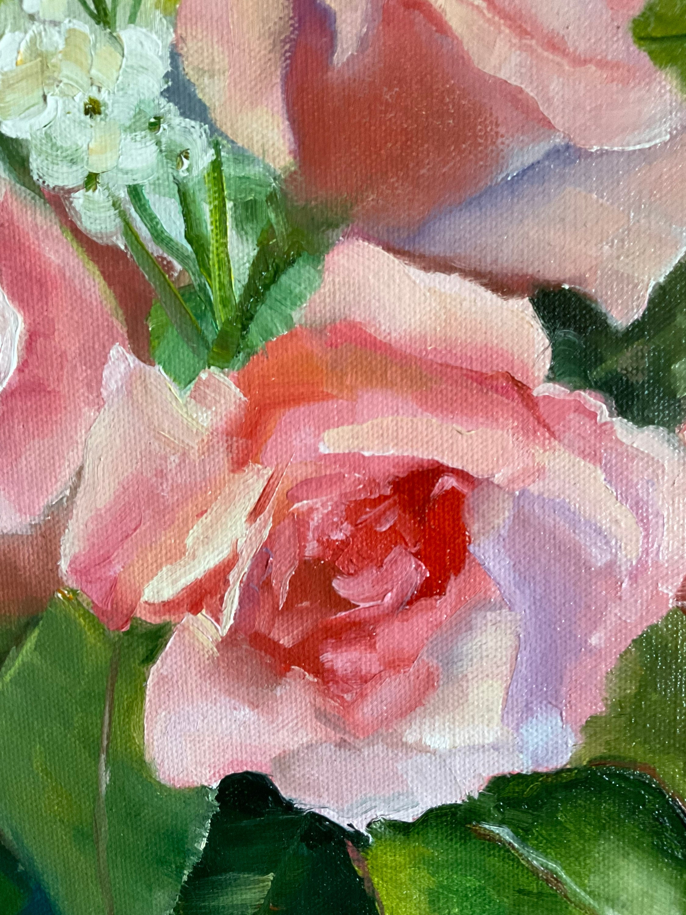 PINK ROSE BOUQUET is a 9”x12” oil painting on a high quality canvas. This is a wonderful painting of a bouquet of pink roses and baby’s breath. The paint is thick and luscious. The flowers seem to pop right off the canvas. The colors and detail in this painting are striking! It was painted with thick impasto strokes. The colors are bright and vivid.