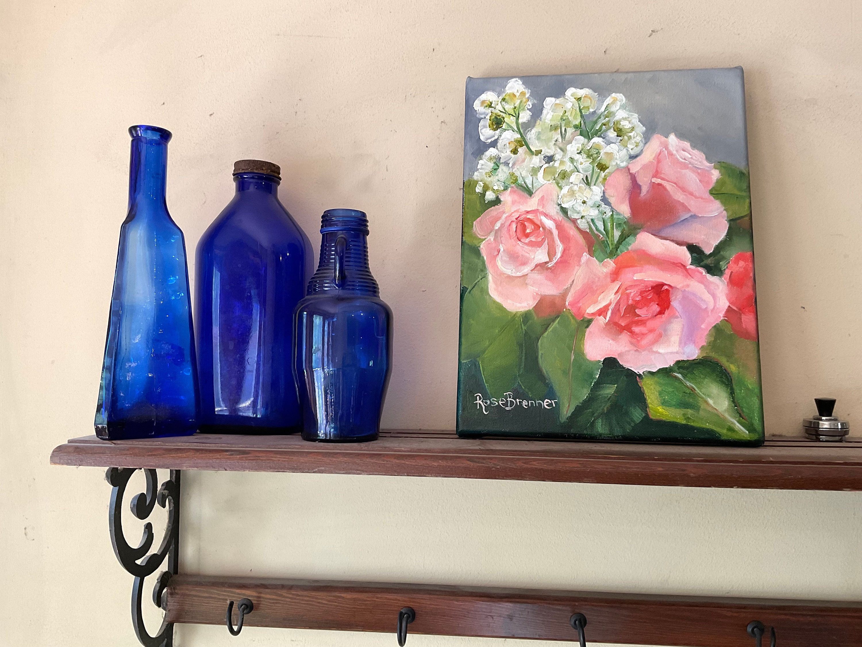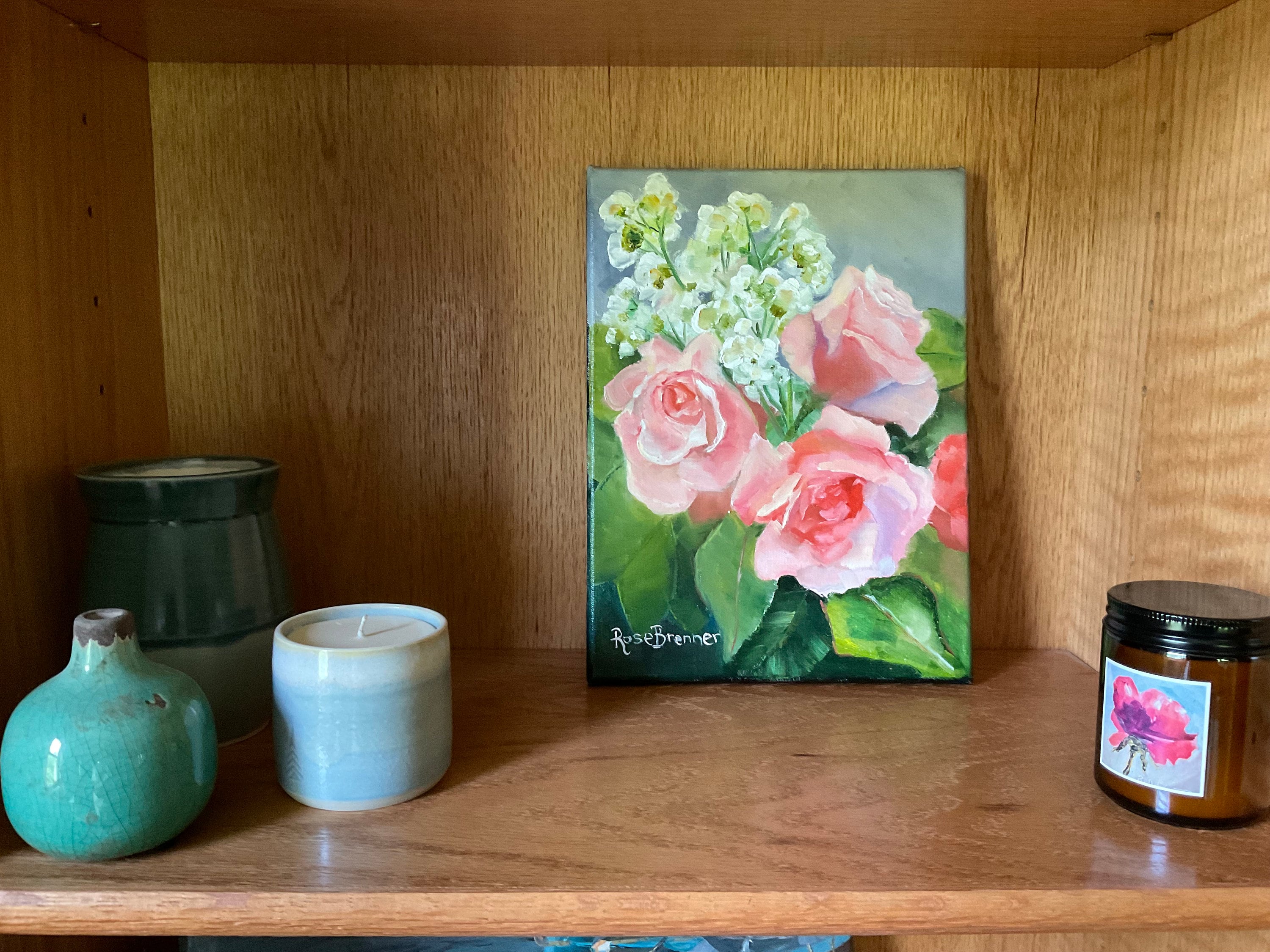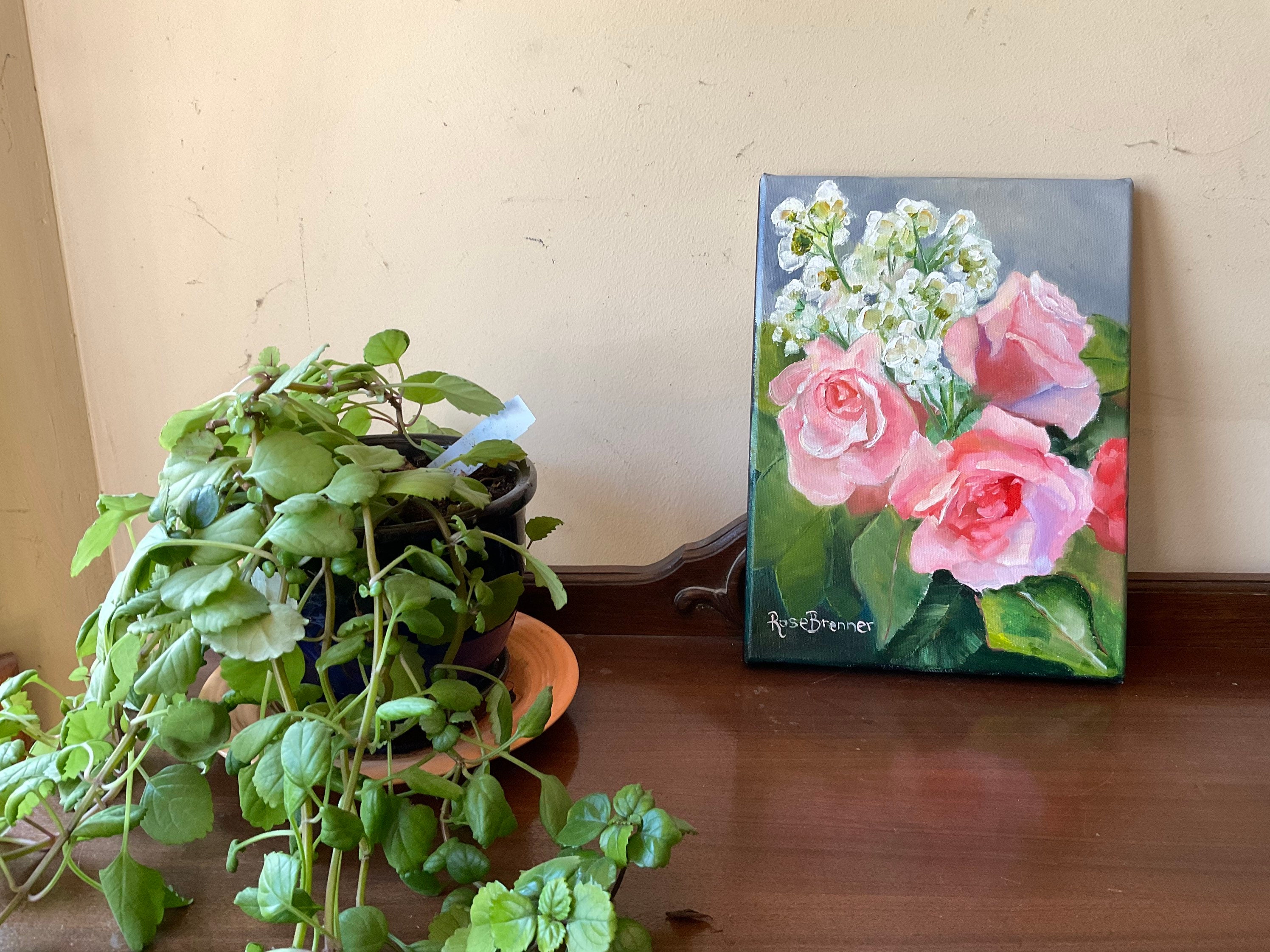 PINK ROSE BOUQUET is a 9”x12” oil painting on a high quality canvas. This is a wonderful painting of a bouquet of pink roses and baby’s breath. The paint is thick and luscious. The flowers seem to pop right off the canvas. The colors and detail in this painting are striking! It was painted with thick impasto strokes. The colors are bright and vivid.