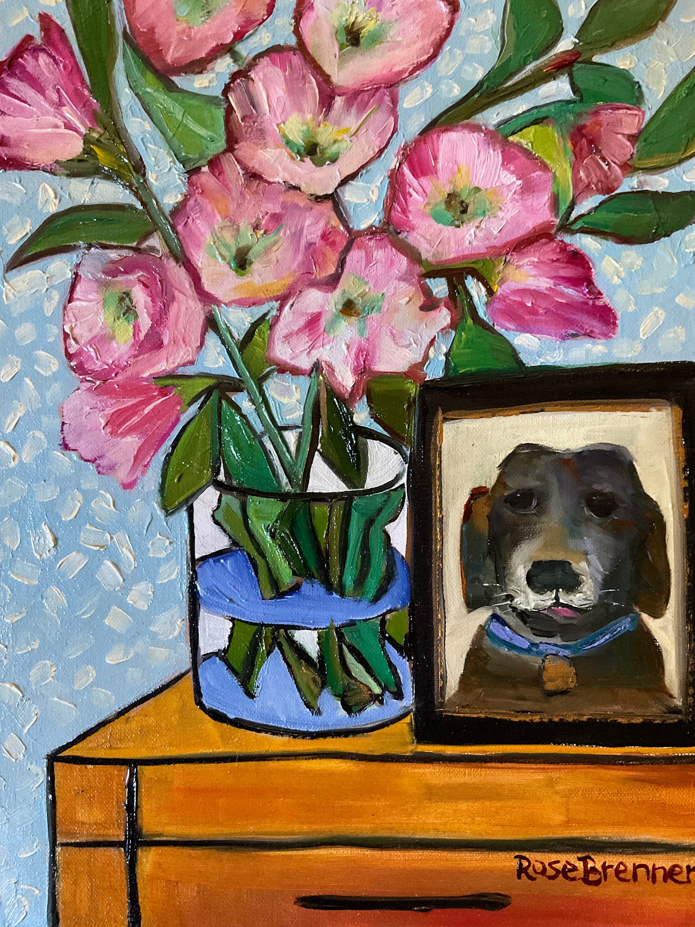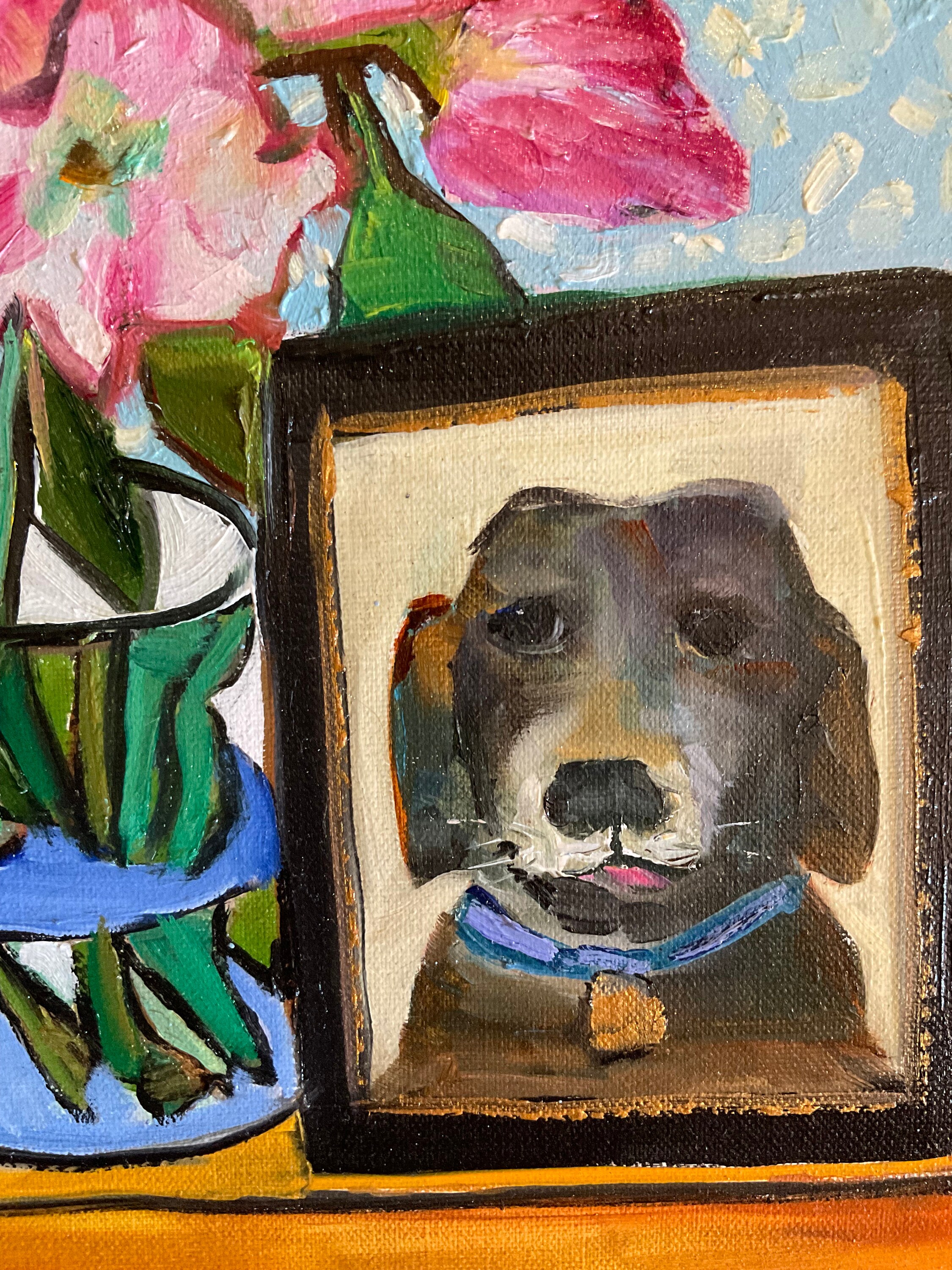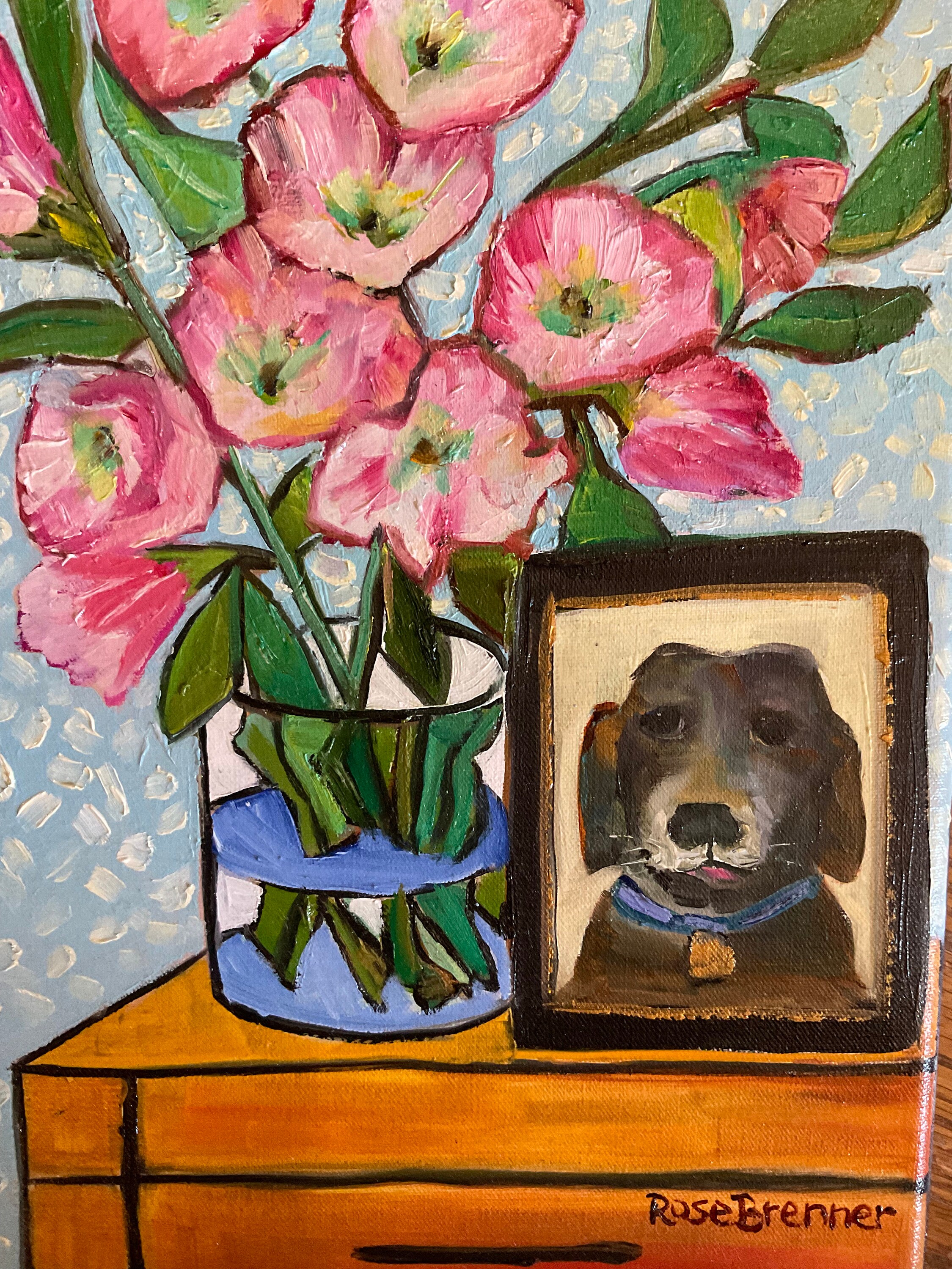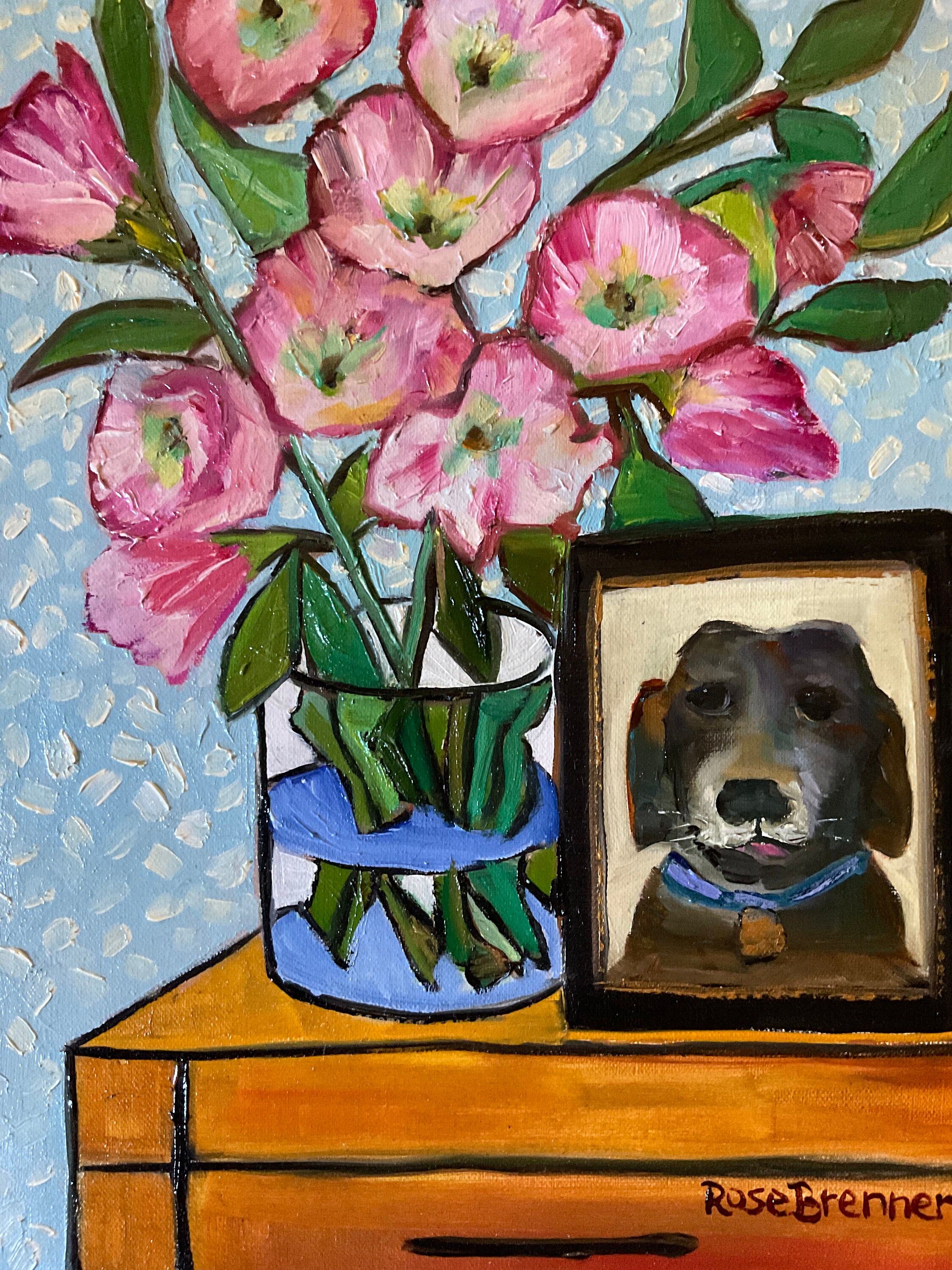 PICTURE OF PUP is an original 9”x12” oil painting on a gallery wrap canvas. This is an incredible painting! It is a bright scene of a hall table with a vase of pink flowers and a photo of a dog. The honey wood of the table looks real. The picture of the black dog is in a frame. the painting is done in a Van Gogh style. This painting will bathe any room you put it in with bright, colorful light. The colors are bright and vivid. It’s painted in the style of Van Gogh. The background wall has a pleasing wallpaper look.