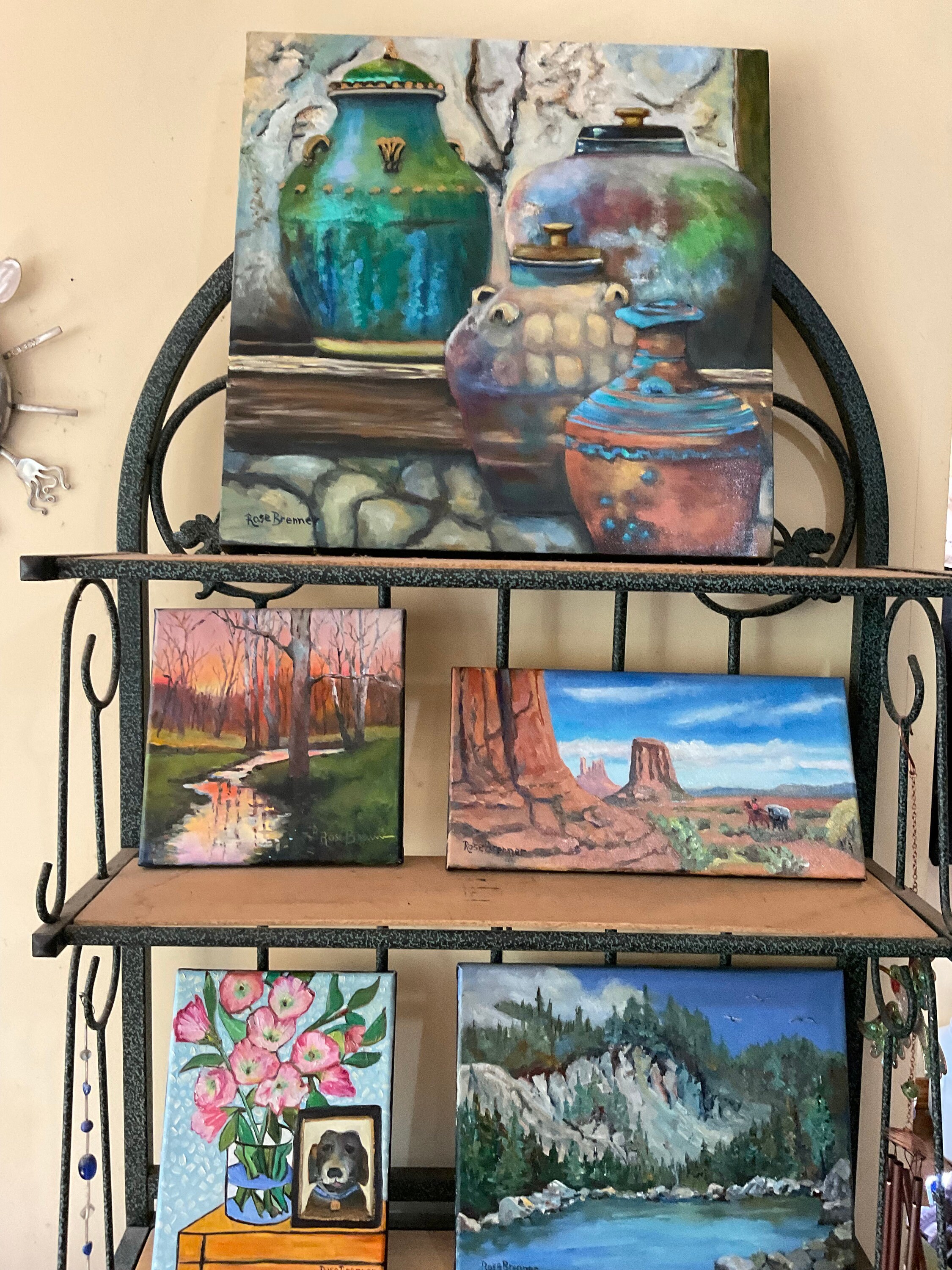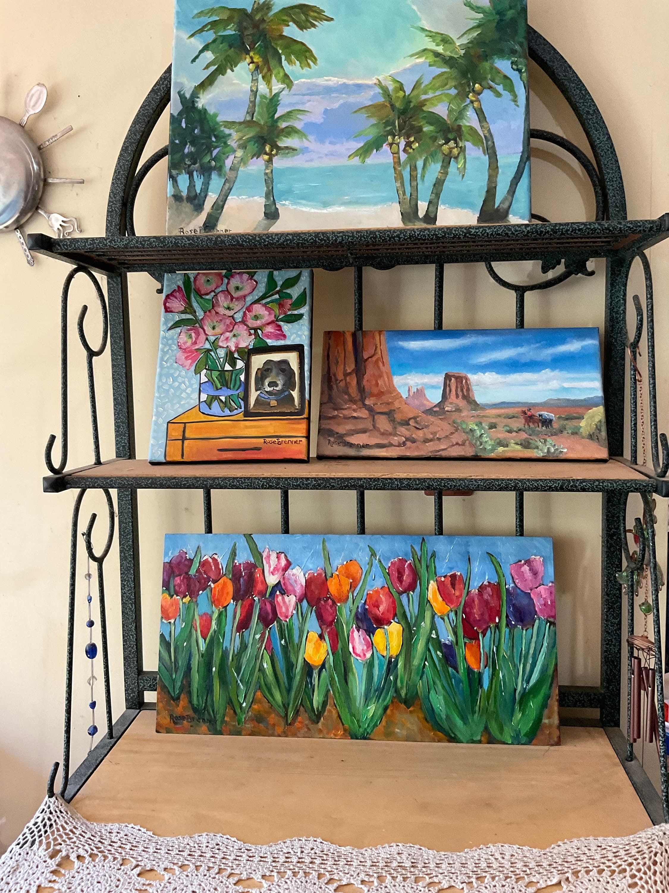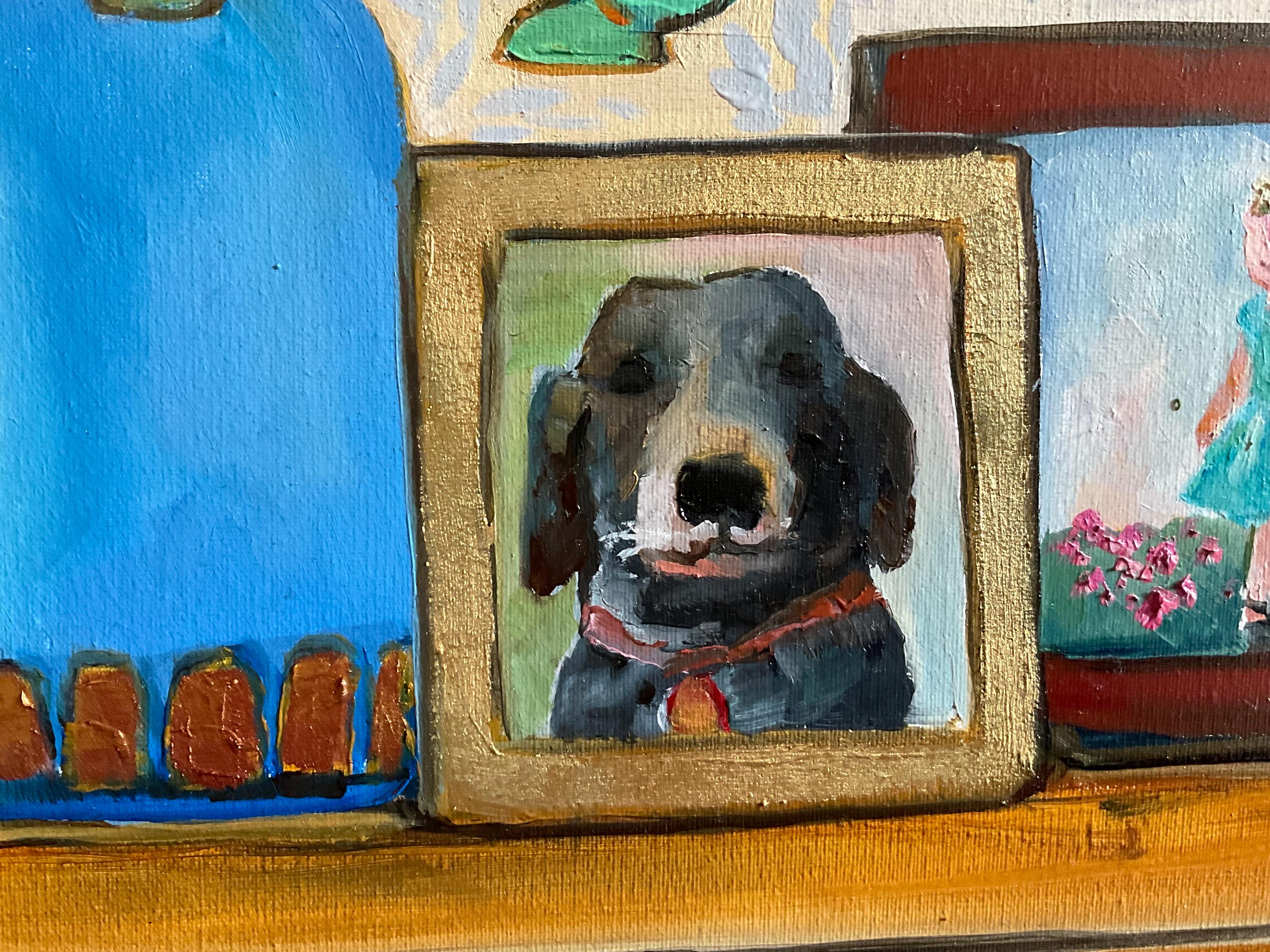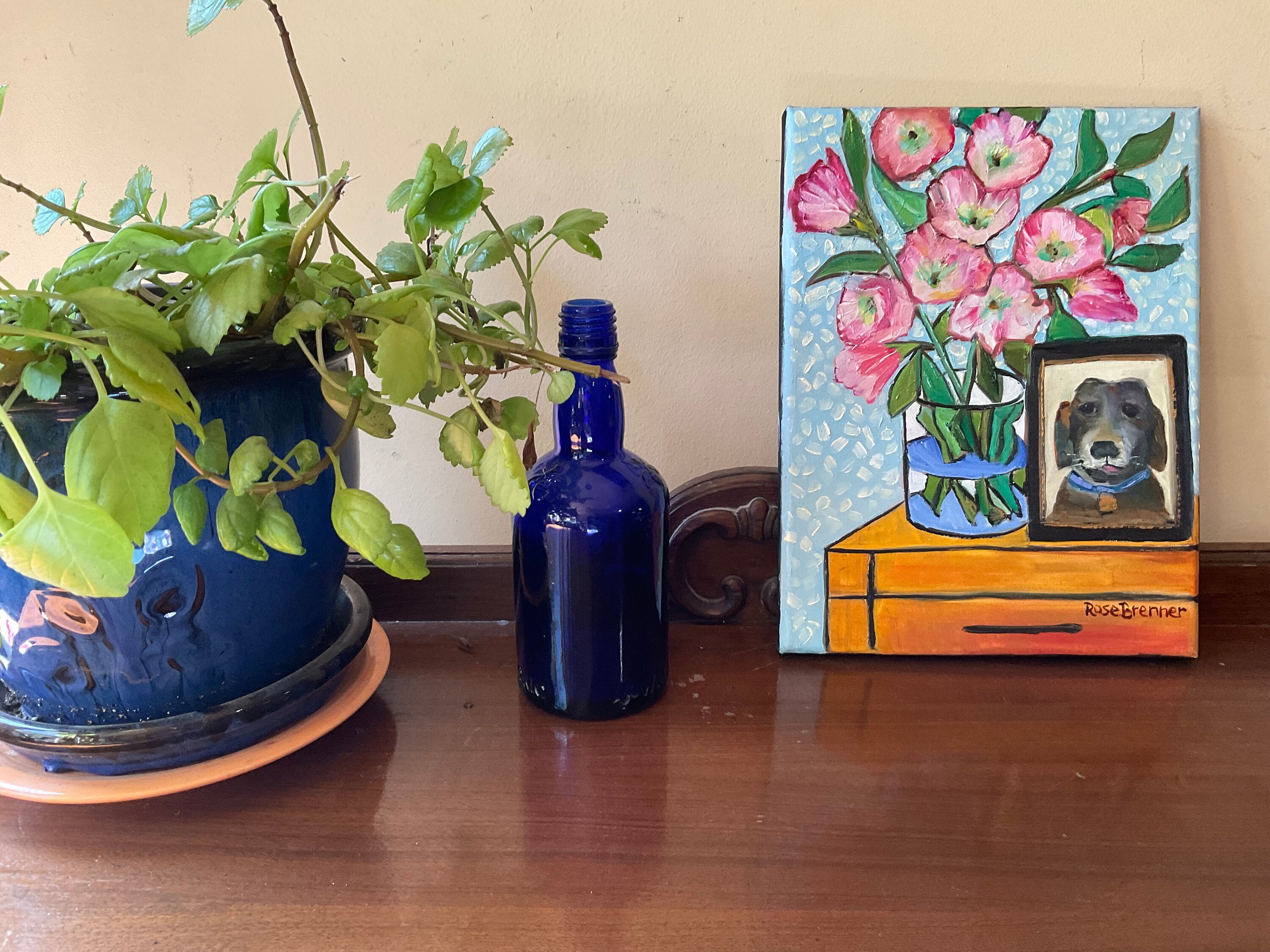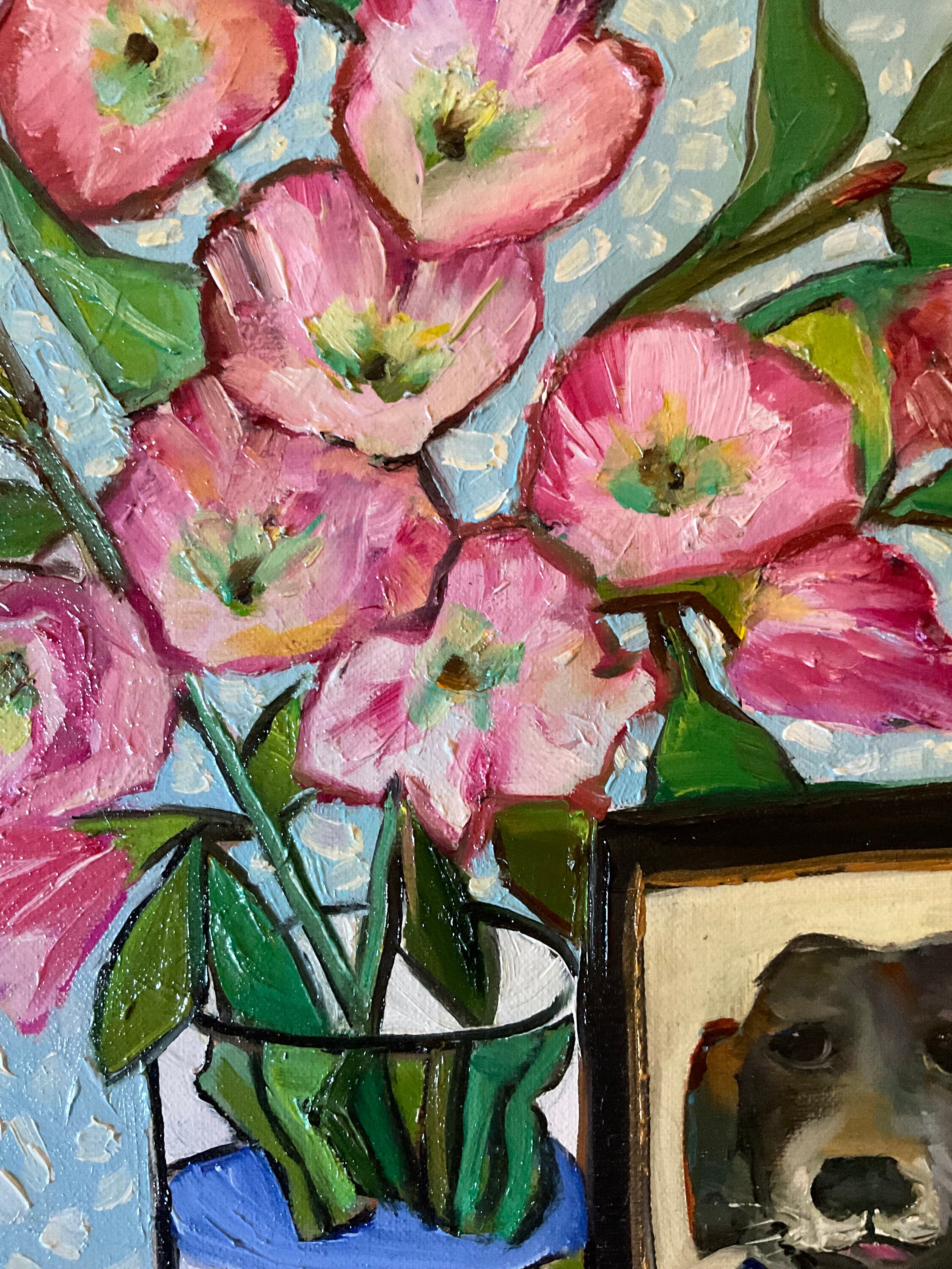 PICTURE OF PUP is an original 9”x12” oil painting on a gallery wrap canvas. This is an incredible painting! It is a bright scene of a hall table with a vase of pink flowers and a photo of a dog. The honey wood of the table looks real. The picture of the black dog is in a frame. the painting is done in a Van Gogh style. This painting will bathe any room you put it in with bright, colorful light. The colors are bright and vivid. It’s painted in the style of Van Gogh. The background wall has a pleasing wallpaper look.