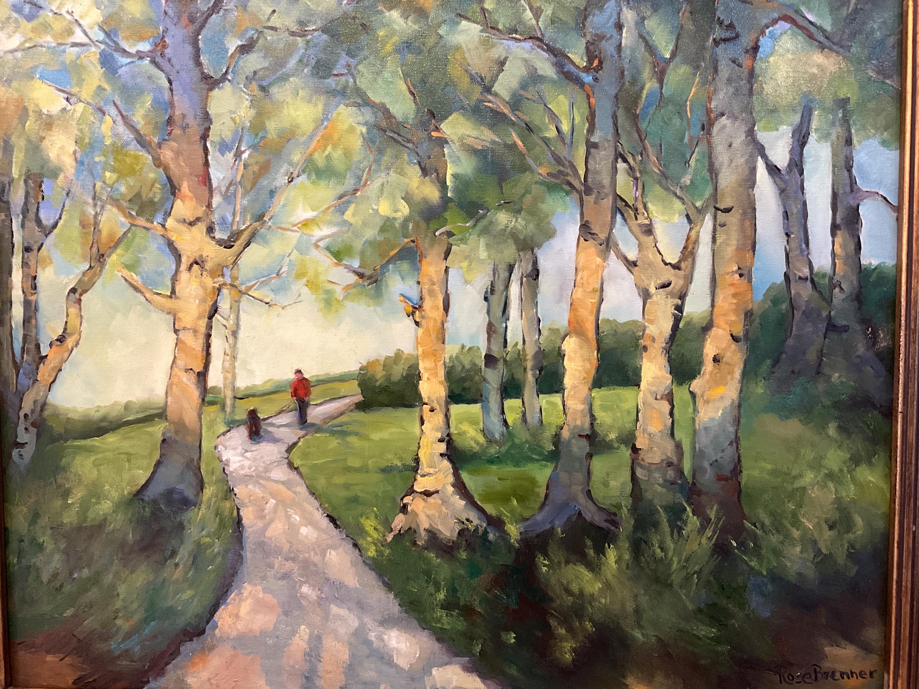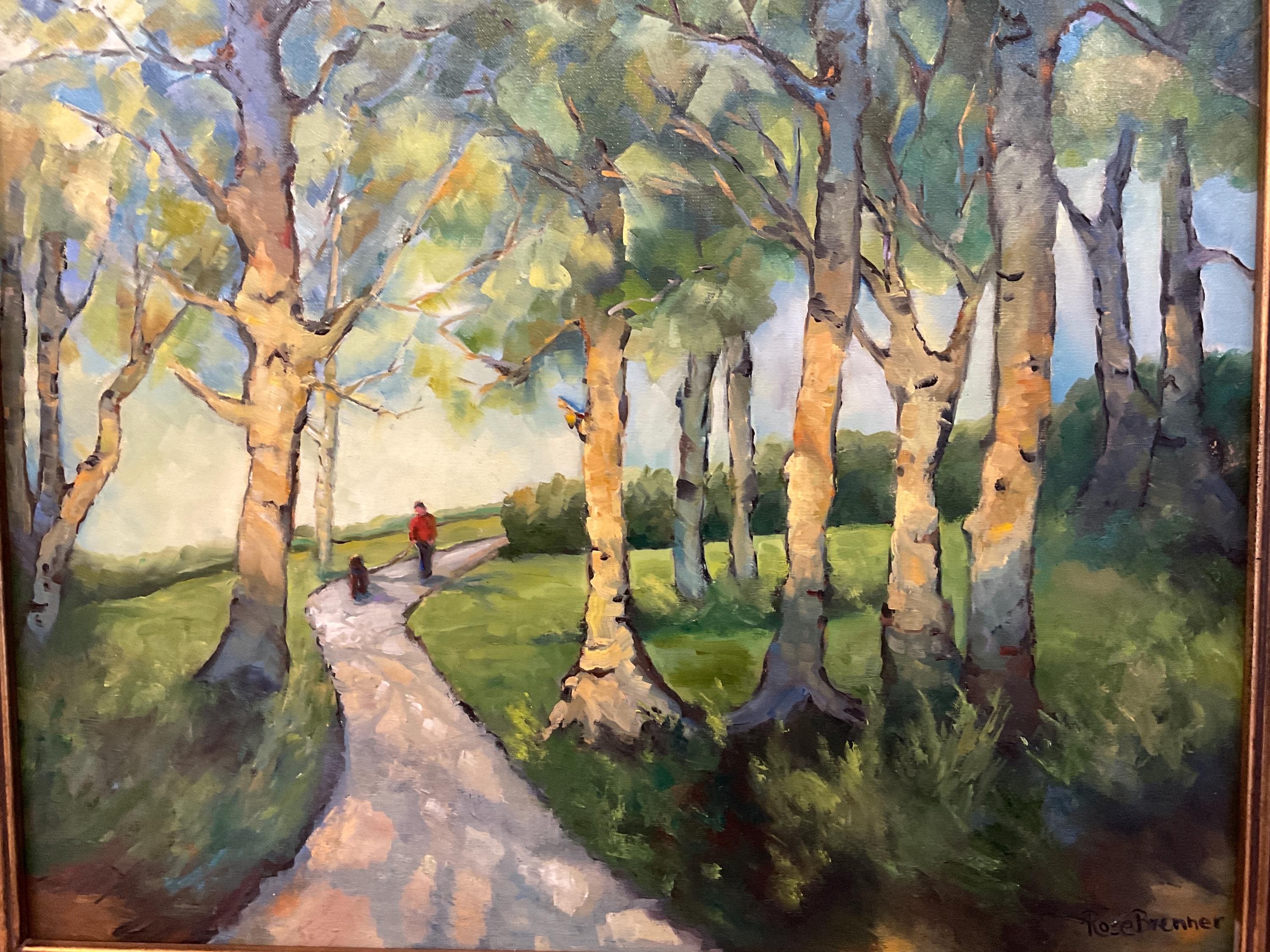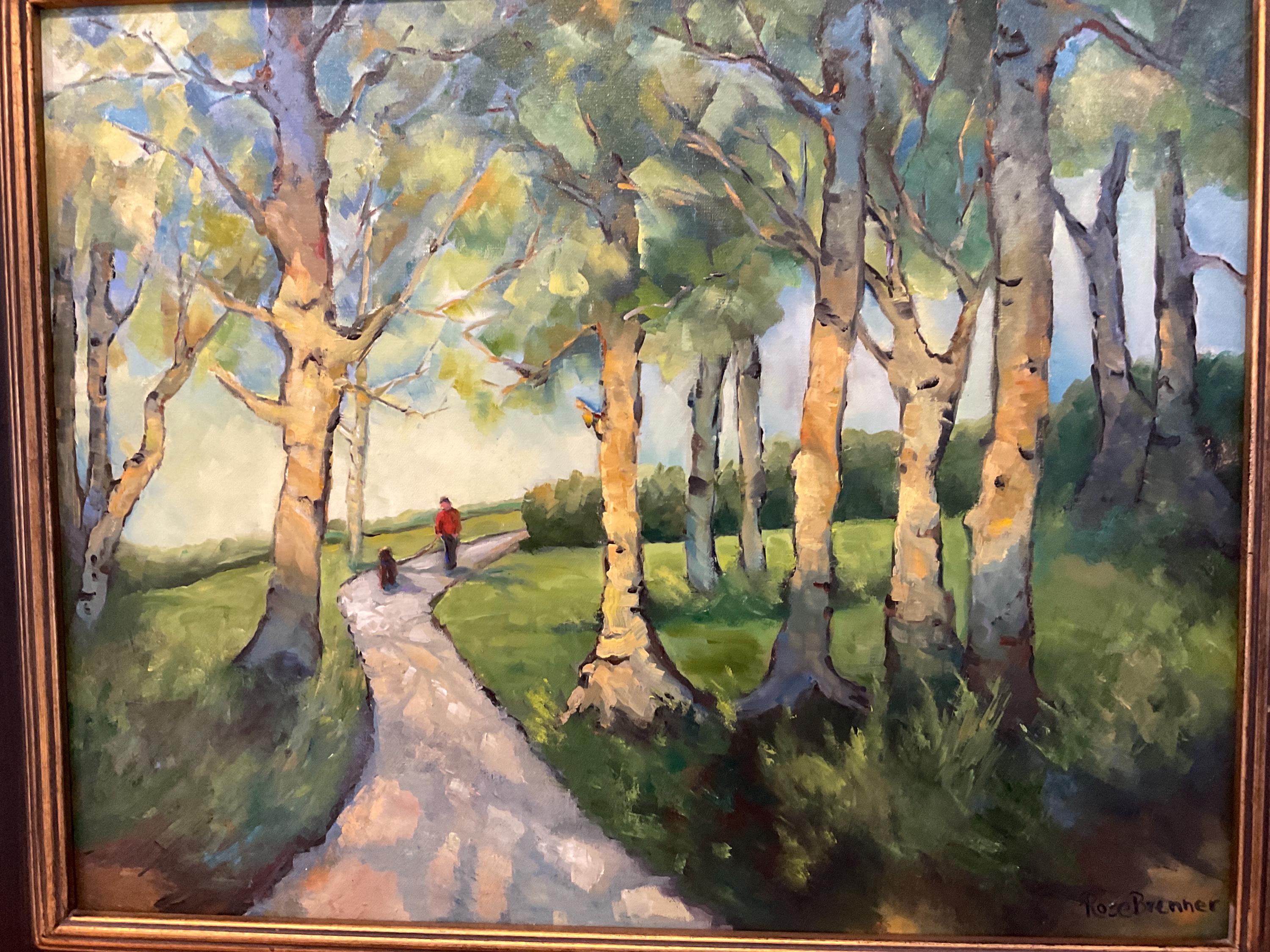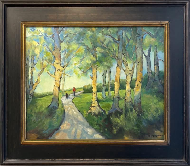 EARLY MORNING WALK is an original 16”x20” oil painting on a high quality canvas panel. This is an incredible painting! It won 2nd place in the Summertime contest at the prestigious art gallery in New Harmony, Indiana. New Harmony is a famous art colony. It is a bright, colorful scene of a park in the early morning, with the sun shining through the trees. A person and a dog are walking on the trail. It’s painted in the style of Vincent Van Gogh. I was so inspired, I’ve painted several in his style since.