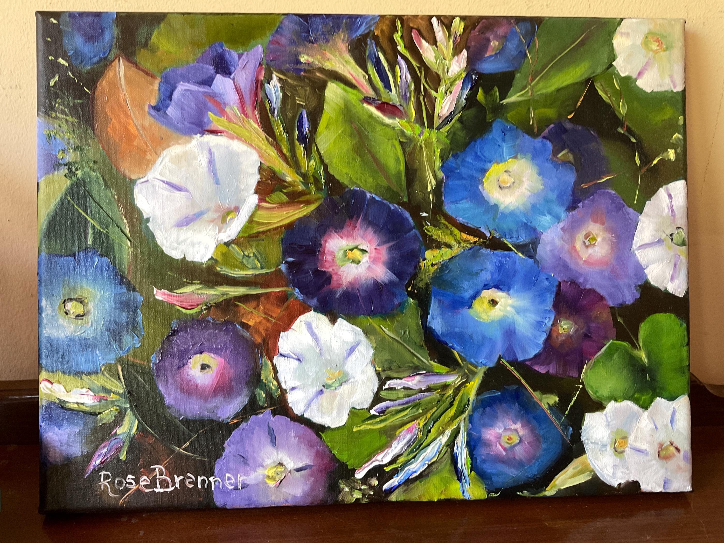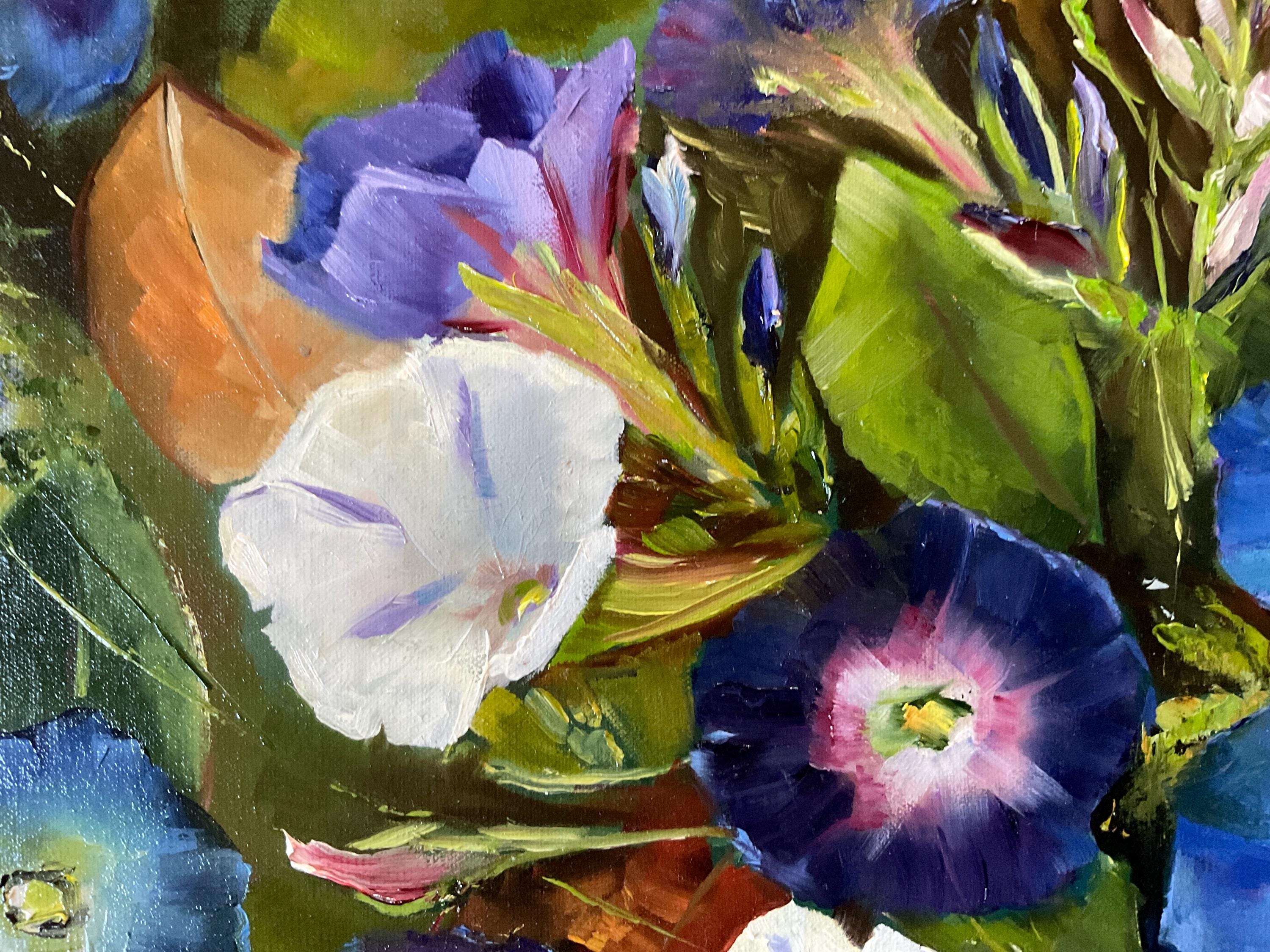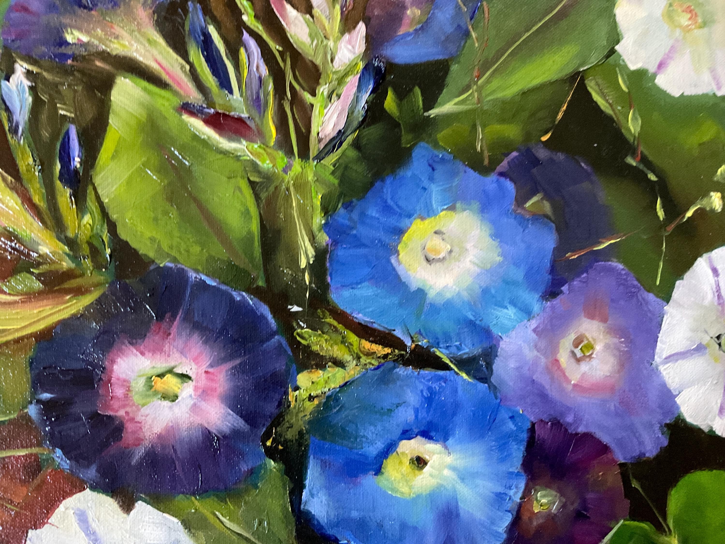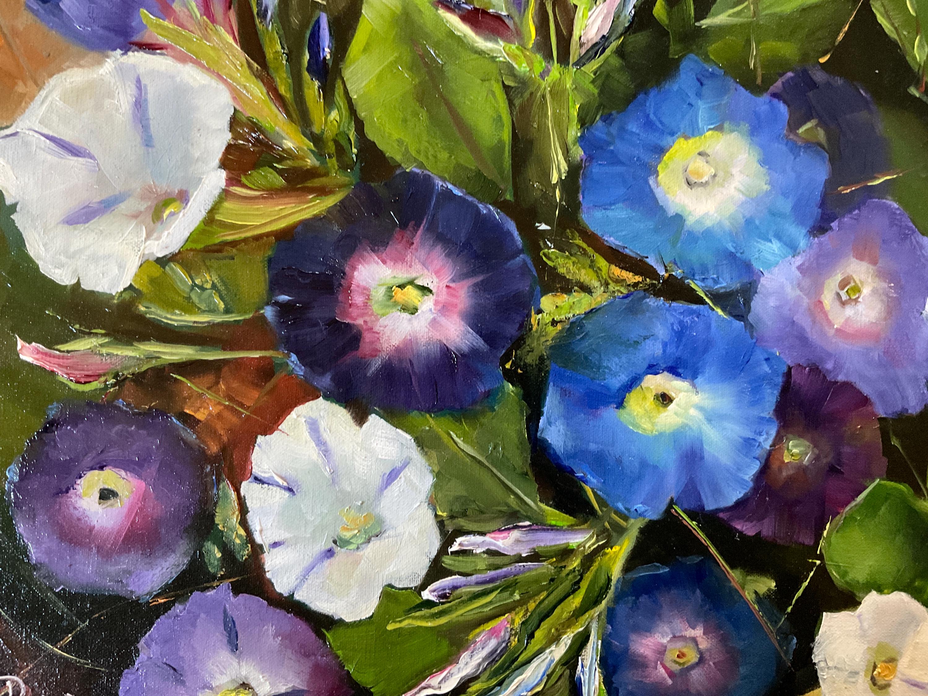 MORNING GLORIES is an original 12”x16” oil painting on a high quality canvas. The painting is a beautiful rendition of morning glories. I painted these from real life. I participated in a plein air event and got there in the early morning. The morning glories were opened in full bloom. I finished painting at noon because the morning glories had closed up for the day. The blues and violets of the flowers were so vivid . This is an impressionist painting with strong contrasts. It will enhance many color schemes. It will light up a room, especially if other objects pick up the bright violets, blues or whites. The painting was done in strong vivid colors with thick paint. It’s painted in the style of Vincent Van Gogh.