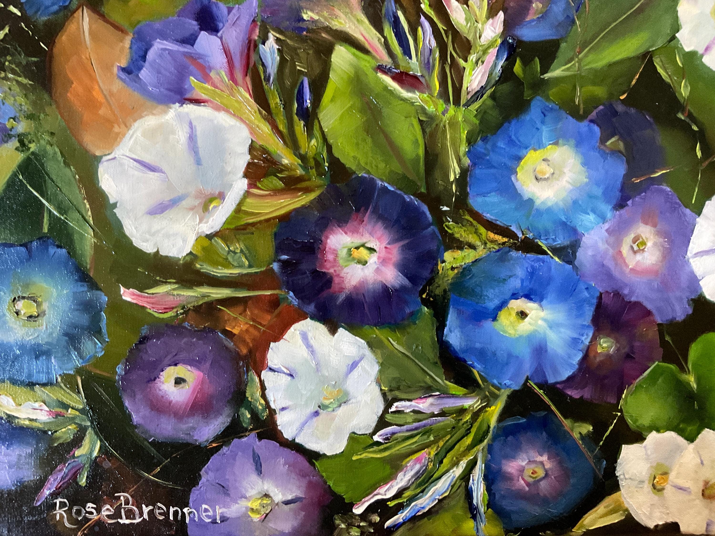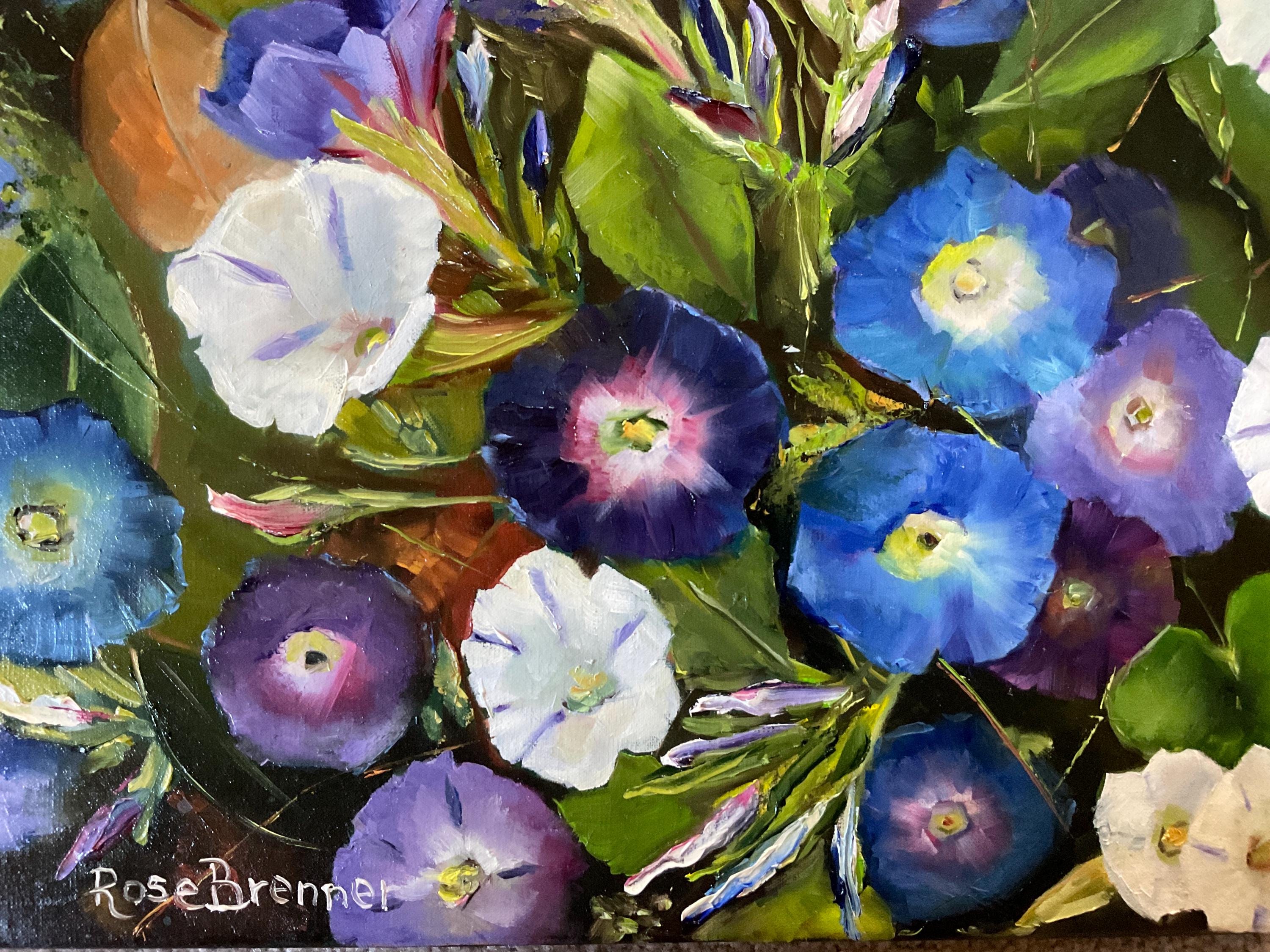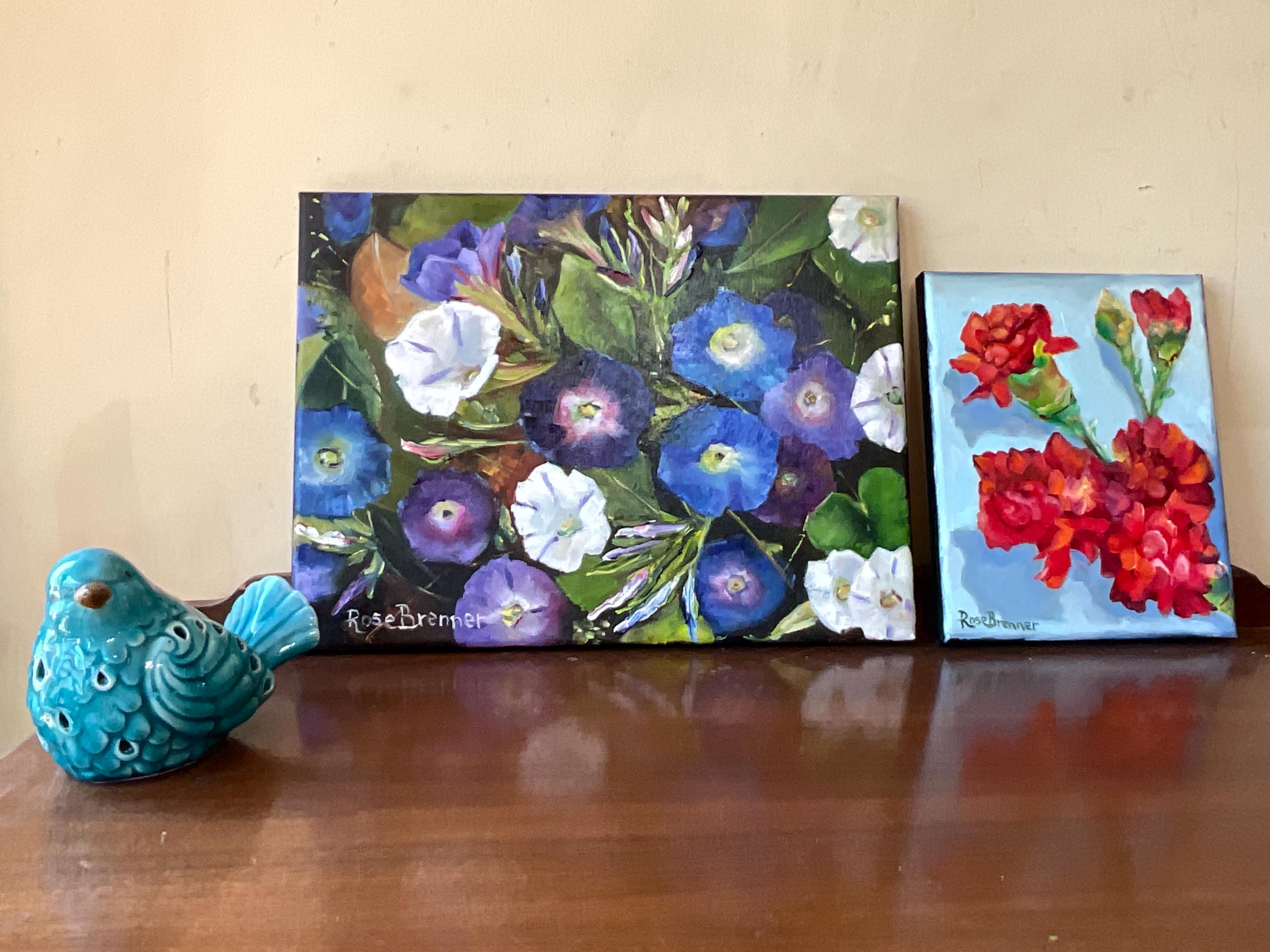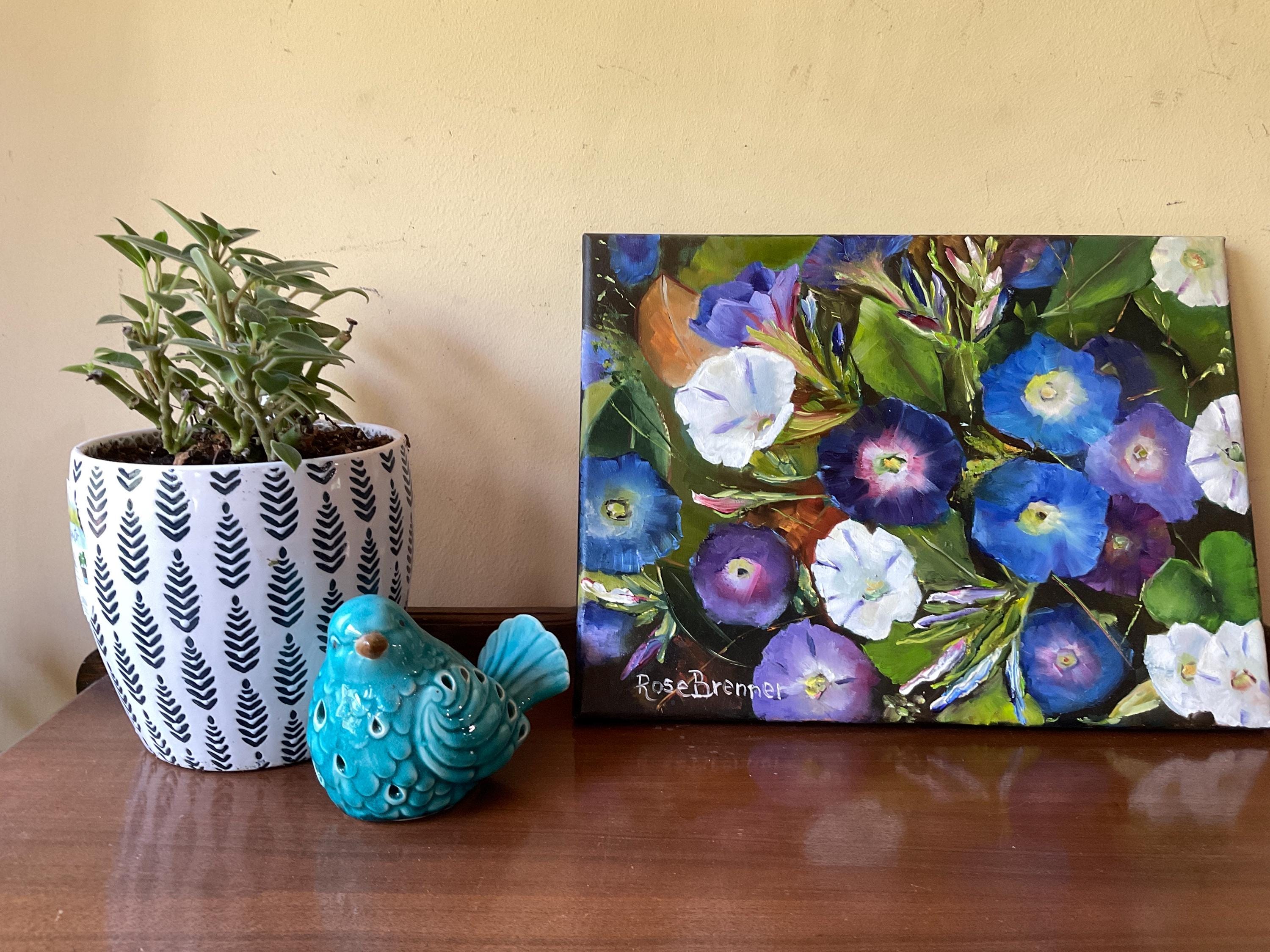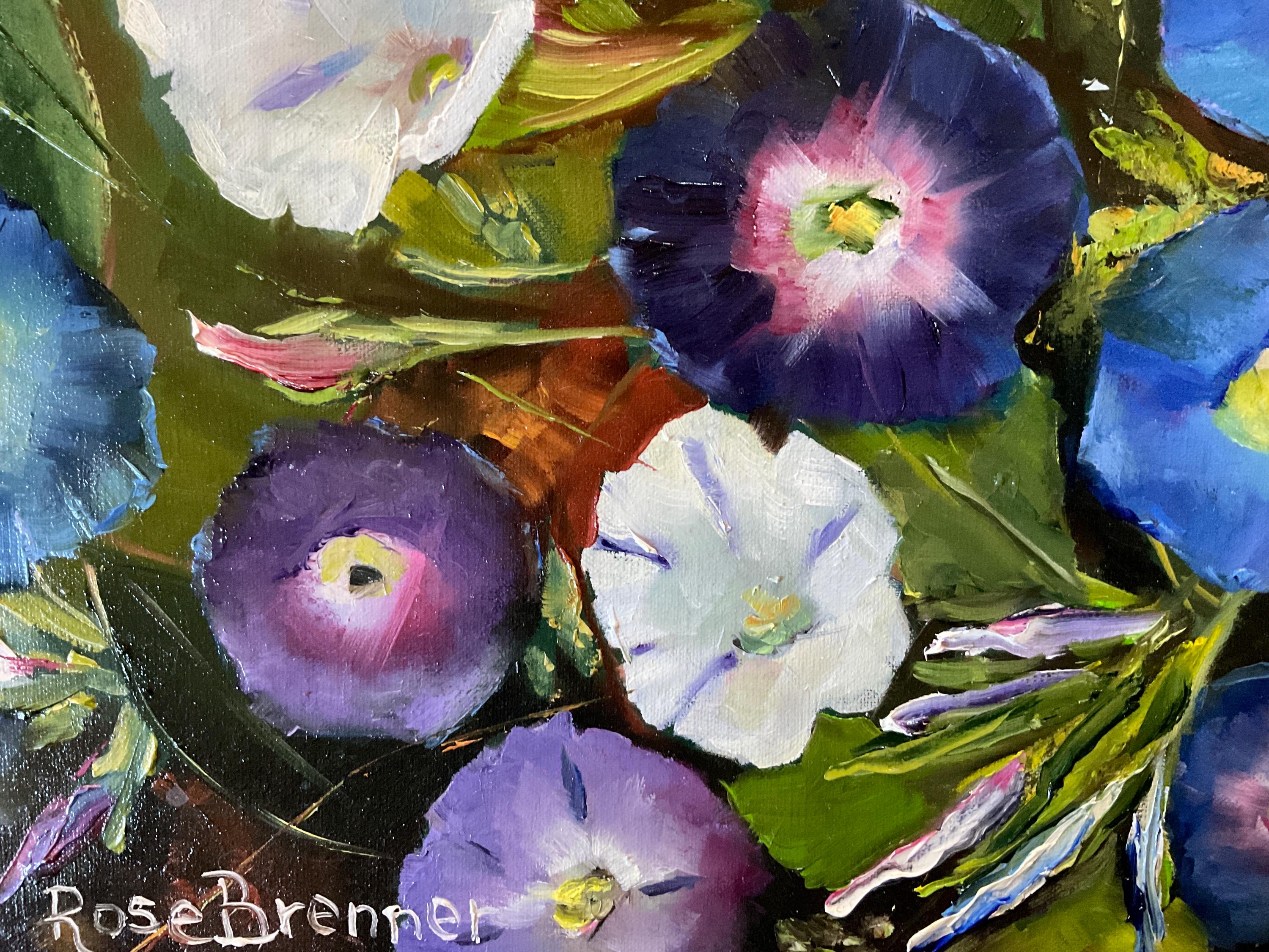 MORNING GLORIES is an original 12”x16” oil painting on a high quality canvas. The painting is a beautiful rendition of morning glories. I painted these from real life. I participated in a plein air event and got there in the early morning. The morning glories were opened in full bloom. I finished painting at noon because the morning glories had closed up for the day. The blues and violets of the flowers were so vivid . This is an impressionist painting with strong contrasts. It will enhance many color schemes. It will light up a room, especially if other objects pick up the bright violets, blues or whites. The painting was done in strong vivid colors with thick paint. It’s painted in the style of Vincent Van Gogh.