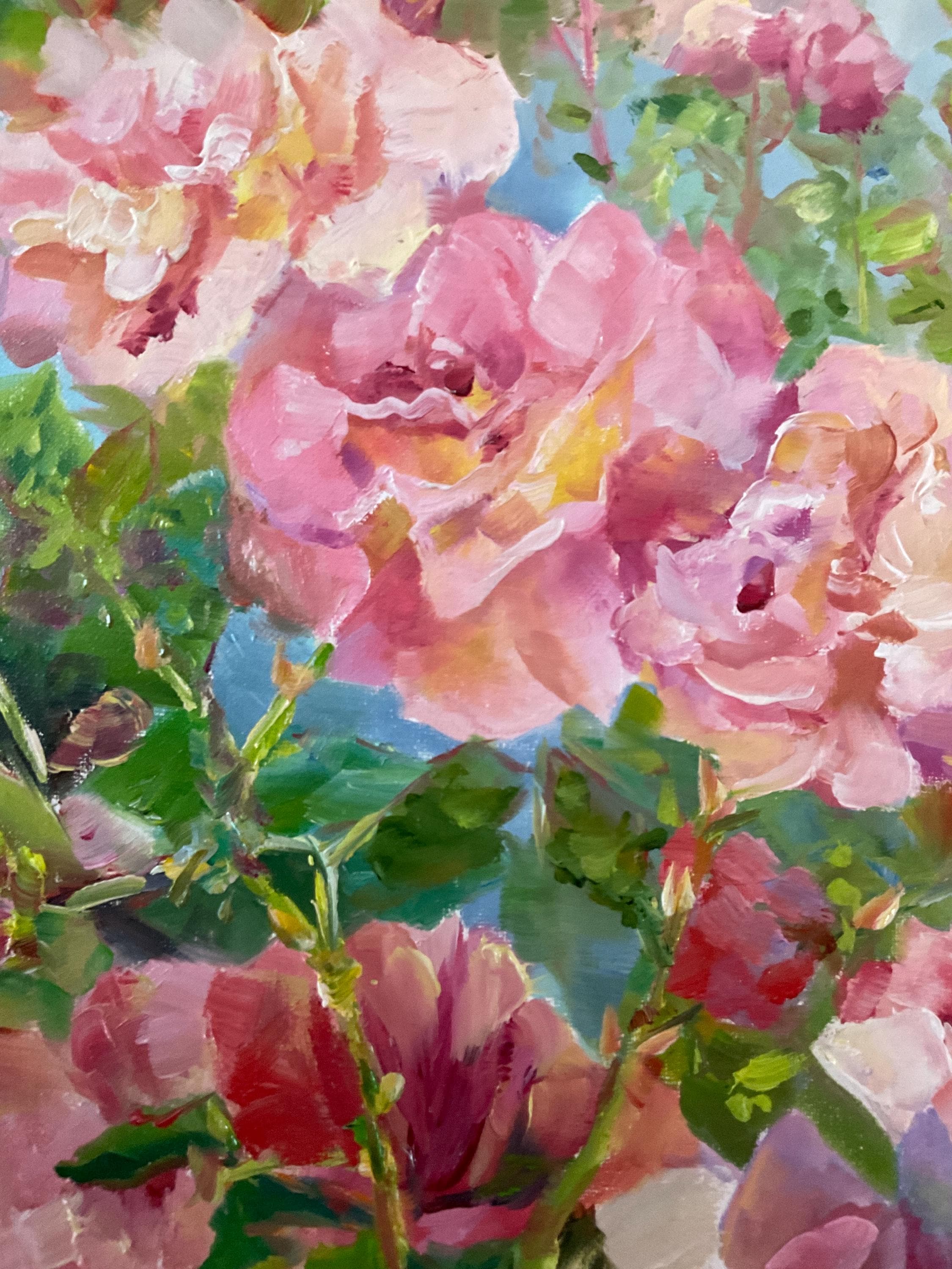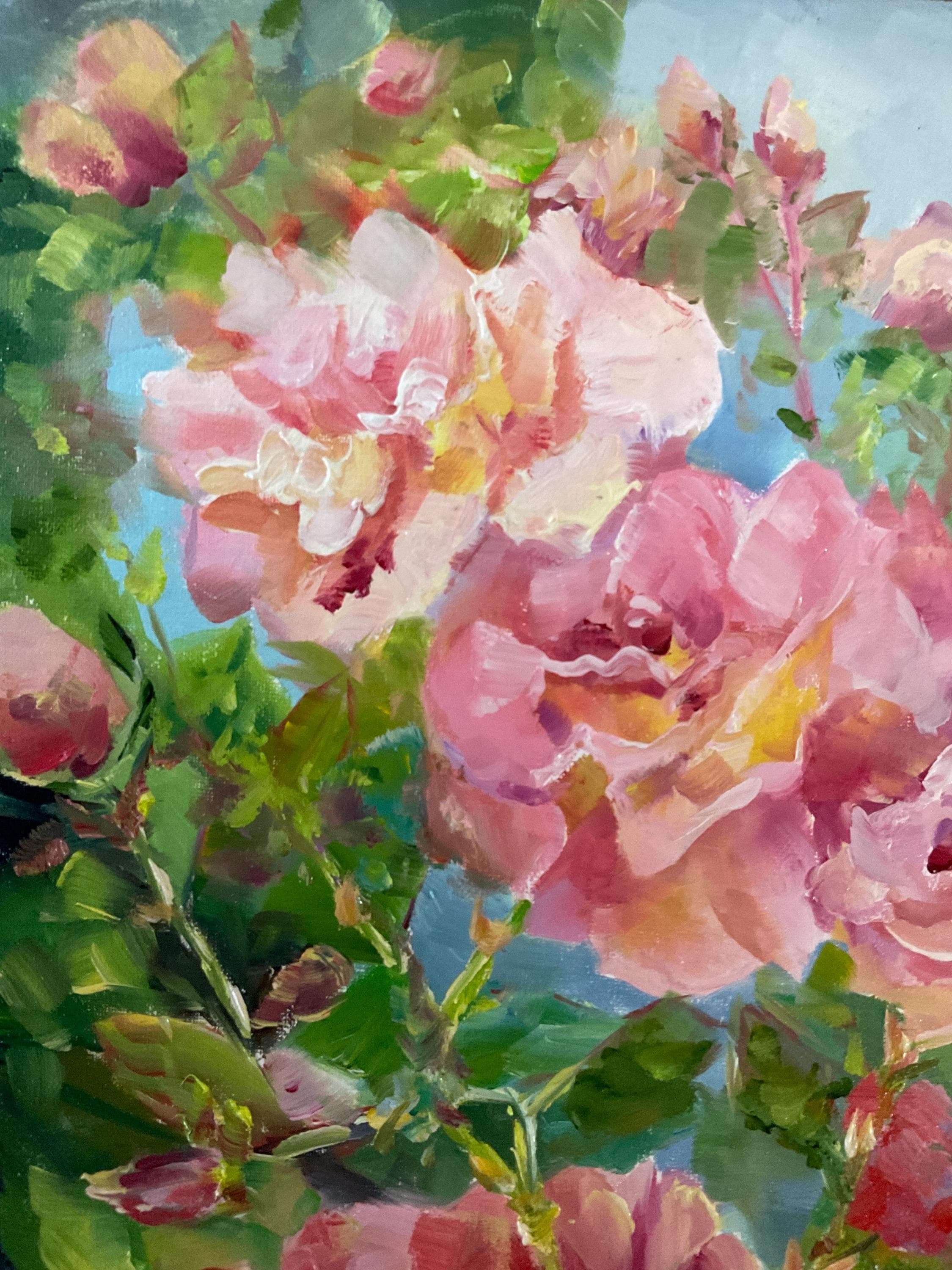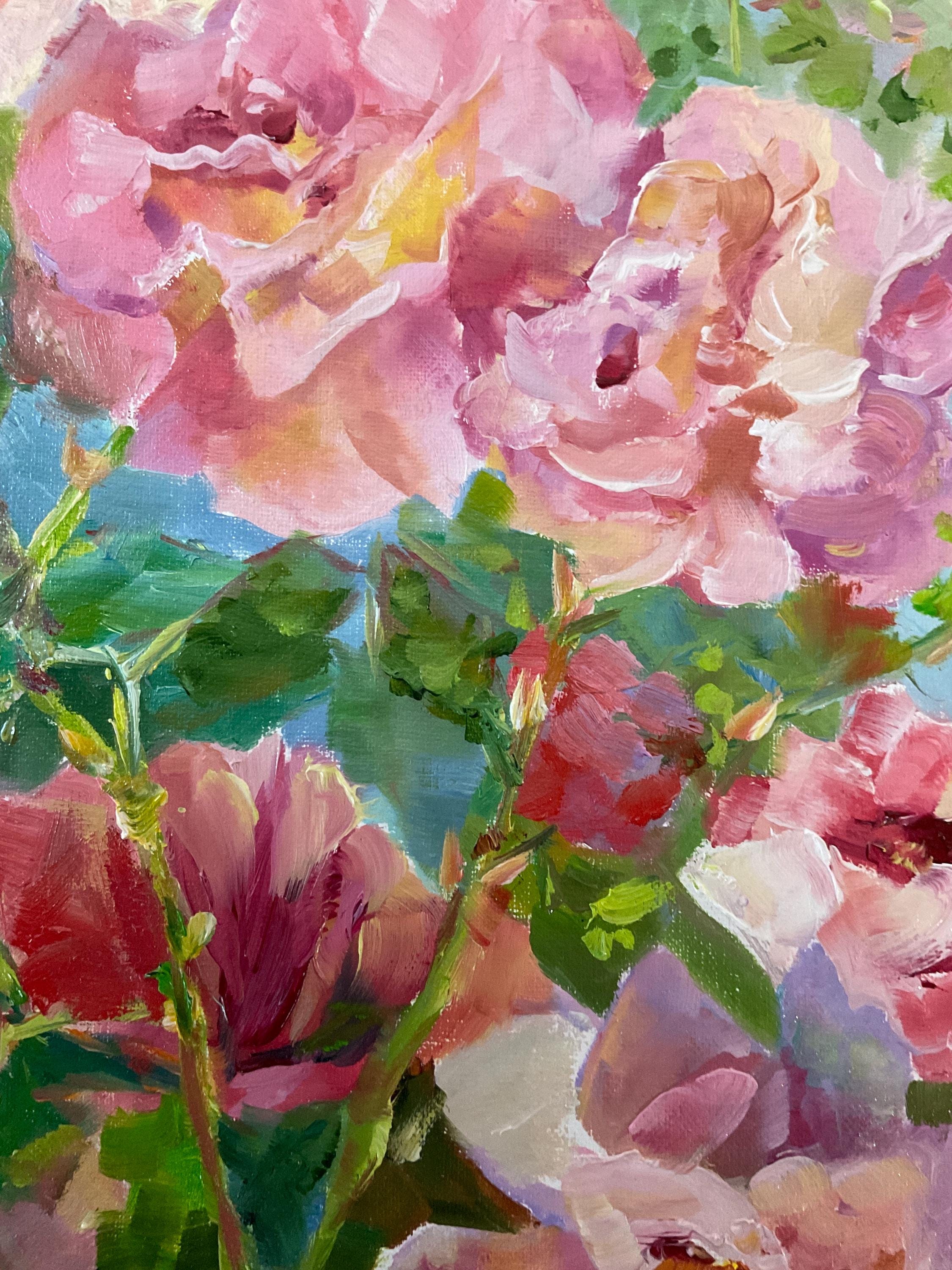 BLOOMING ROSES is an original 11”x14”x1” oil painting on a high quality canvas panel. This is an incredible painting! It is a bright, colorful scene of a blooming rosebush. The colors of the roses are shades of alizarin reds and pinks. It’s painted in the style of Vincent Van Gogh. I was so inspired, I’ve painted several in his style since. This is an amazing painting that would light up any room you put it in. If you pick up the beautiful range of pinks, rose colors and reds and accent them in a pillow or a blanket, it will light up the room.