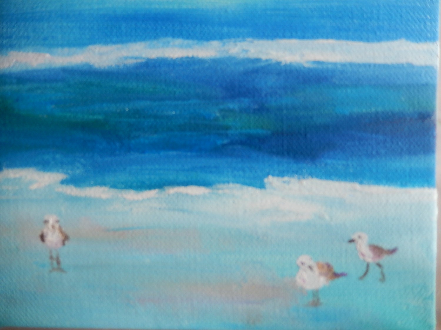 FUNNY BIRDS AT THE BEACH is a 6” x 6” Unframed painting on a canvas. This is a wonderful mini masterpiece that fits so well on the office desk or a little shelf in the bathroom. This scene shows the beautiful colors of the ocean and the beach, with whimsical birds dancing on it. It will remind you of that special vacation. Out in the ocean, the waves break into wonderful tints of blues and greens. The paint is textured, to give more authenticity to the scene. The canvas has a depth of 1/2" and is painted on the edges, so you don't need a frame. There is another matching painting that would make a wonderful pair.