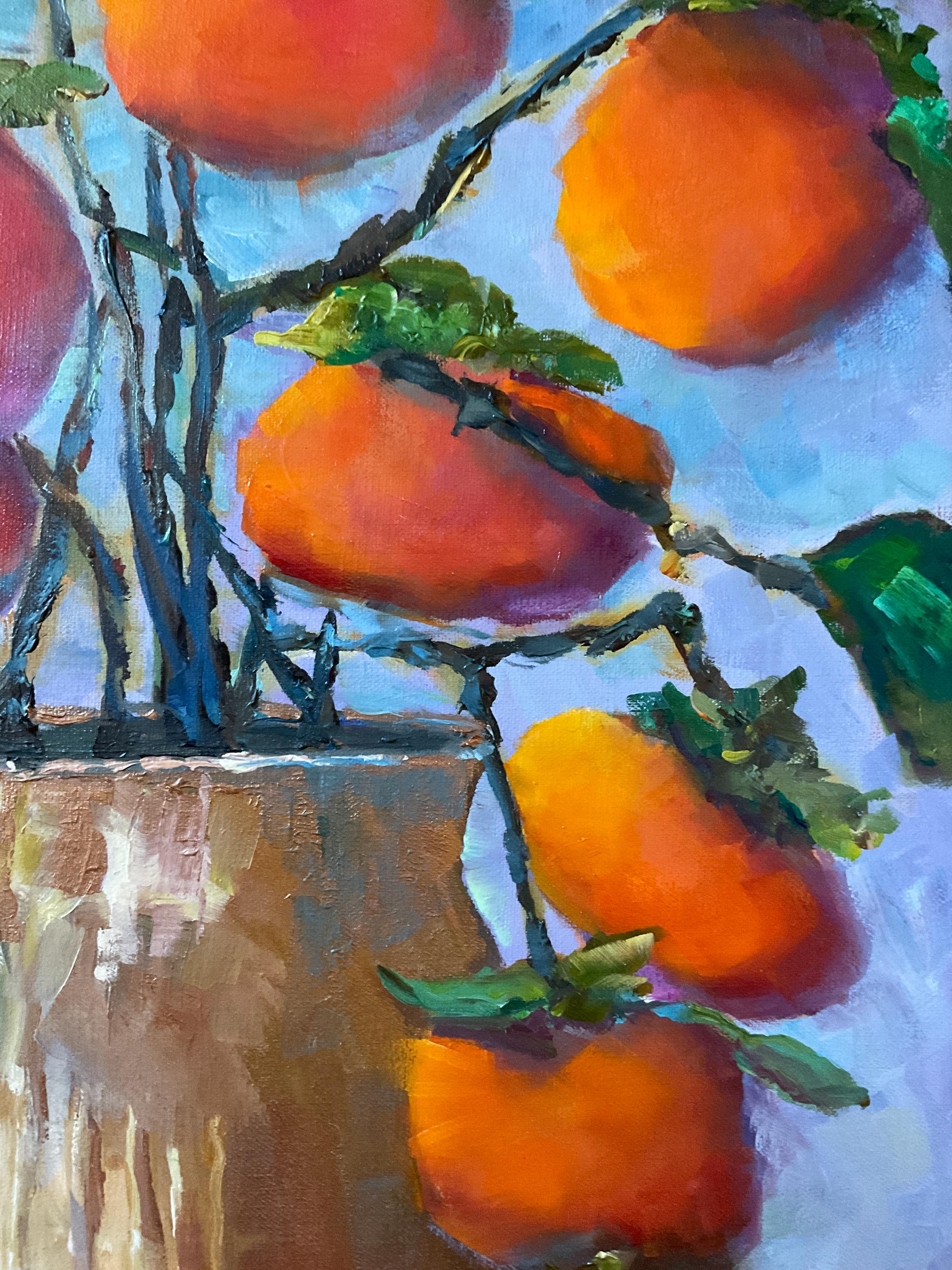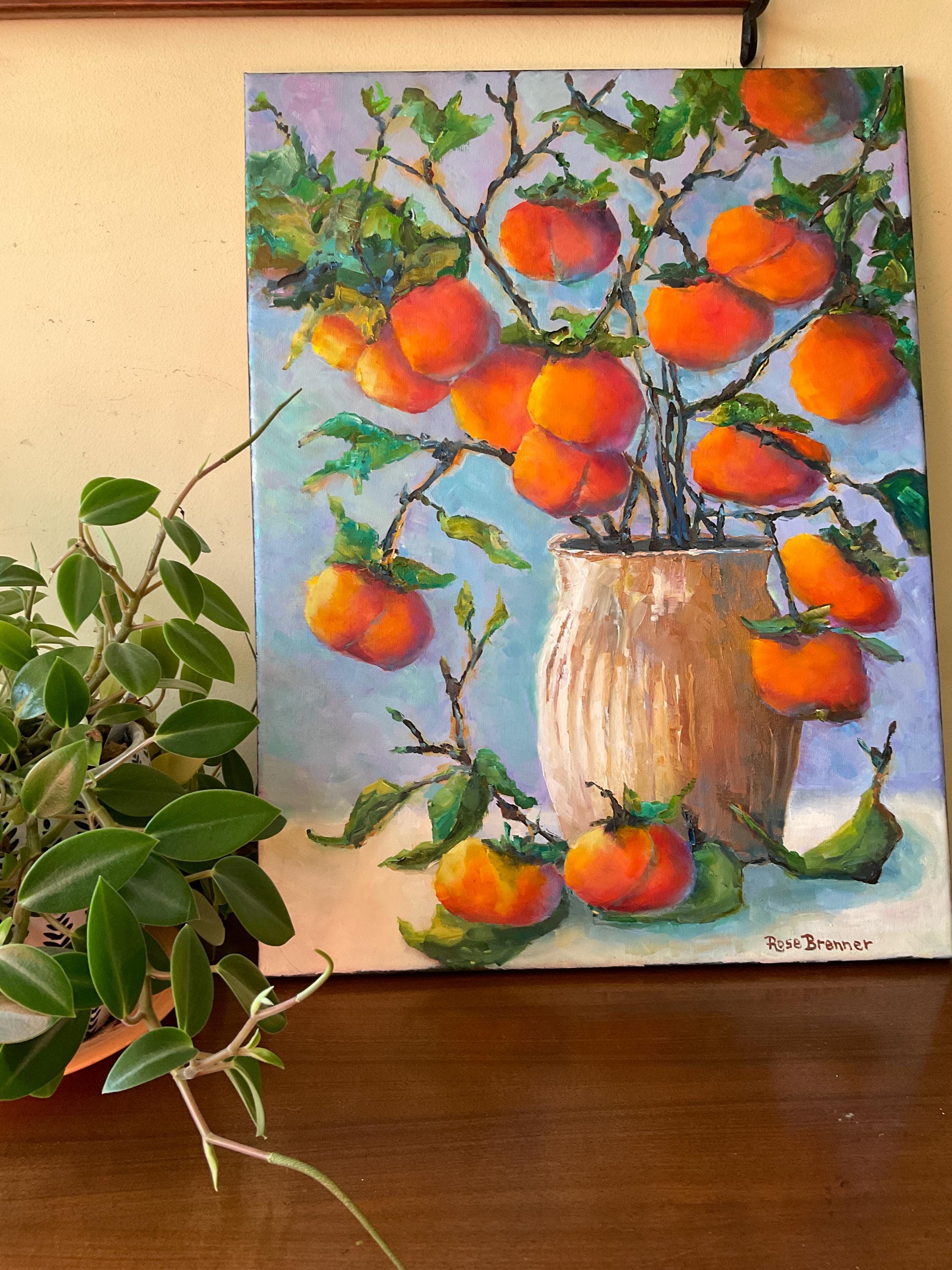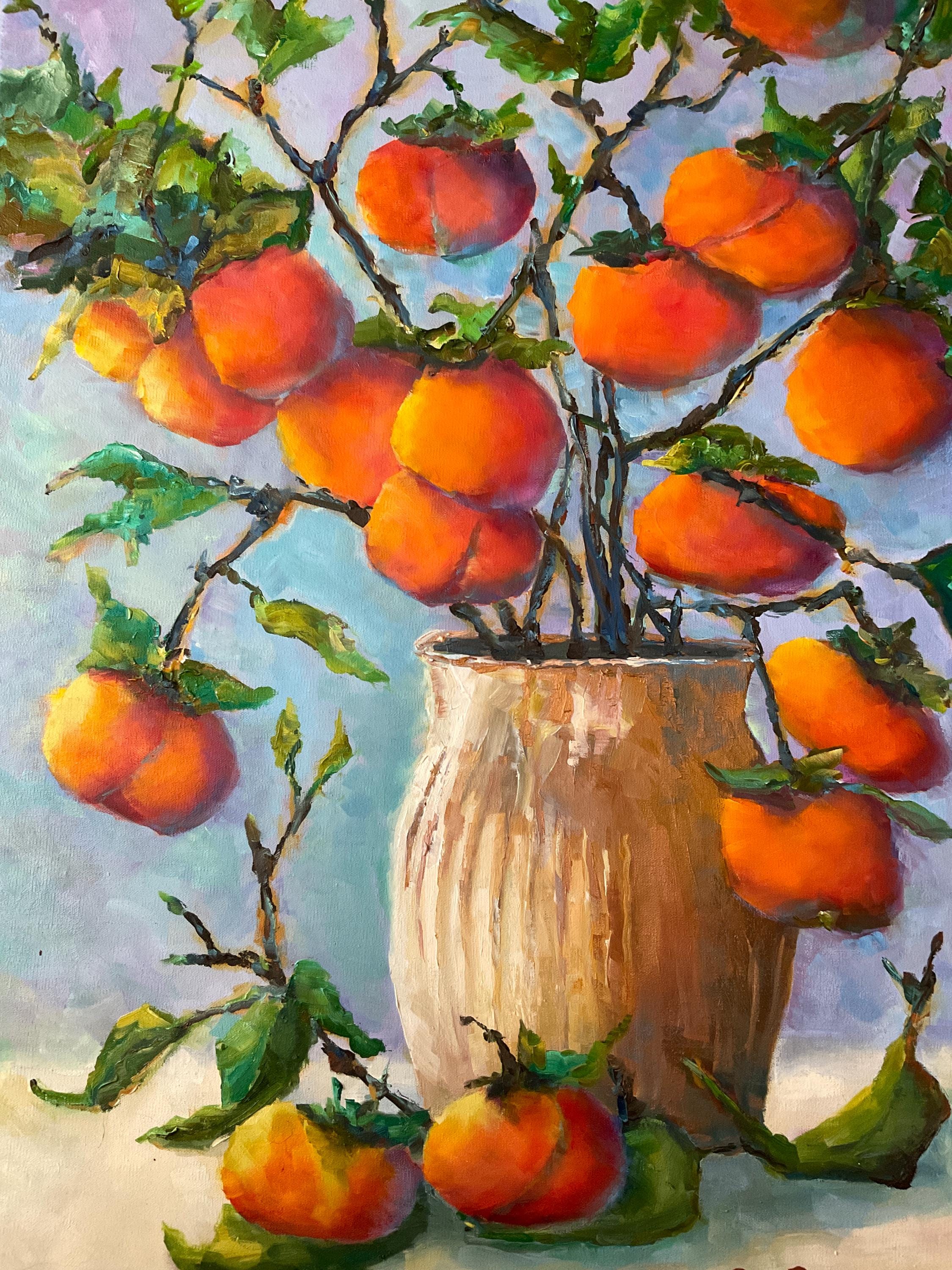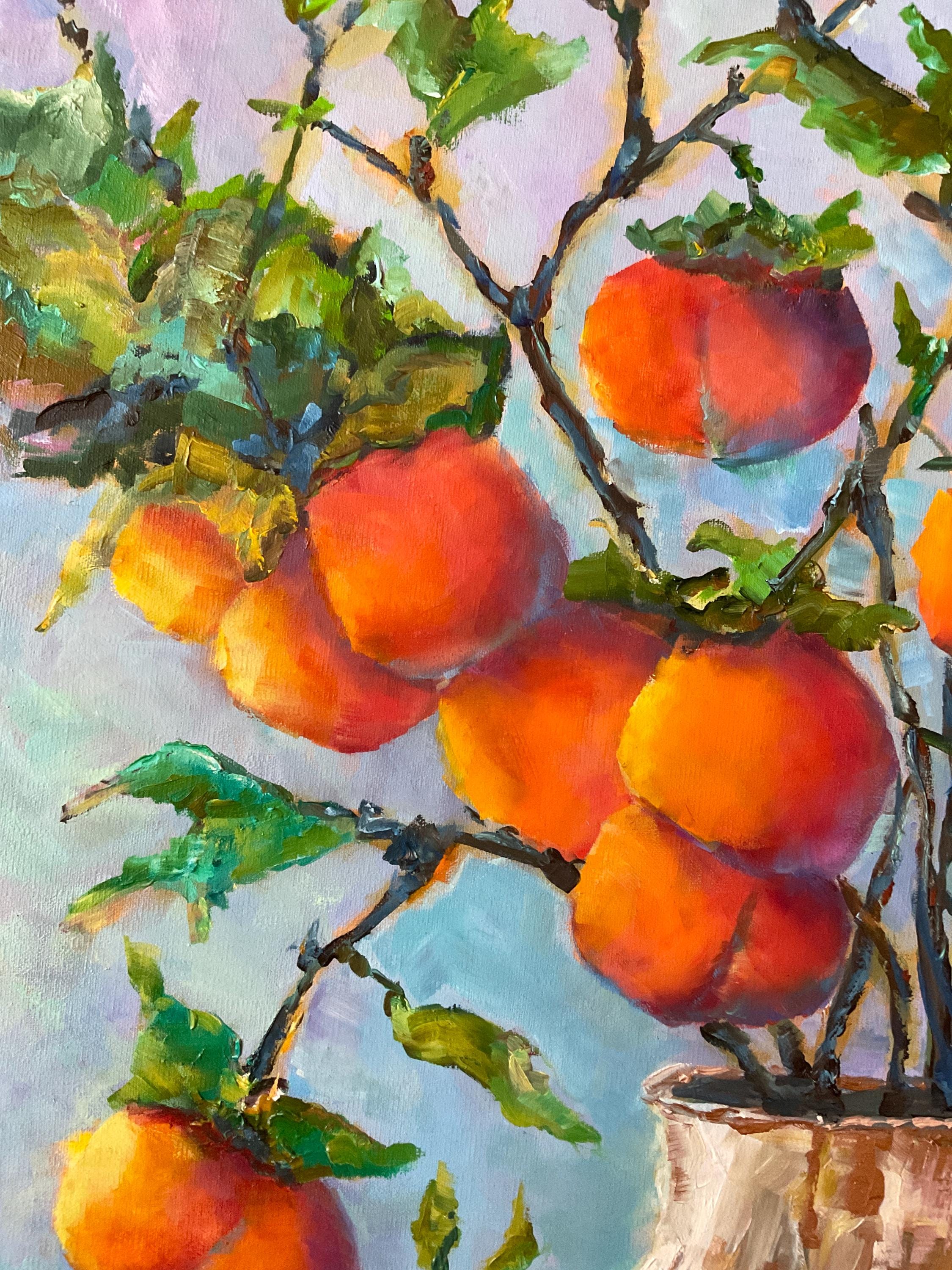 VASE OF PERSIMMONS is an original 24" x 18” oil painting on a gallery wrap canvas. This is an incredible painting! It is a bright, colorful scene of an Indiana wild fruit. The beautiful orange fruit is used in making baked pudding in the fall. It’s painted in a hyper-realistic style and is very striking. This is an amazing painting that would light up any room you put it in. The colors are amazing - ranging from cream to bright orange. There is an impressionistic yet realistic feel to the whole painting which is very pleasing. The paint is applied with bold strokes and the colors are striking.