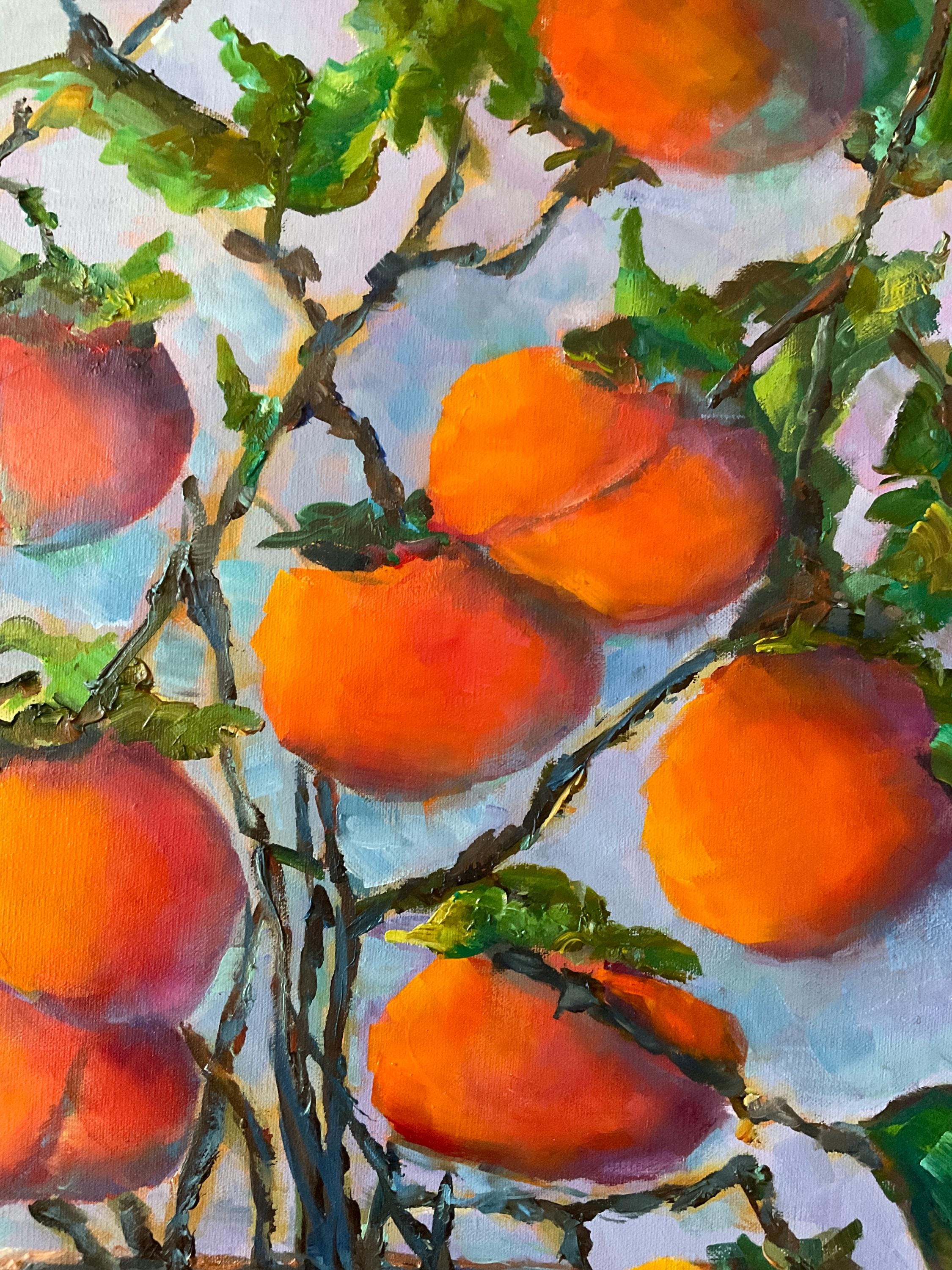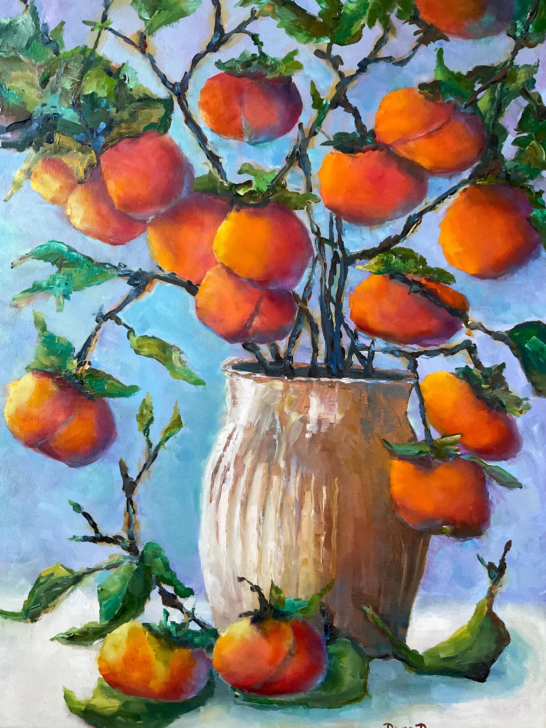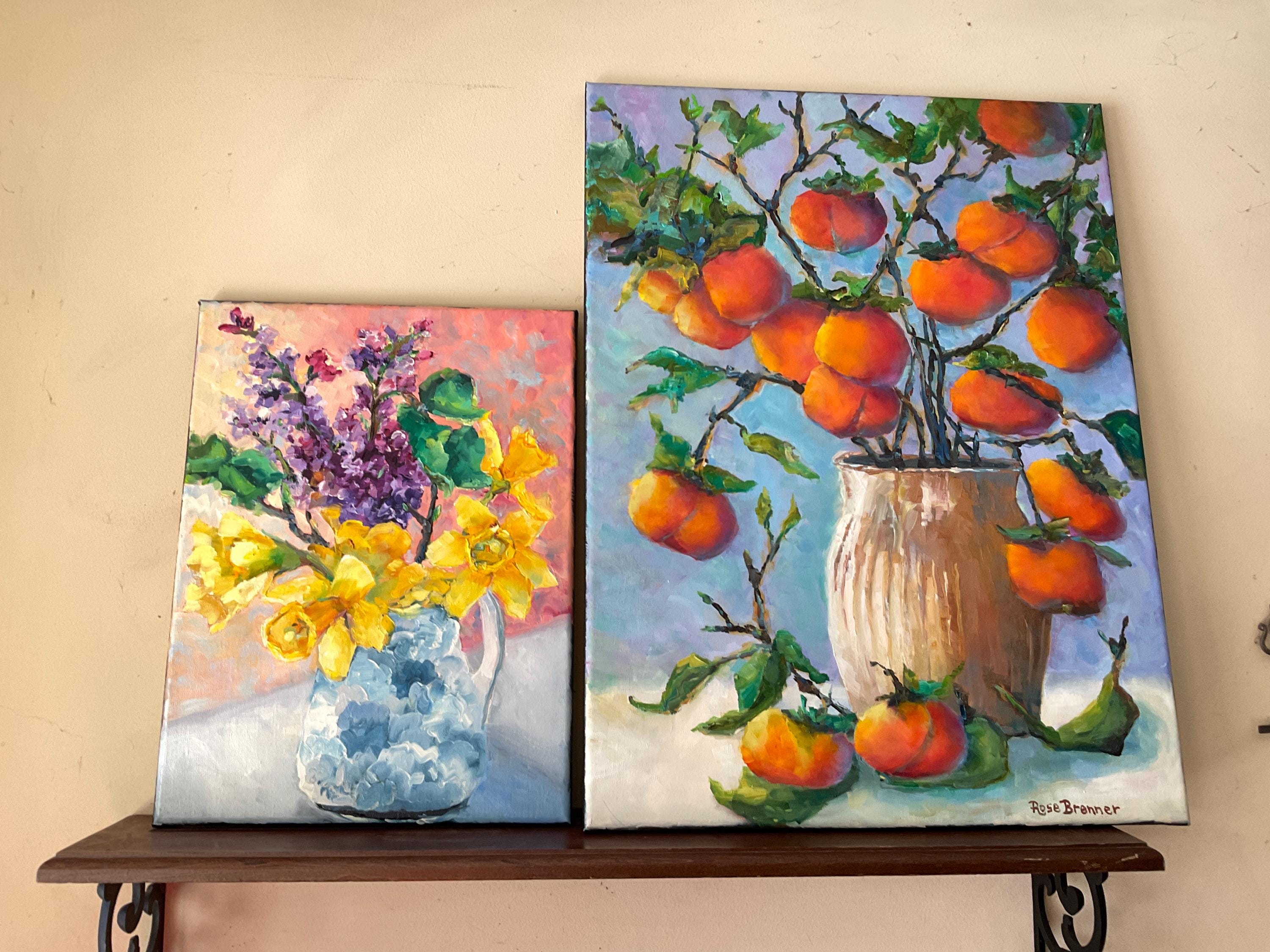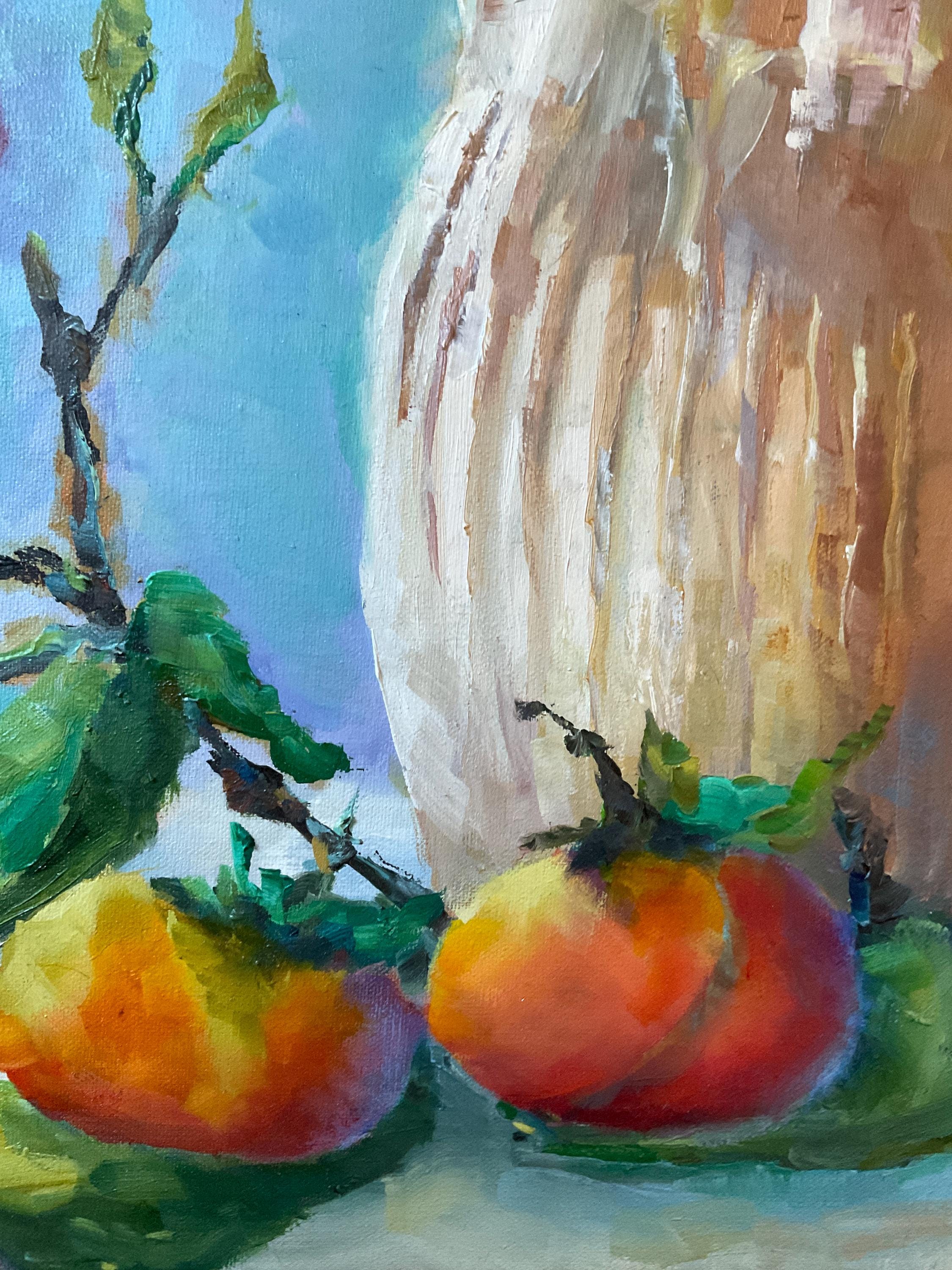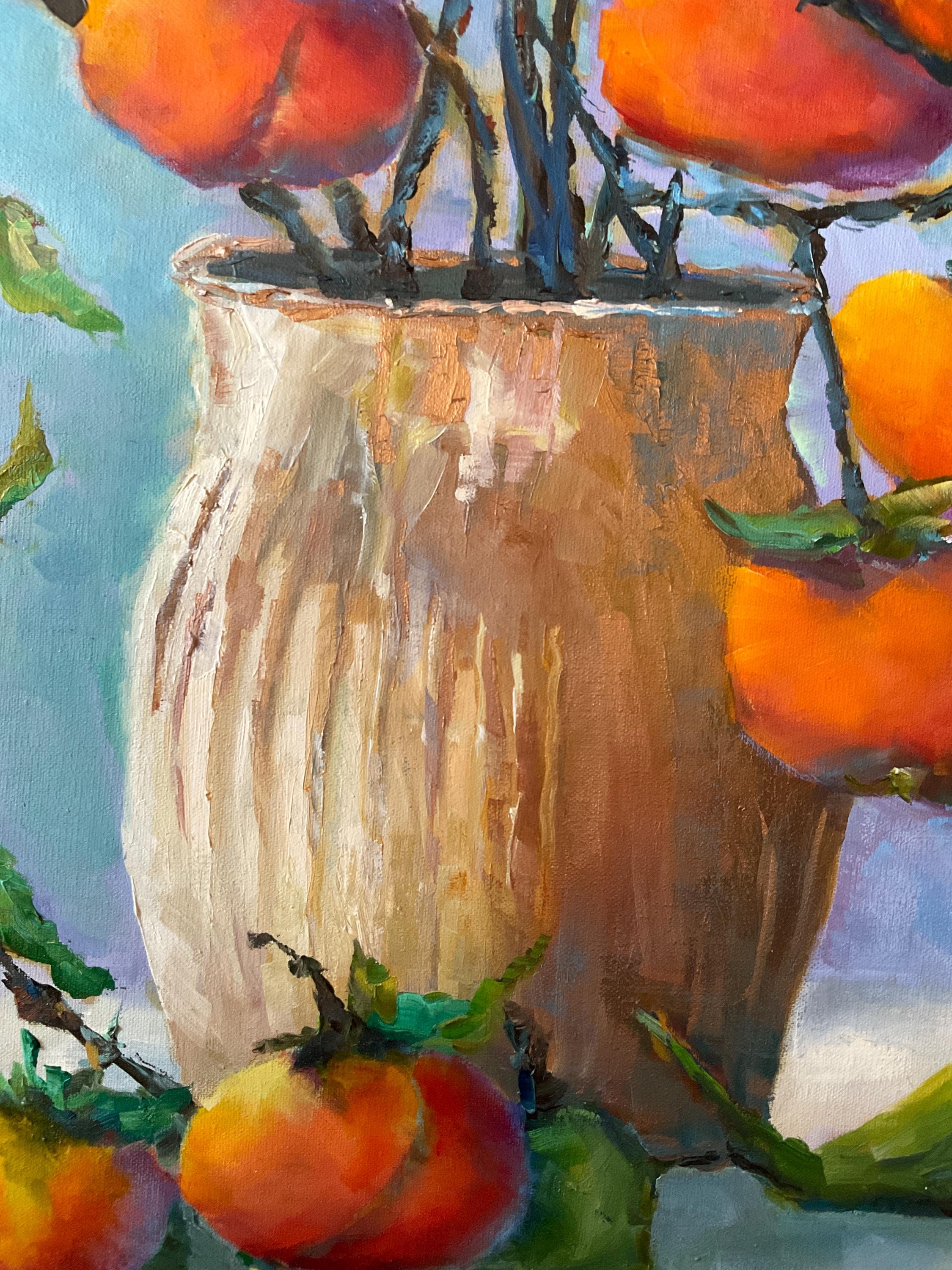 VASE OF PERSIMMONS is an original 24" x 18” oil painting on a gallery wrap canvas. This is an incredible painting! It is a bright, colorful scene of an Indiana wild fruit. The beautiful orange fruit is used in making baked pudding in the fall. It’s painted in a hyper-realistic style and is very striking. This is an amazing painting that would light up any room you put it in. The colors are amazing - ranging from cream to bright orange. There is an impressionistic yet realistic feel to the whole painting which is very pleasing. The paint is applied with bold strokes and the colors are striking.