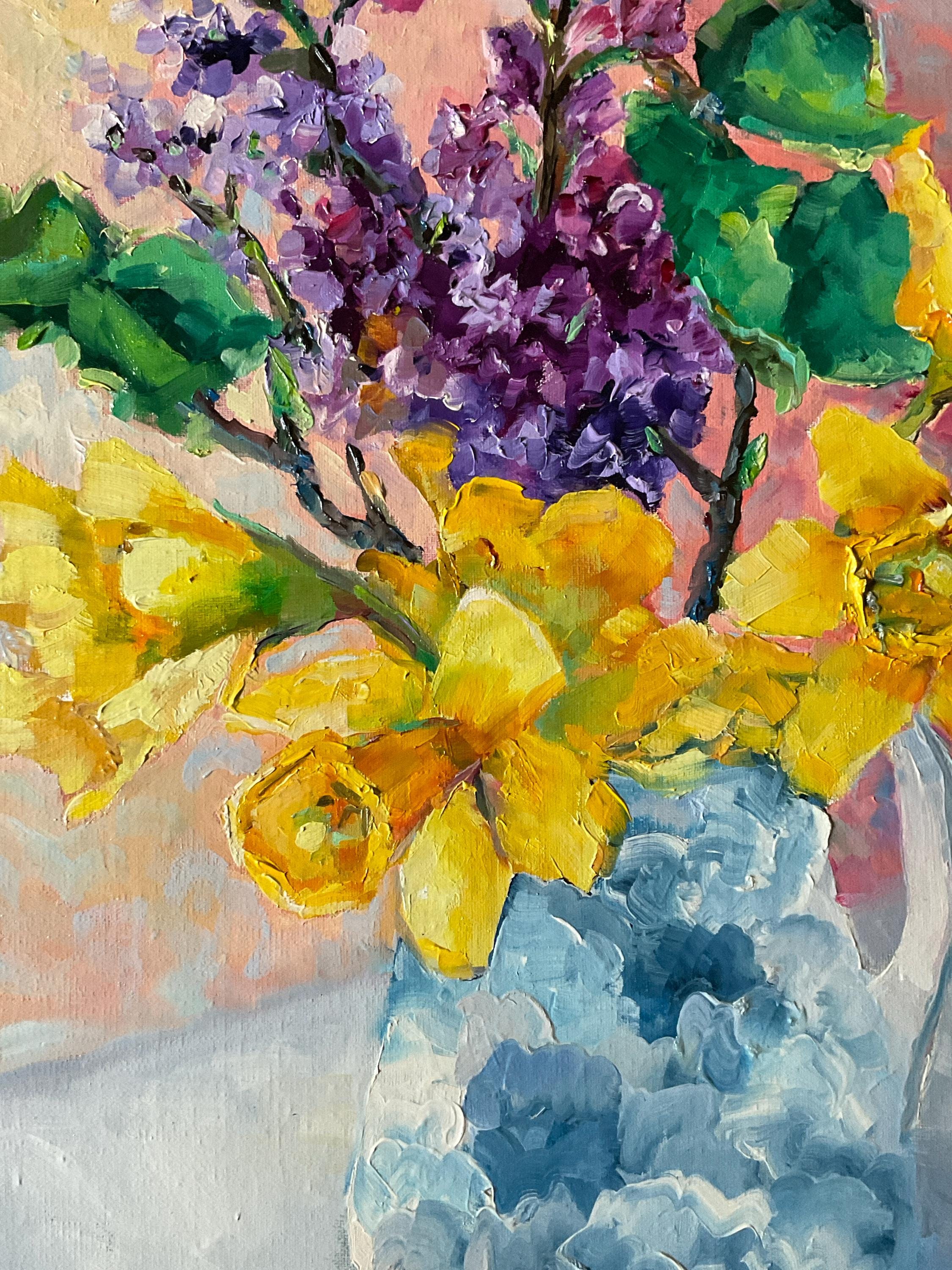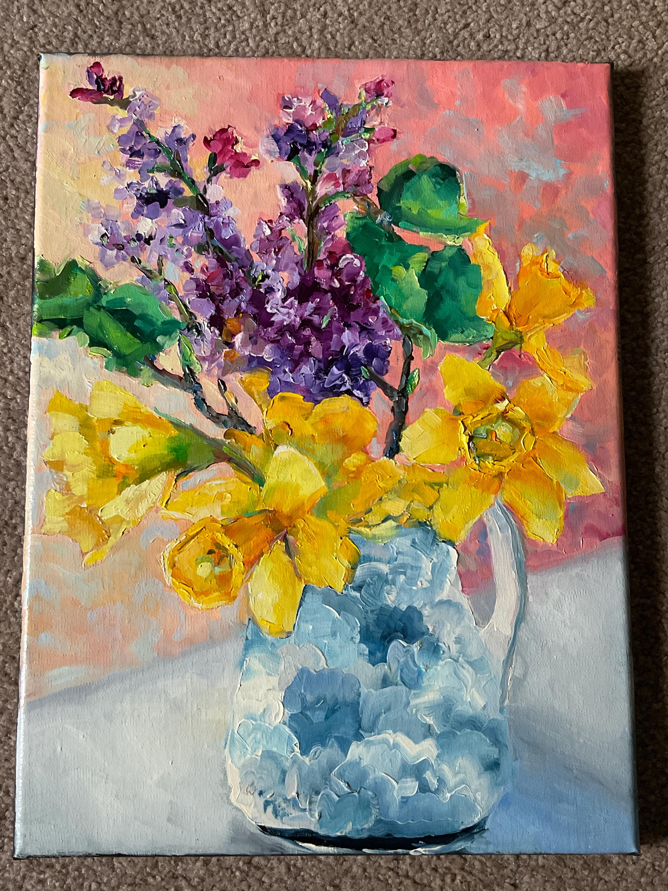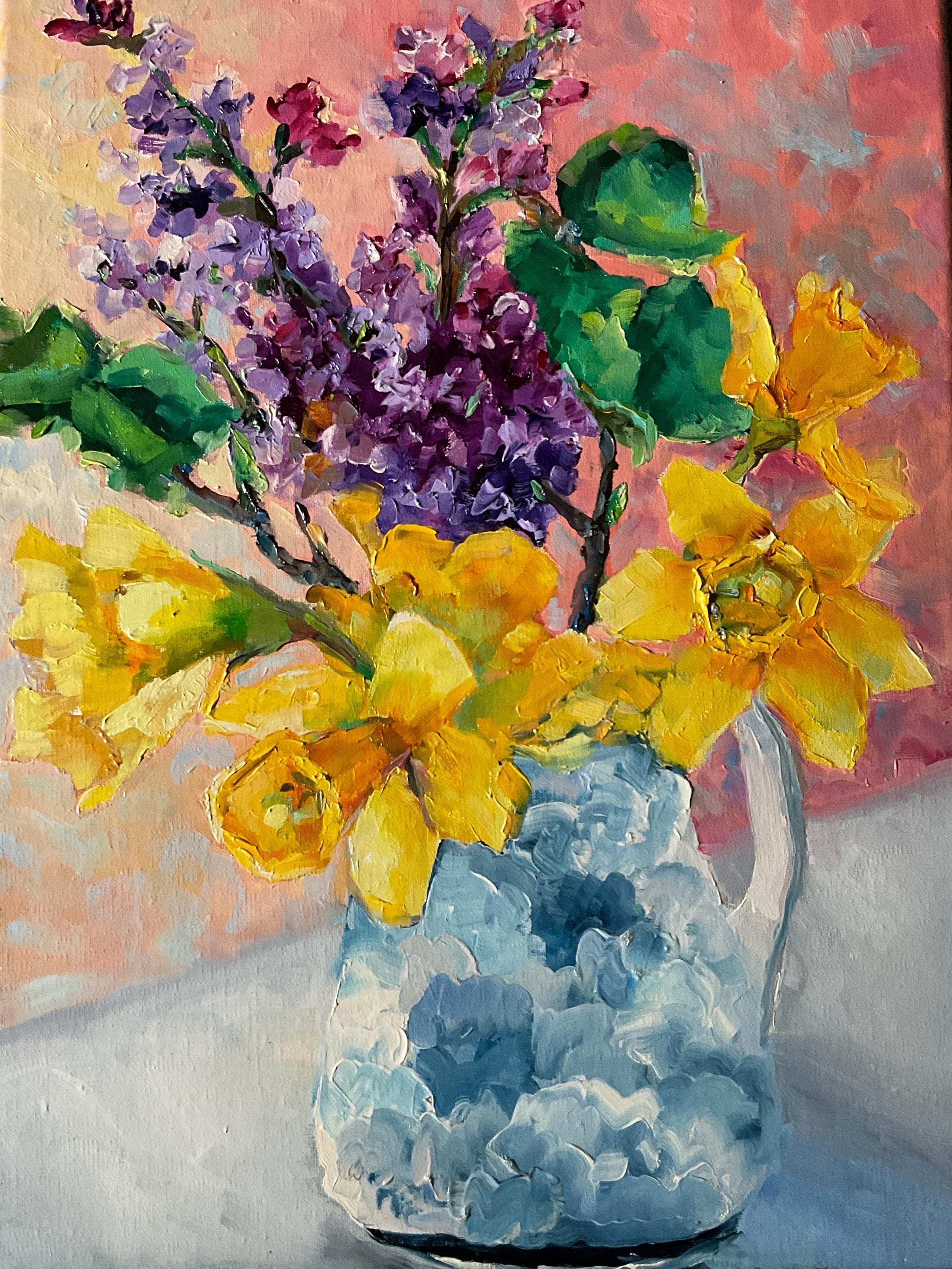 LILACS AND DAFFODILS is an original 12” x 16” oil painting on a gallery wrap canvas. The painting is of flowers from my garden. The lilacs and daffodils were blooming at the same time, so I painted them together in a blue and white urn. This is an impressionist painting with strong contrasts. It will enhance many color schemes. It will light up a room, especially if other objects pick up the bright yellows and greens, such as a pillow or a vase. The painting extends down over the sides of the canvas. The depth of the canvas is 3/4” wide. Since it is painted on all sides, the painting does not need to be framed.