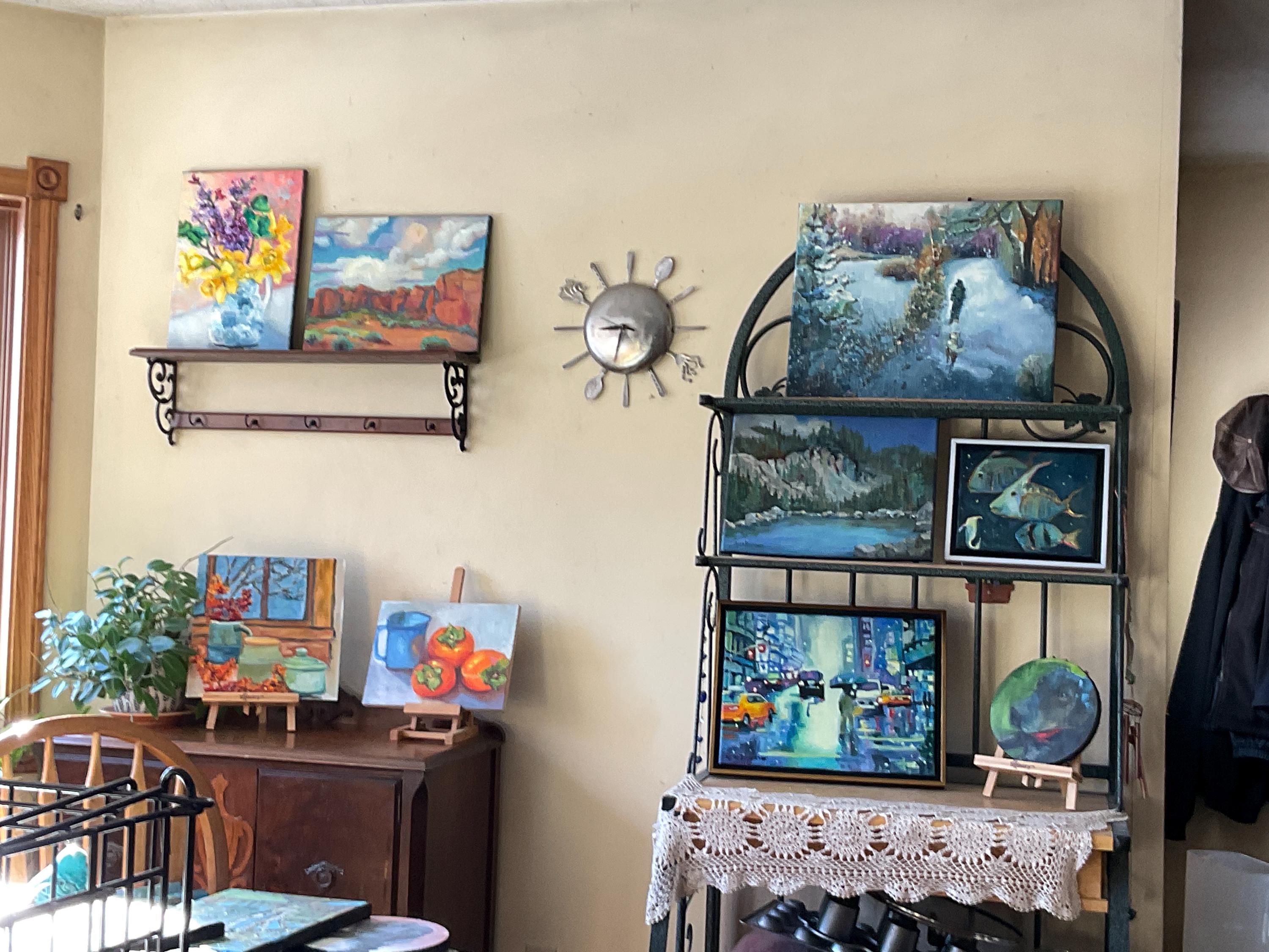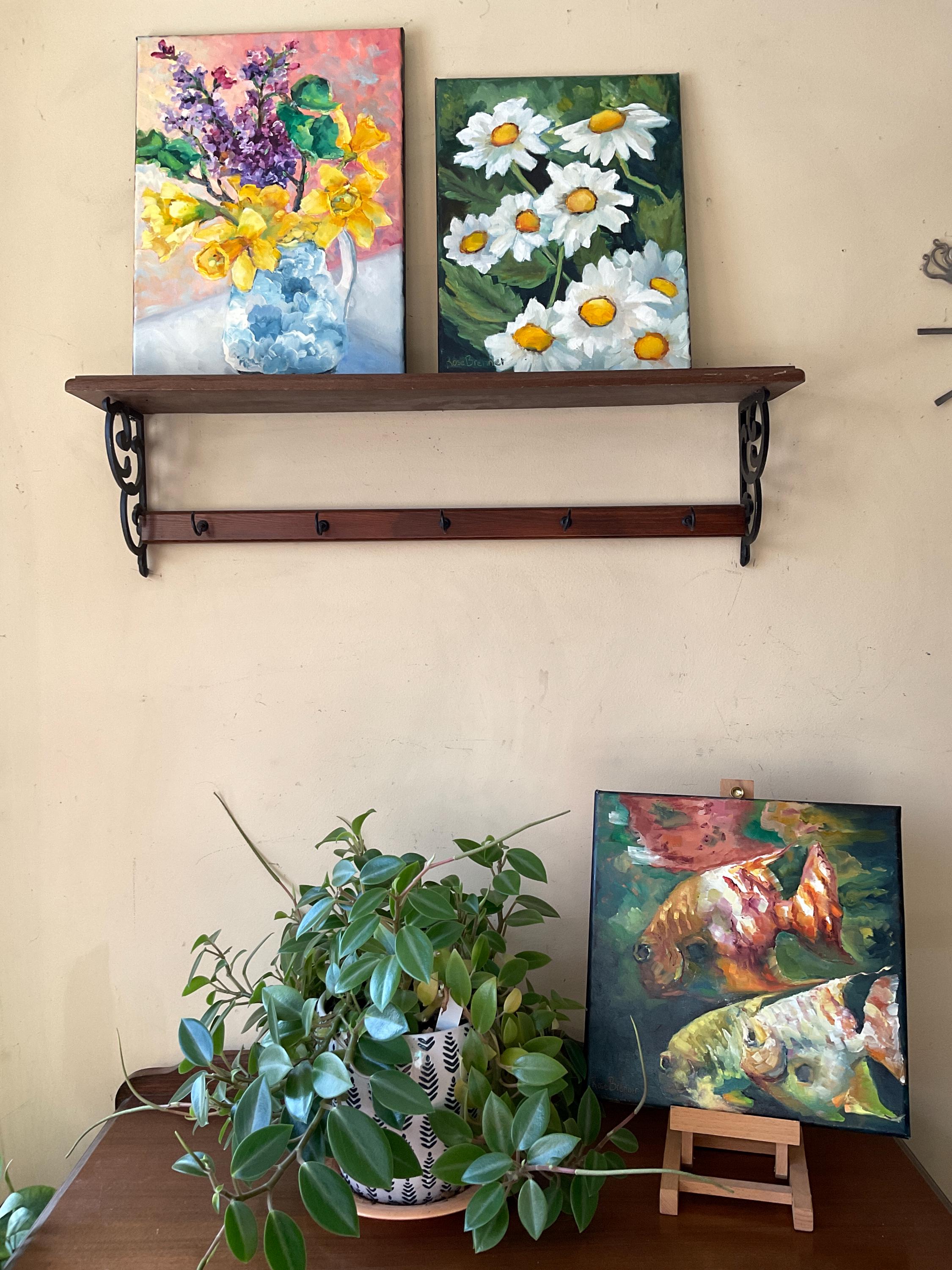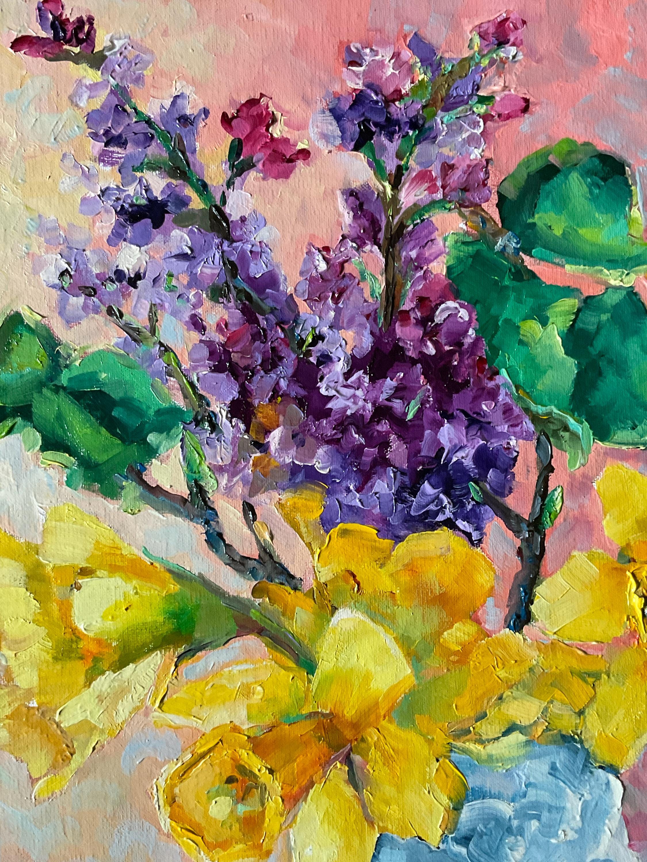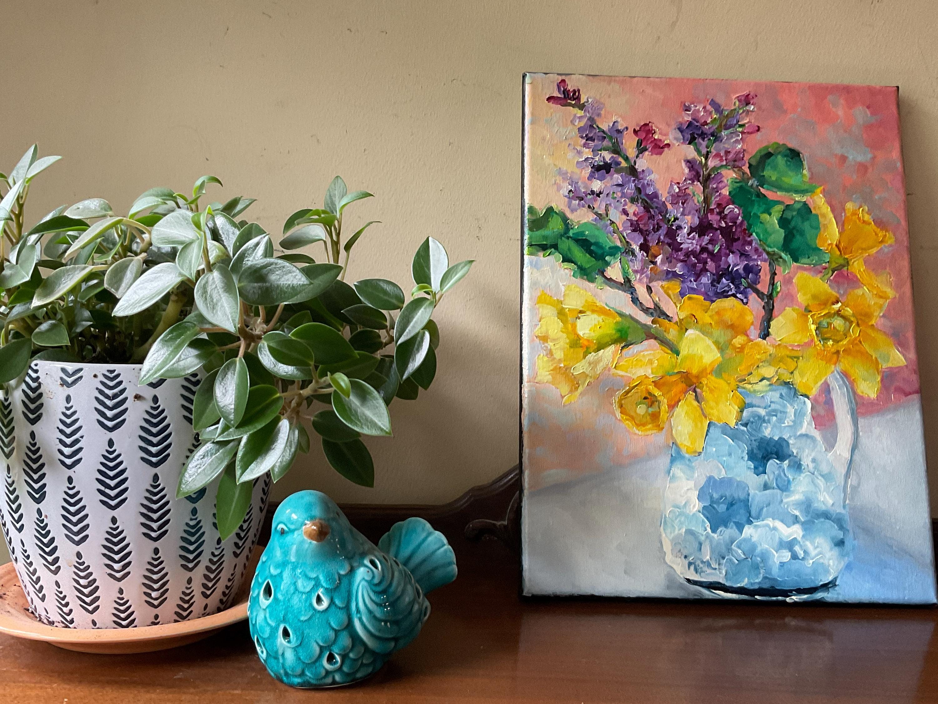 LILACS AND DAFFODILS is an original 12” x 16” oil painting on a gallery wrap canvas. The painting is of flowers from my garden. The lilacs and daffodils were blooming at the same time, so I painted them together in a blue and white urn. This is an impressionist painting with strong contrasts. It will enhance many color schemes. It will light up a room, especially if other objects pick up the bright yellows and greens, such as a pillow or a vase. The painting extends down over the sides of the canvas. The depth of the canvas is 3/4” wide. Since it is painted on all sides, the painting does not need to be framed.