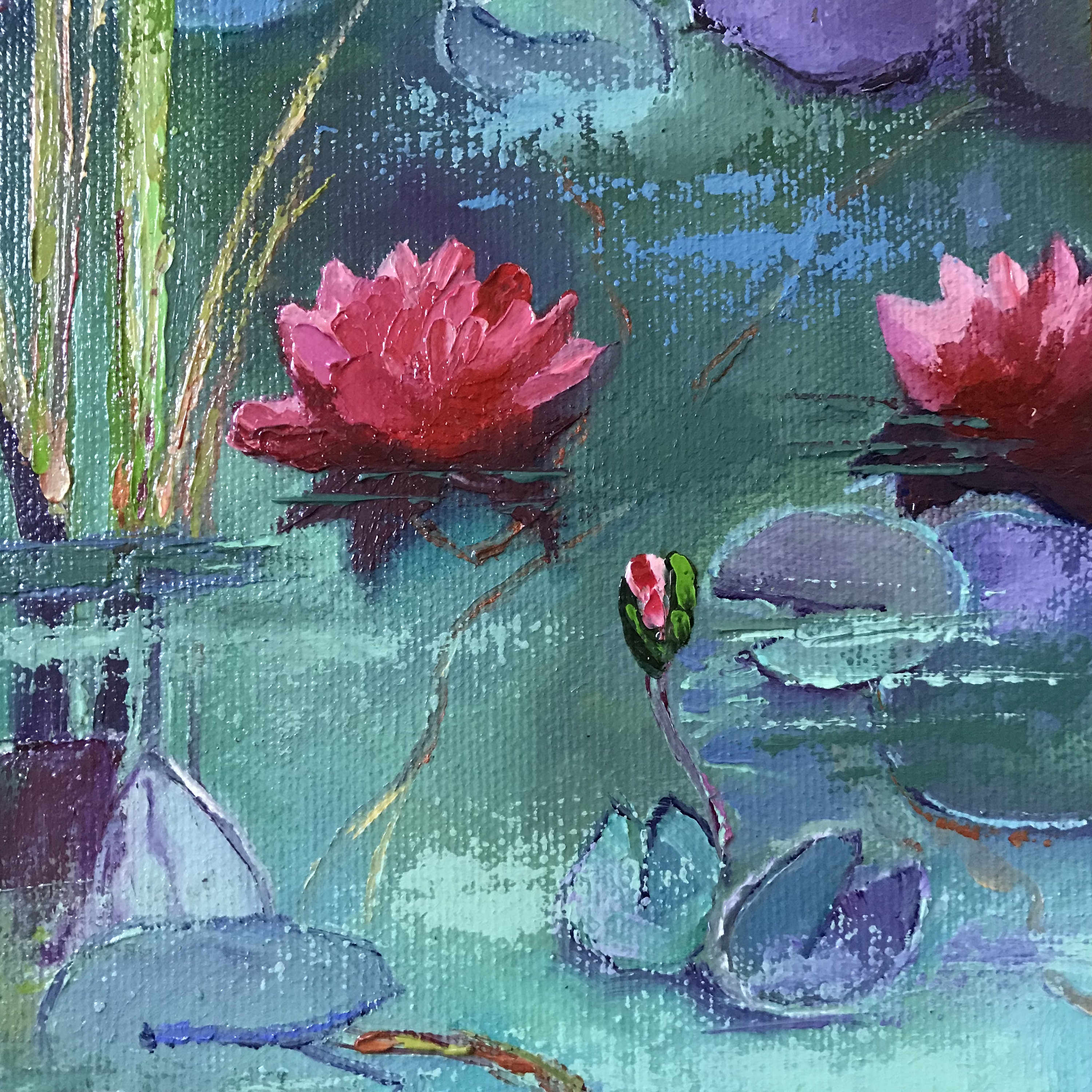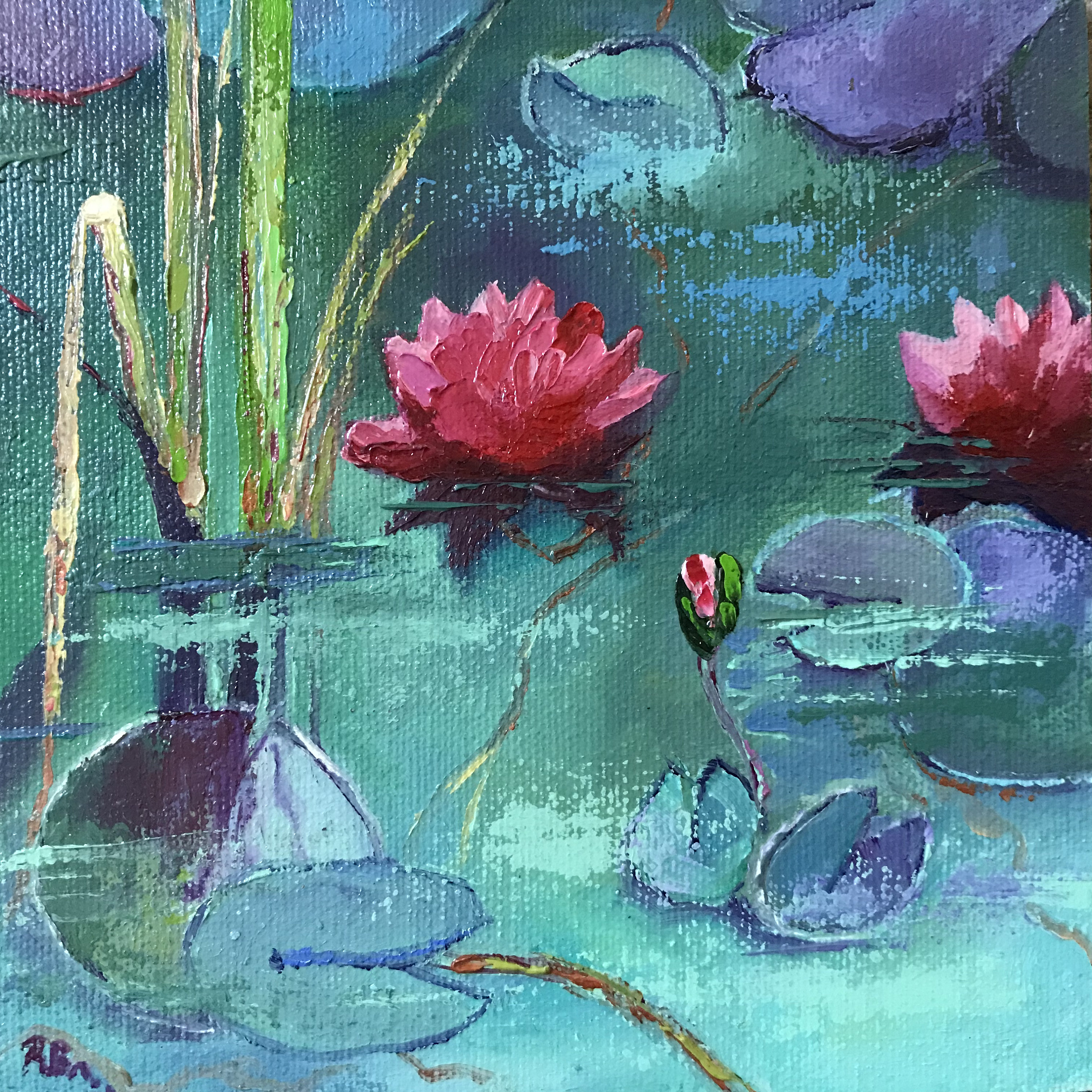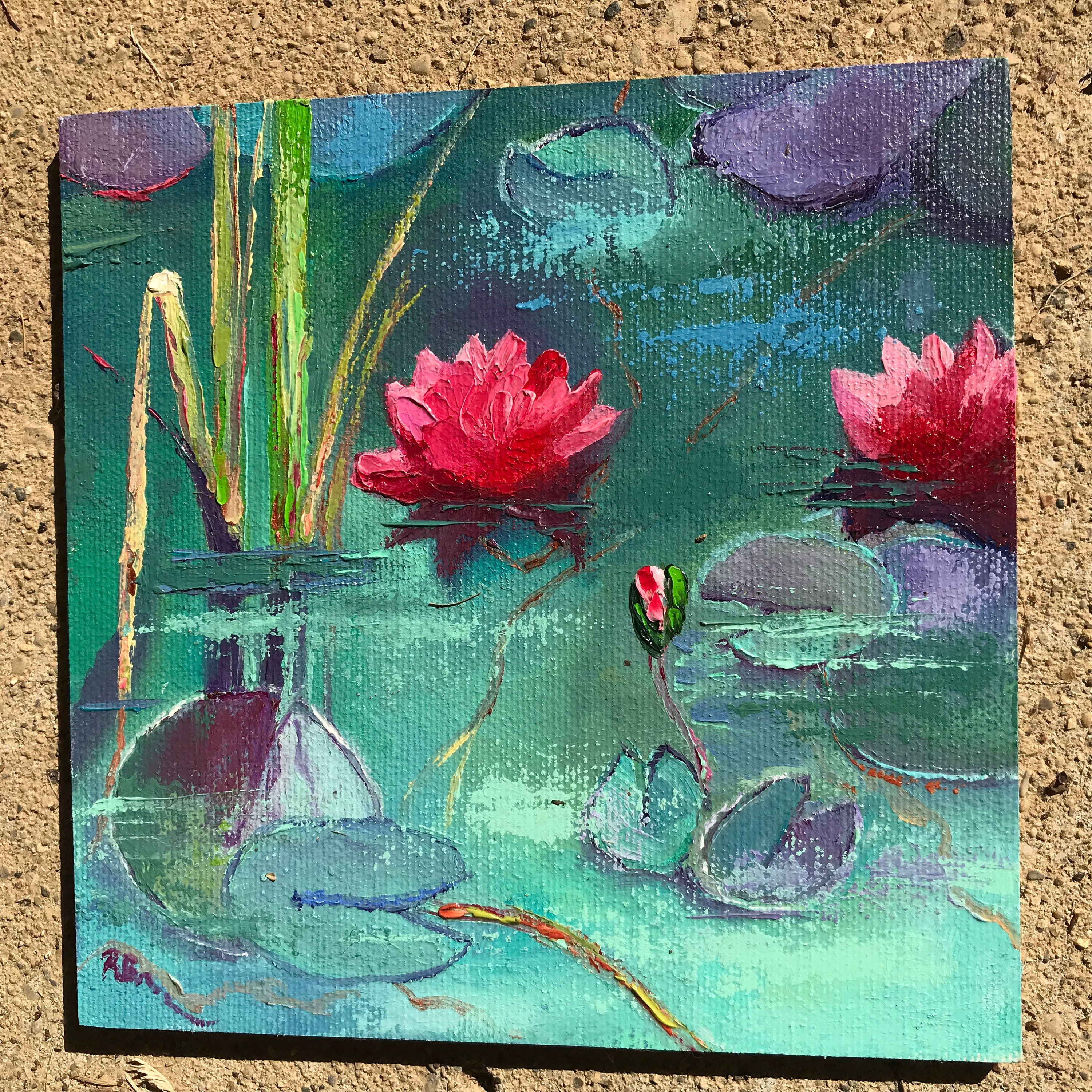 PINK WATER LILIES is an original 6" x 6" oil painting on a canvas panel. It is an impressionistic picture of pink water lilies. The background pool is done in shades of sage, soft blues, and cool greens. There are lily pads and grasses. There are two similar paintings in this series, both in the same shades of greens. They both have pink water lilies. The lilies are a bright rose color. Lines are blurred and the accents make this the perfect little masterpiece.
