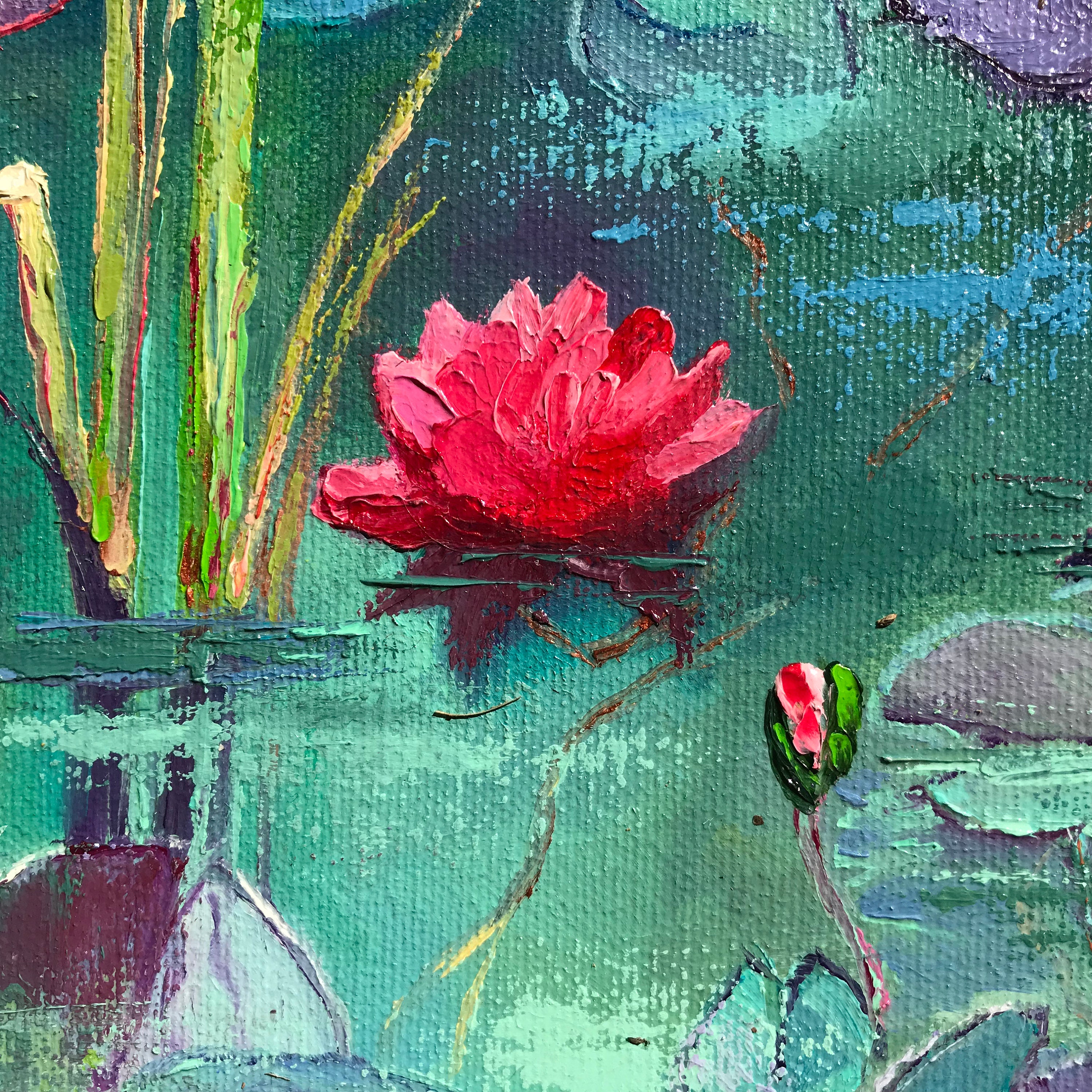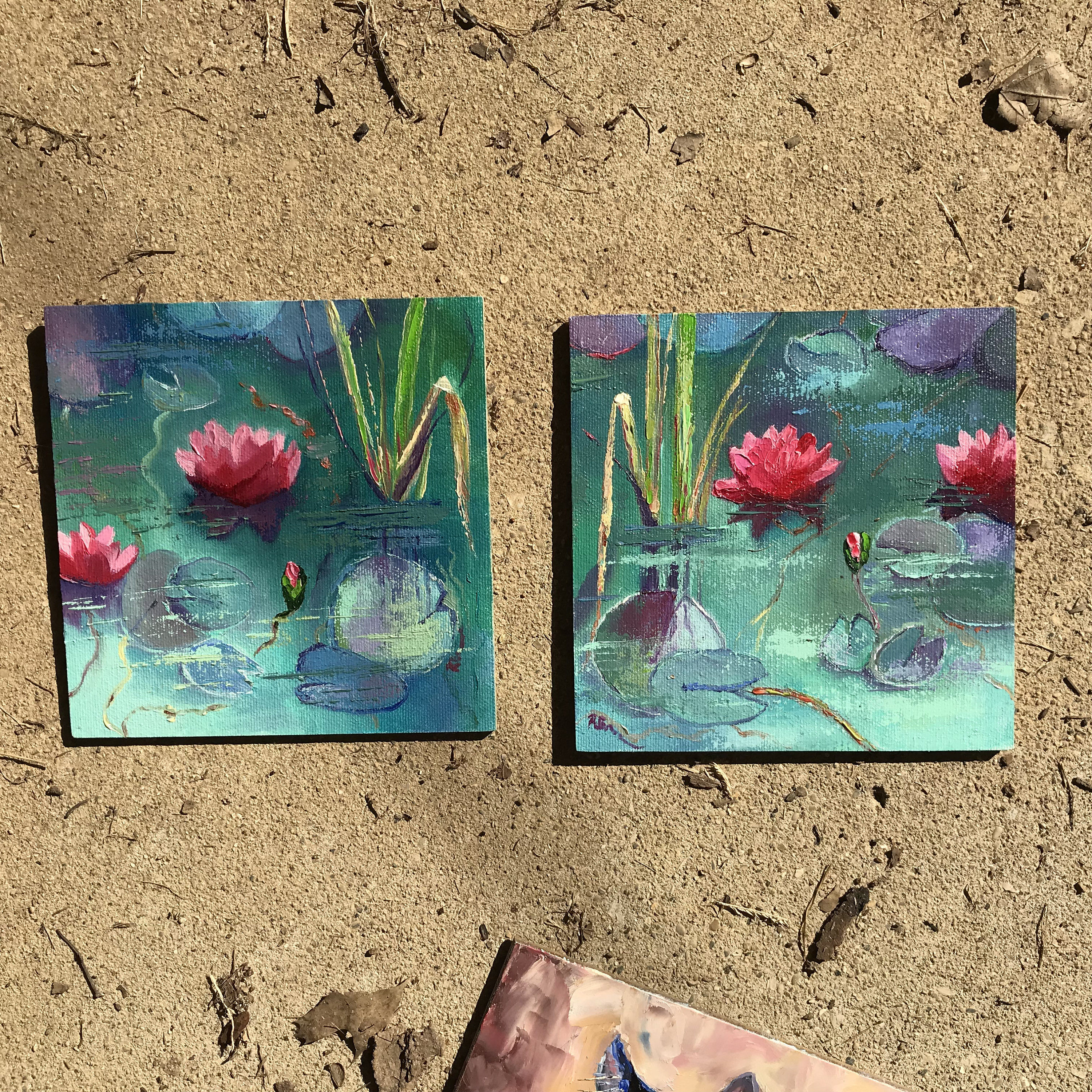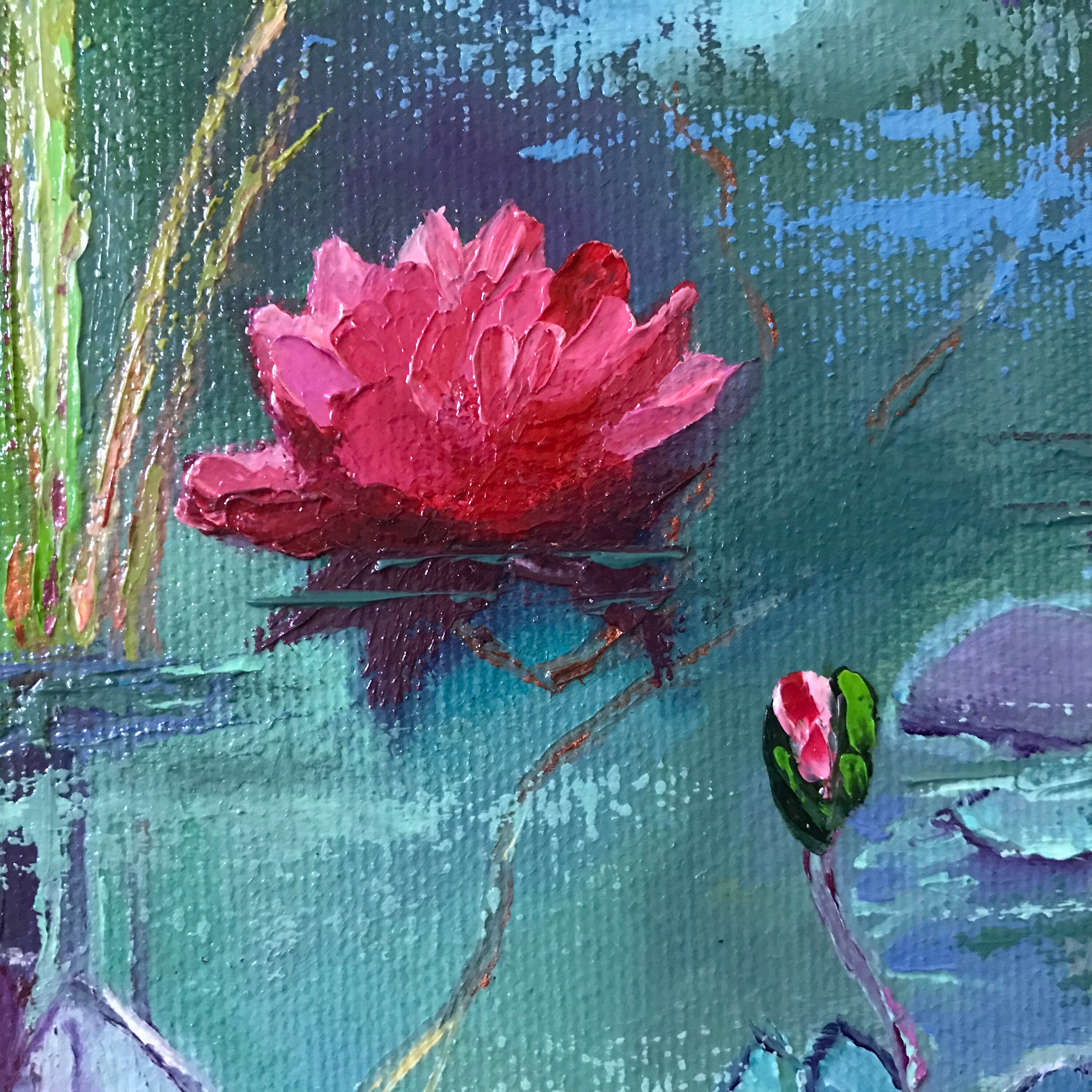 PINK WATER LILIES is an original 6" x 6" oil painting on a canvas panel. It is an impressionistic picture of pink water lilies. The background pool is done in shades of sage, soft blues, and cool greens. There are lily pads and grasses. There are two similar paintings in this series, both in the same shades of greens. They both have pink water lilies. The lilies are a bright rose color. Lines are blurred and the accents make this the perfect little masterpiece.