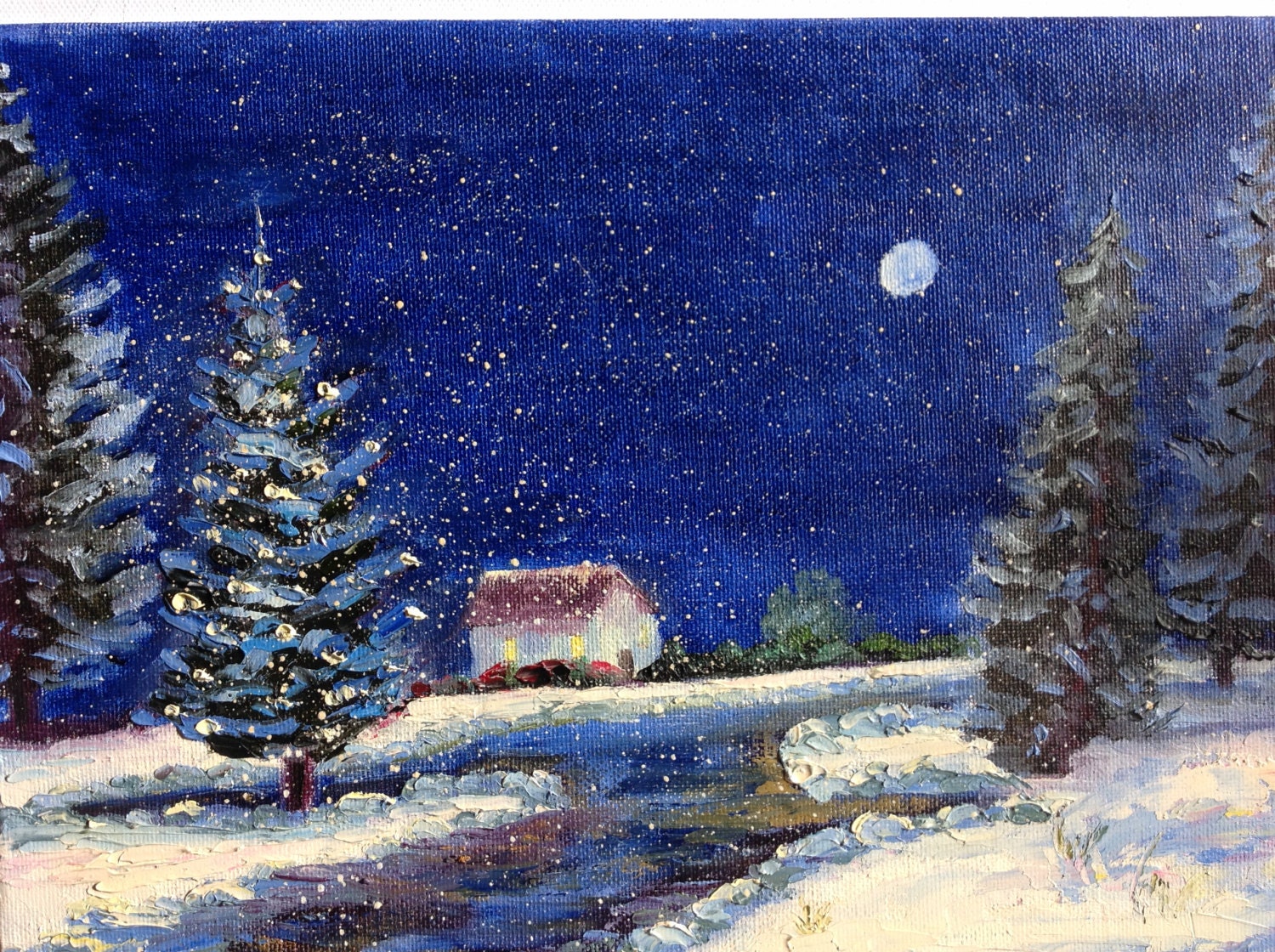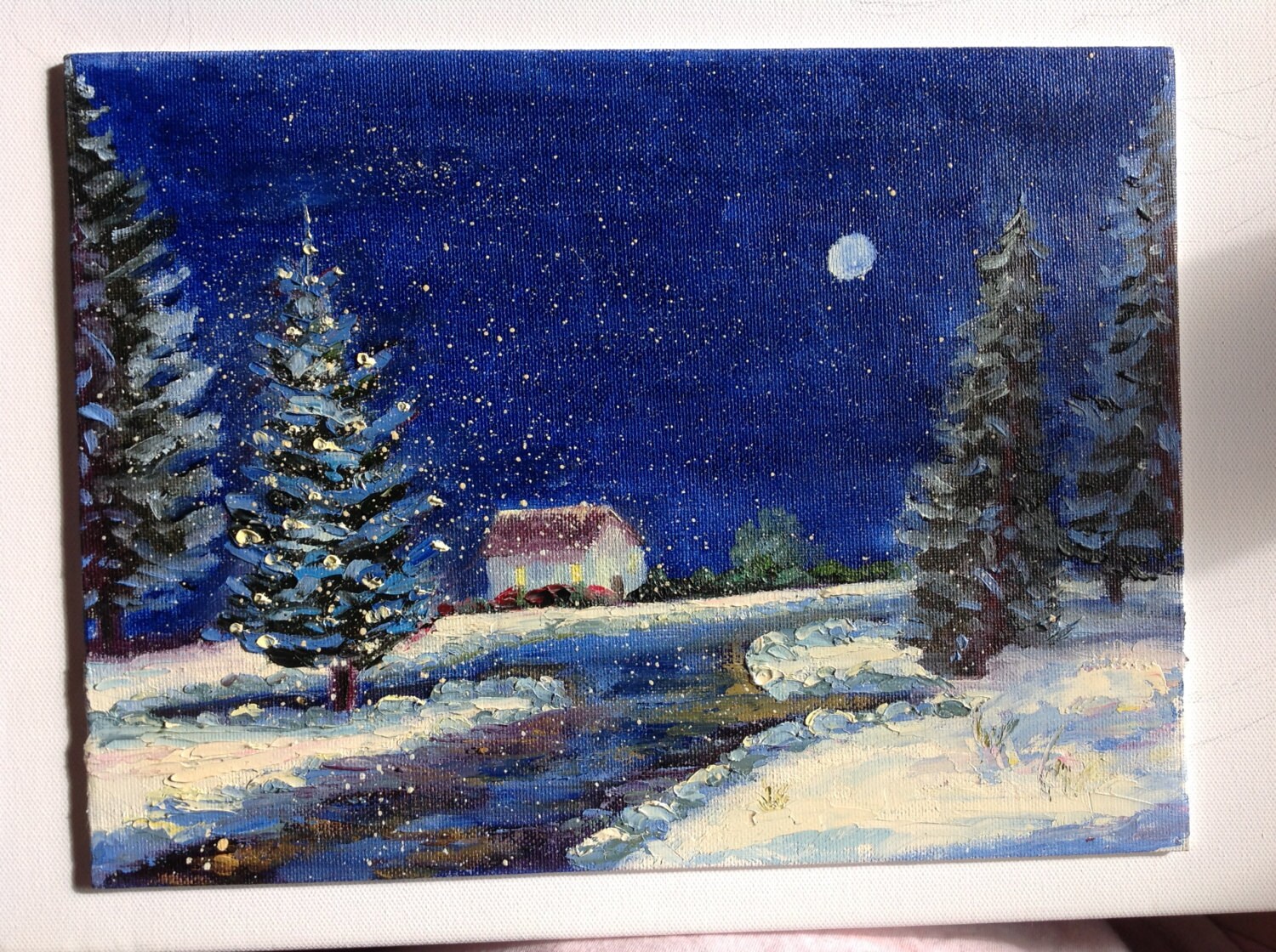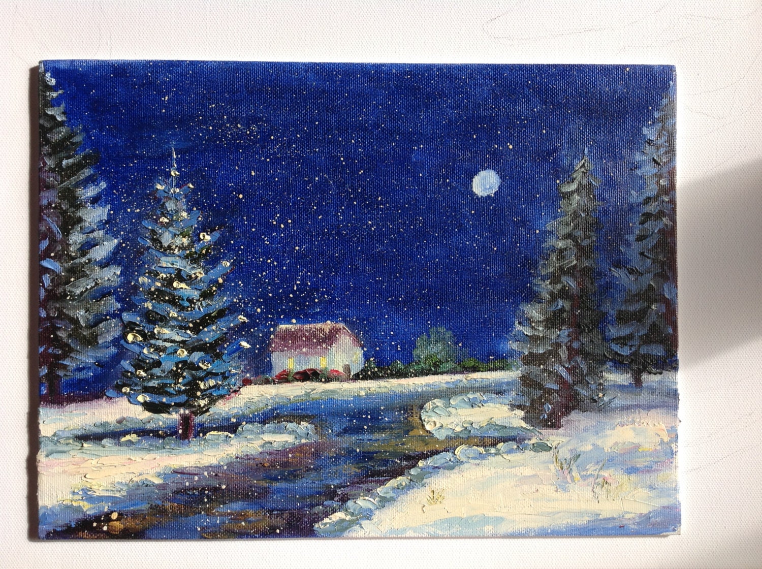 SNOWY EVE is a 12” x 9” Unframed painting on a quality canvas panel. This painting is a whimsical one of a Christmas tree lit up with colored lights in the middle of the woods. There is a gentle snow falling as night falls. The evergreen trees already have snow on them, so they are lit up by the full moon shining in the night sky. There is a house in the distance, lit up against the dark night. This painting is done on Professional canvas panel and the depth is 1/8".
