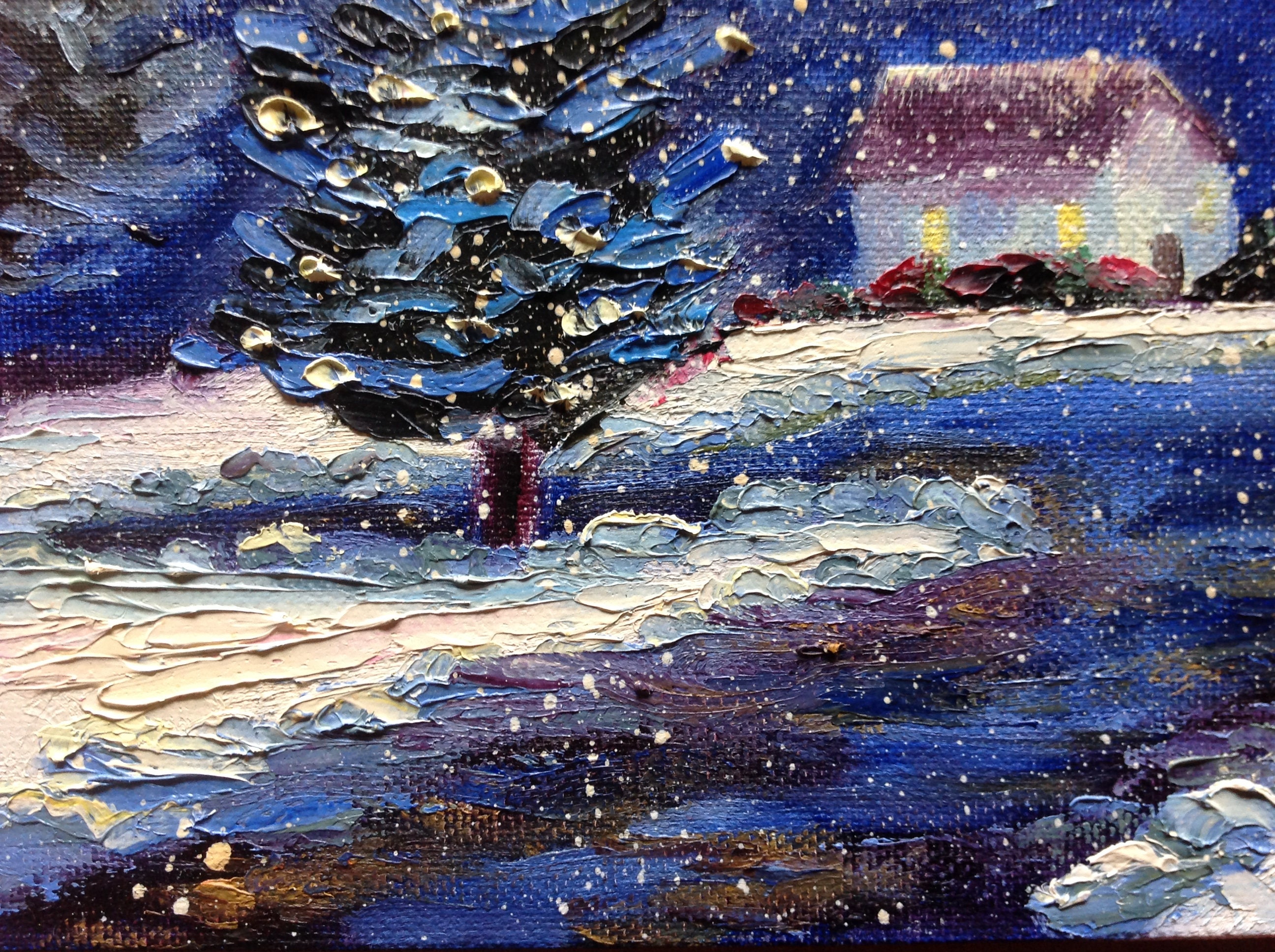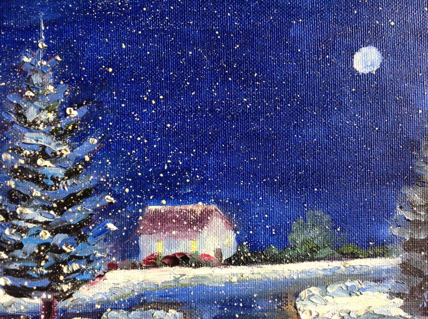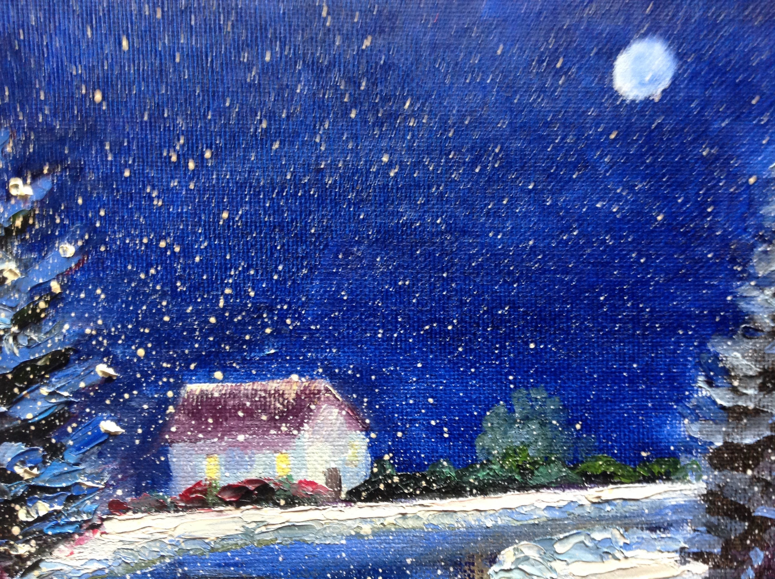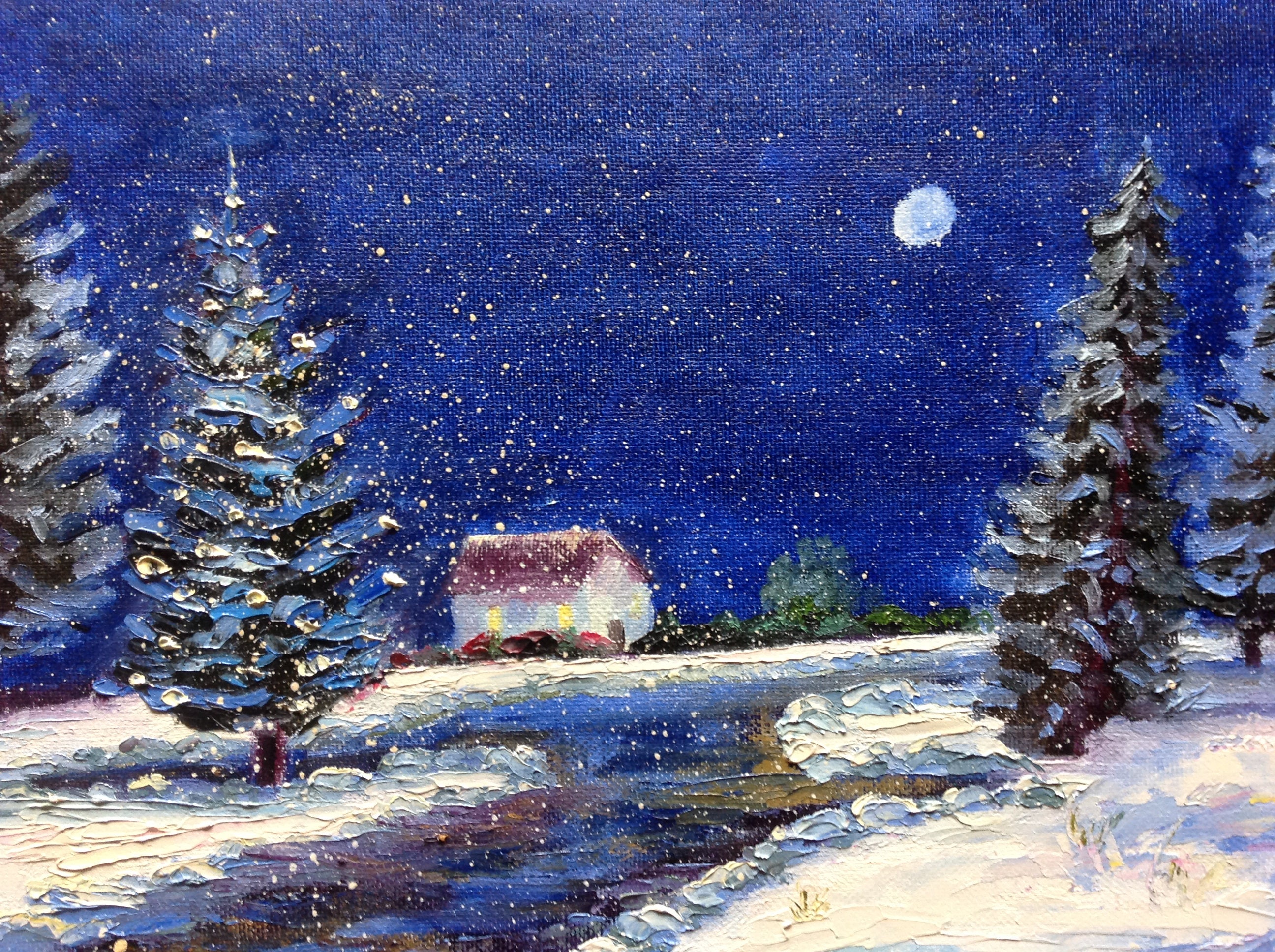 SNOWY EVE is a 12” x 9” Unframed painting on a quality canvas panel. This painting is a whimsical one of a Christmas tree lit up with colored lights in the middle of the woods. There is a gentle snow falling as night falls. The evergreen trees already have snow on them, so they are lit up by the full moon shining in the night sky. There is a house in the distance, lit up against the dark night. This painting is done on Professional canvas panel and the depth is 1/8".