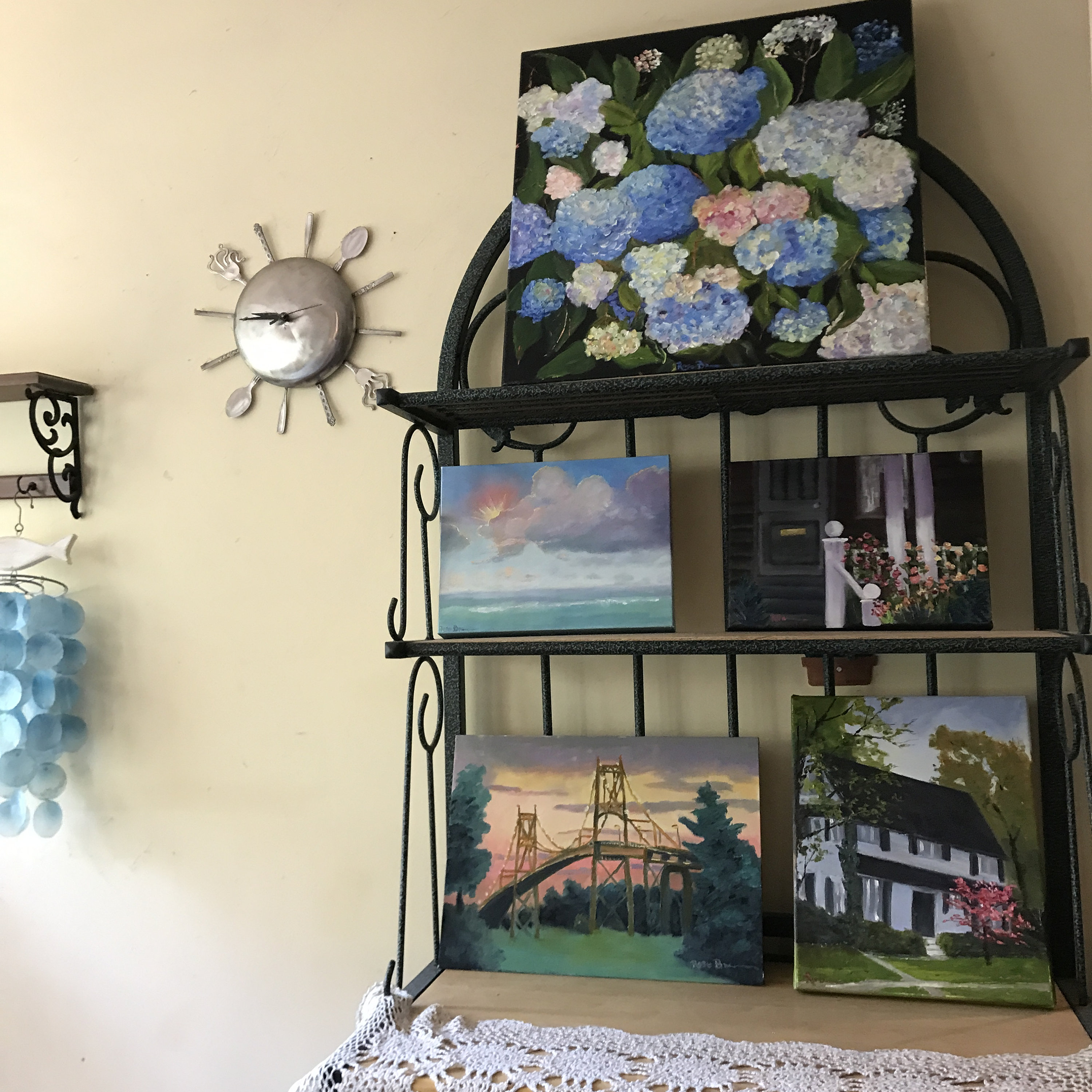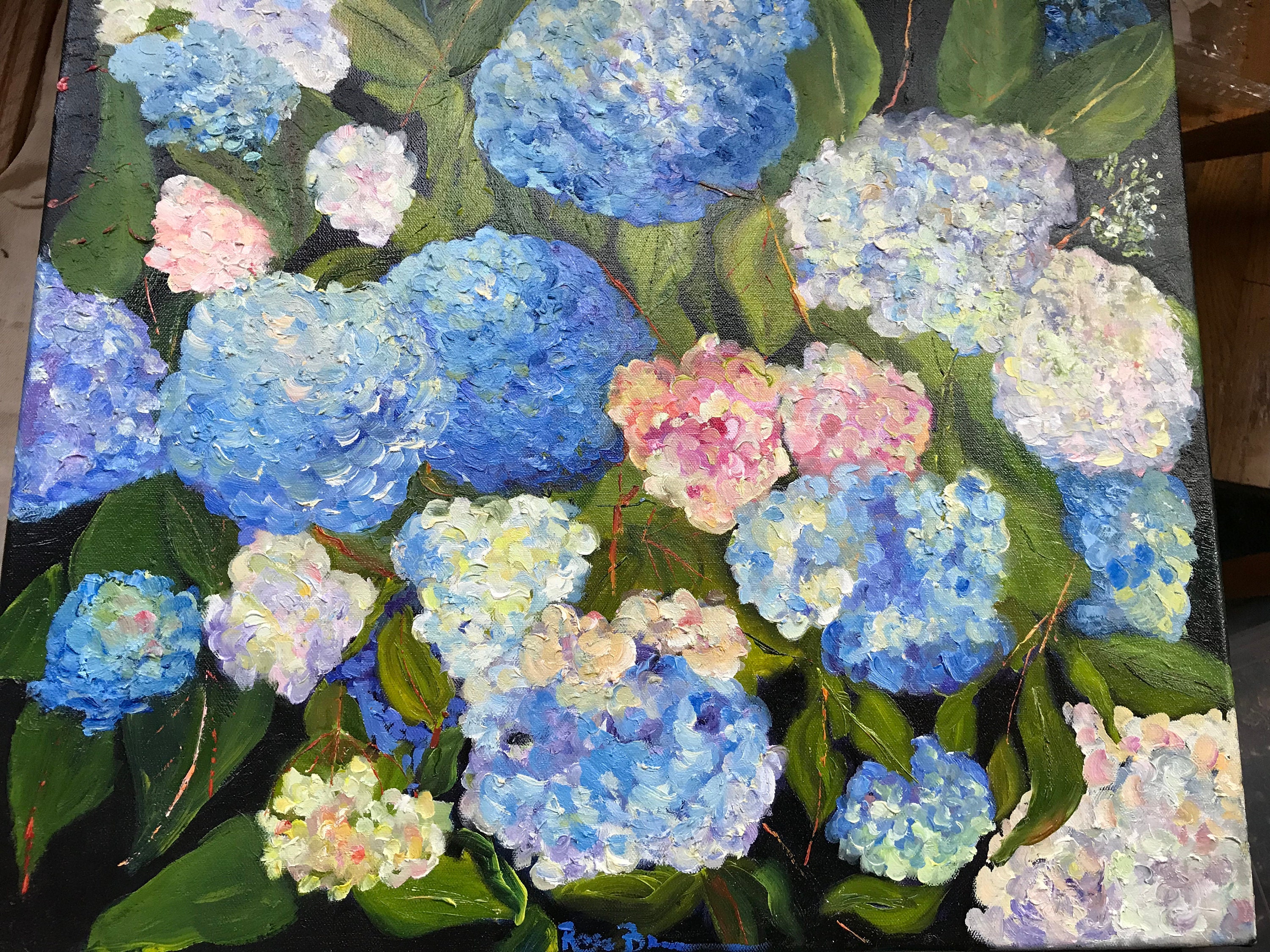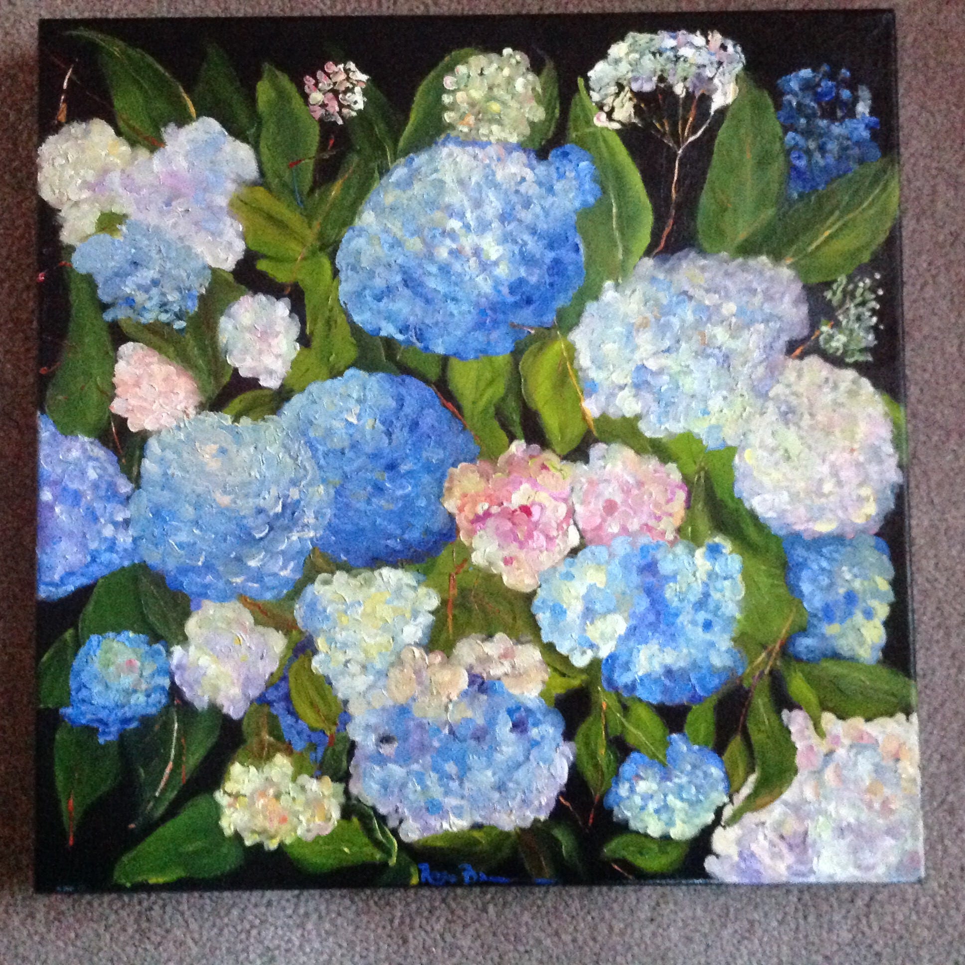 BLUE HYDRANGEAS is an original 20" x 20" oil painting on a gallery wrap canvas. This is an incredible painting! It is a bright, colorful scene of a Hydrangea bush blooming. The flowers range from shades of blues to creams, to pinks, to purples. All of the colors you would see in a blooming hydrangea bush. This is an amazing painting that would light up any room you put it in. The painting canvas is called a Gallery Wrap and has a depth of 2". The edges are painted and no frame is needed It will come ready to hang. There is an impressionistic feel to the whole painting which is very pleasing.