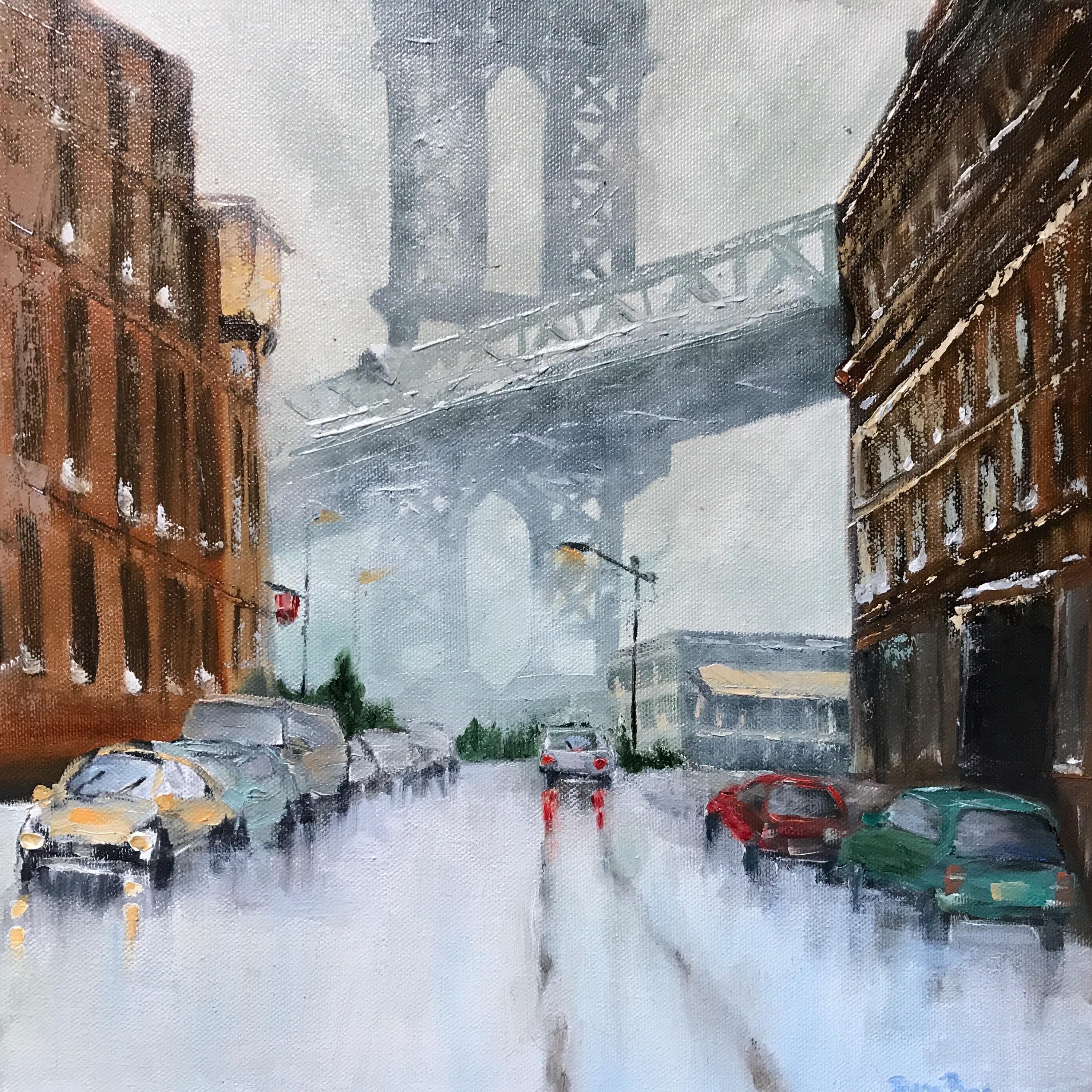 BROOKLYN BRIDGE is an original 12" x 12" x 2” oil painting on a gallery wrap canvas. The painting is of a snowy street scene of city streets in Brooklyn. At the end of the street, the Brooklyn Bridge can be seen through the fog. Cars are parked along both sides of the street. Snow is falling, so the streets are slushy, leaving tire tracks as a car drives away. There is a little snow on the windowsills. The buildings look very real in the fog. This is an impressionist painting with misty atmosphere. It will enhance many color schemes. This is a distinctive painting of a bridge that everyone will recognize.