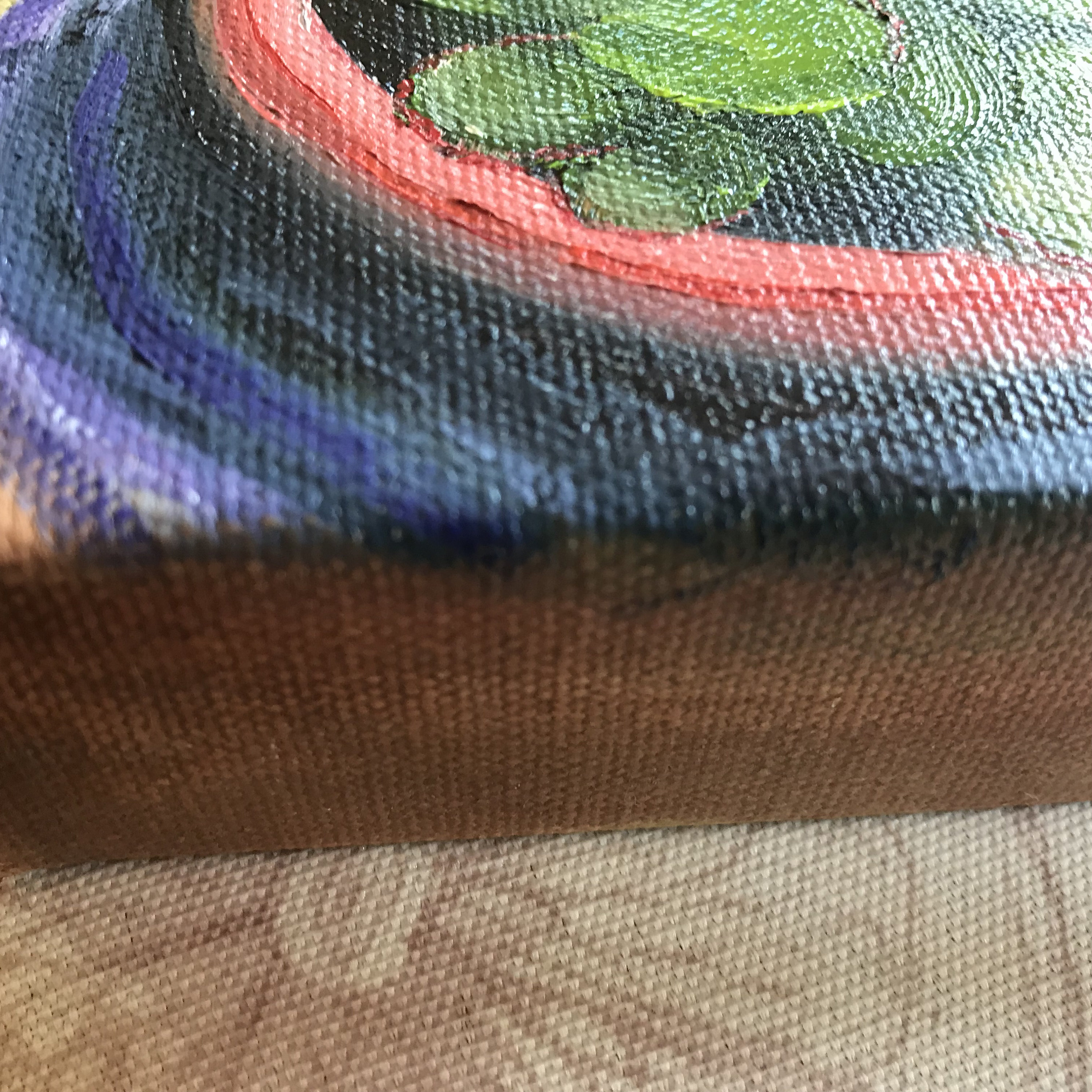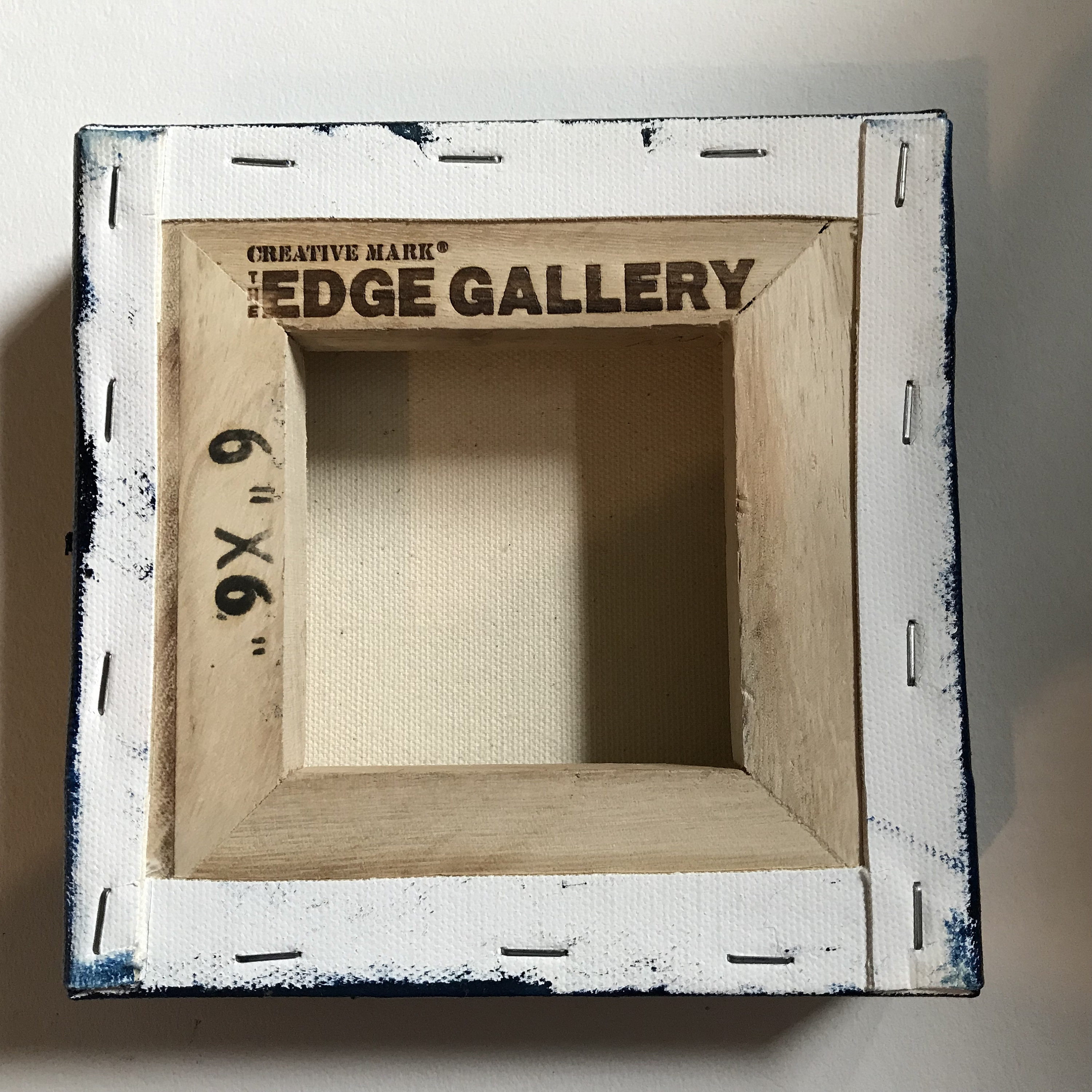 One of the pictures shows the side of the gallery wrap canvas. As you can see, it is painted a black color. It is a 2" deep canvas. This a wonderful Mini Painting that would look perfect on a shelf in your office or at home. It comes unframed, and works fine sitting on a shelf. This means you don't frame this painting. It comes ready to hang.