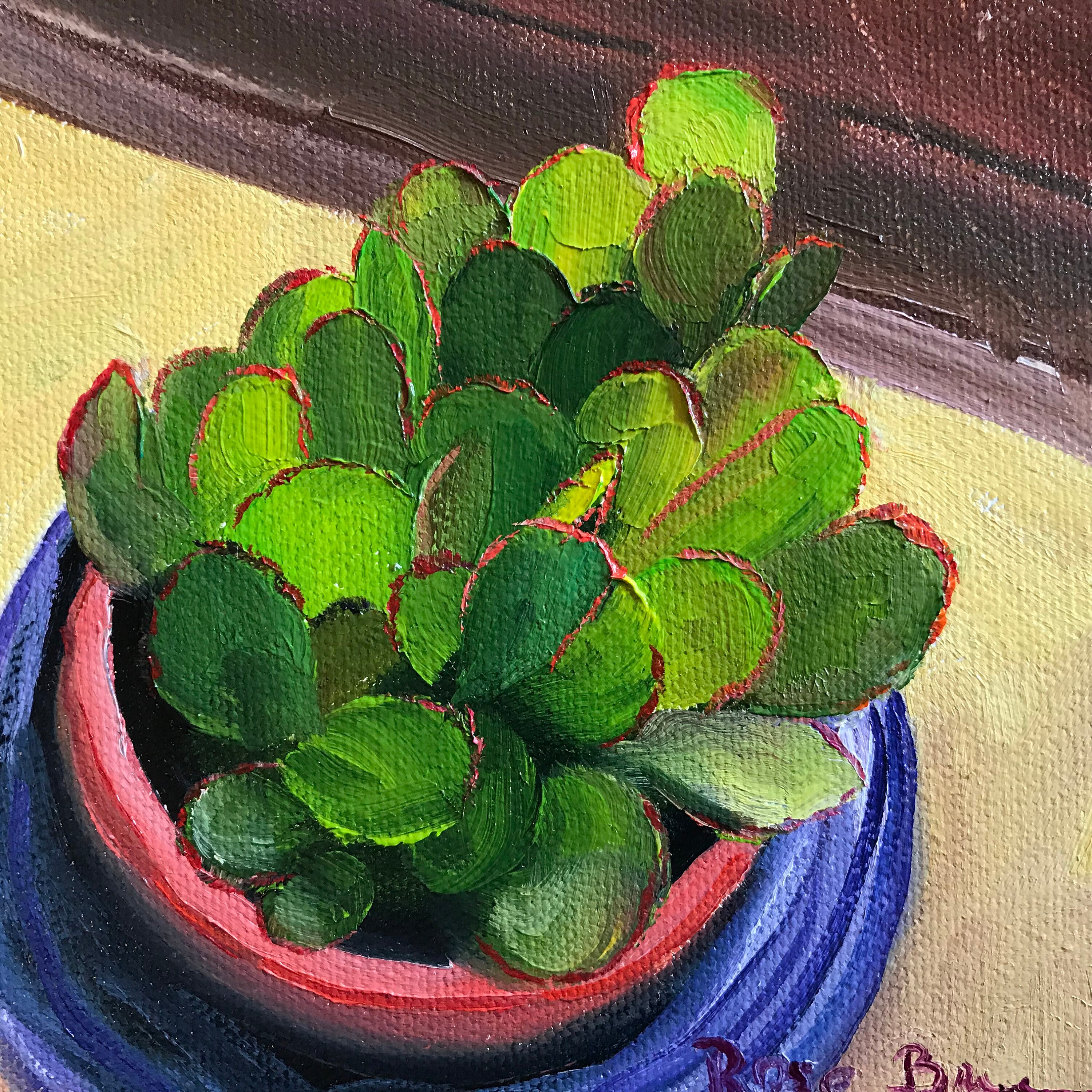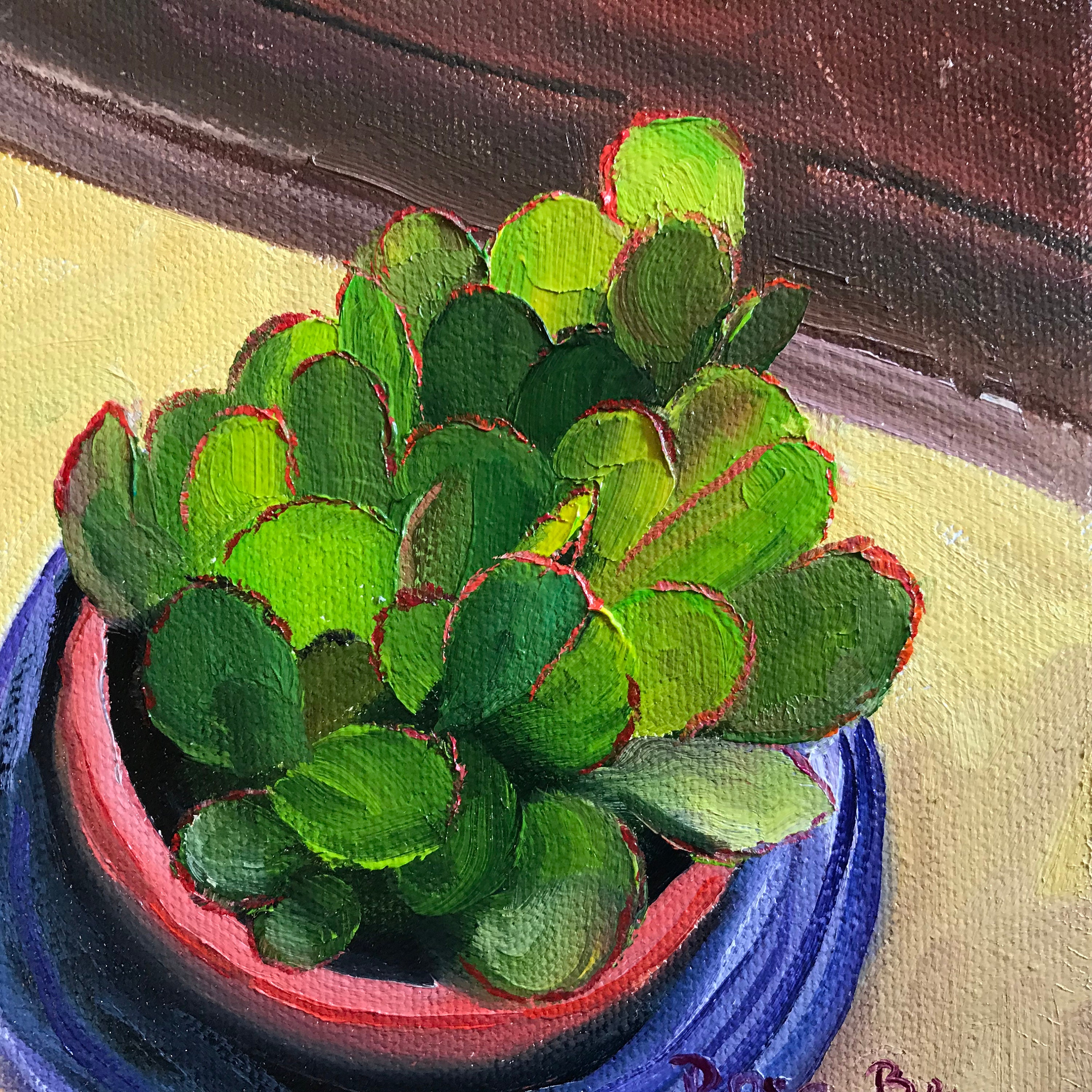 JADE PLANTS. is an original 6" x 6" oil painting on a gallery wrap canvas. It is an impressionistic picture of a pot of jade plant in the sun. The plant is luminous as the sun hits it on the windowsill.