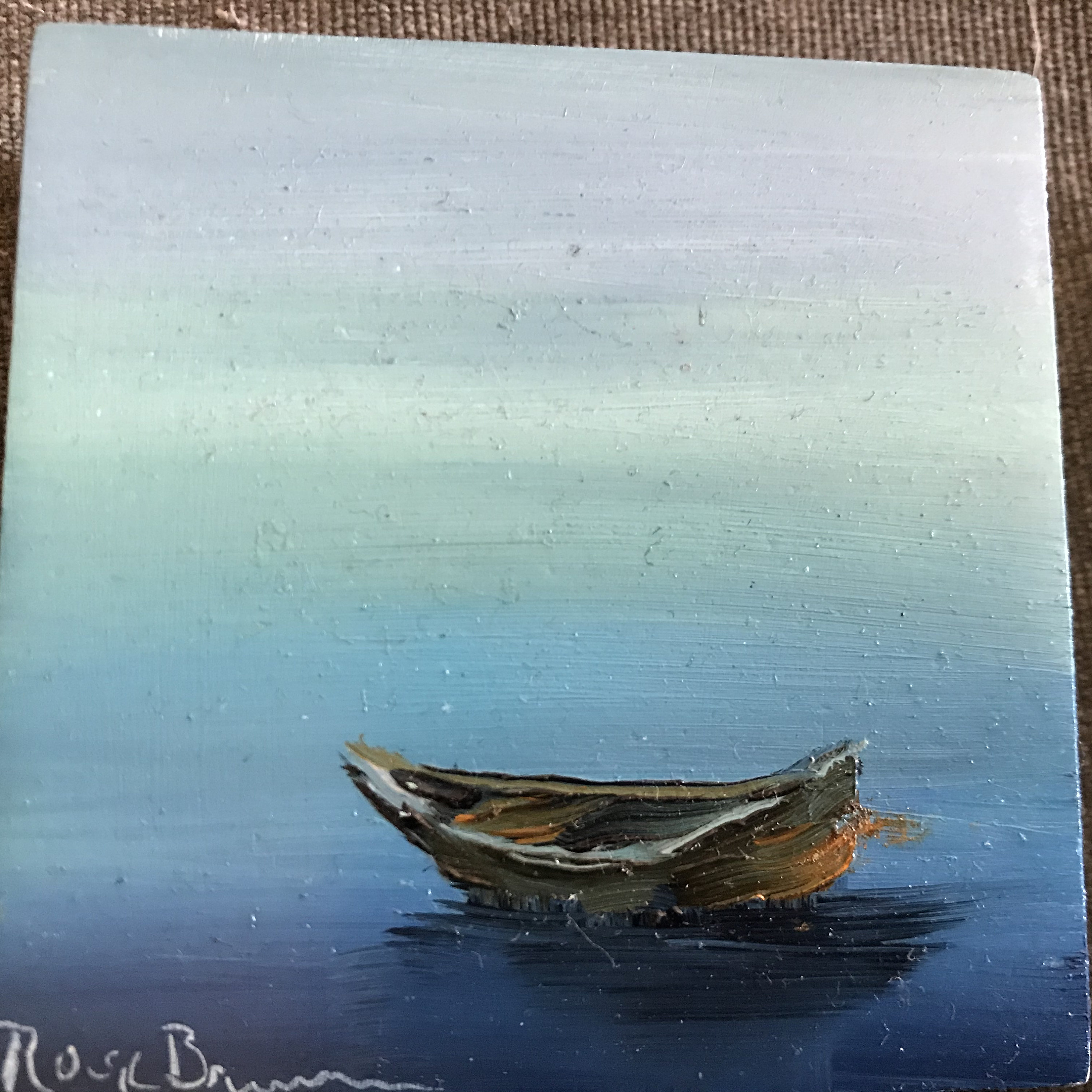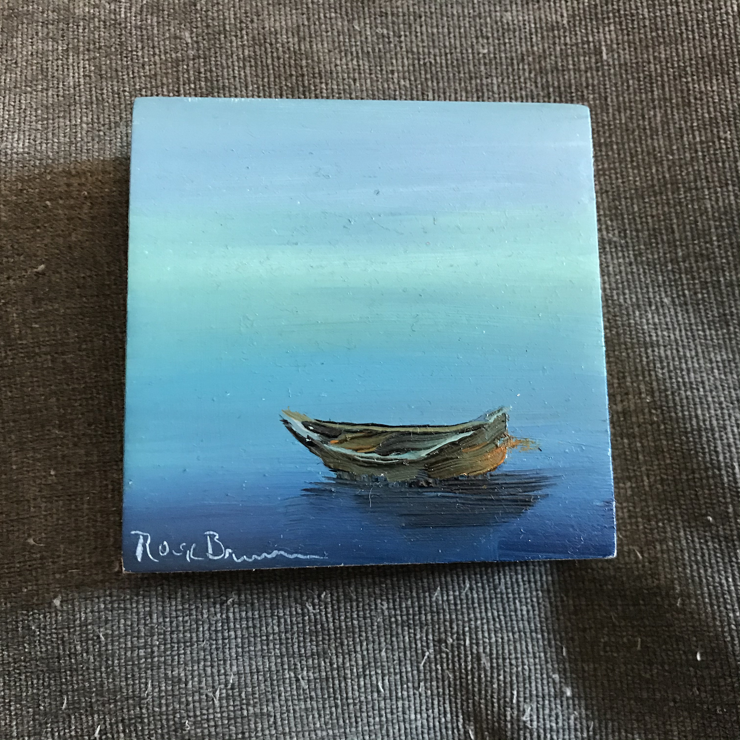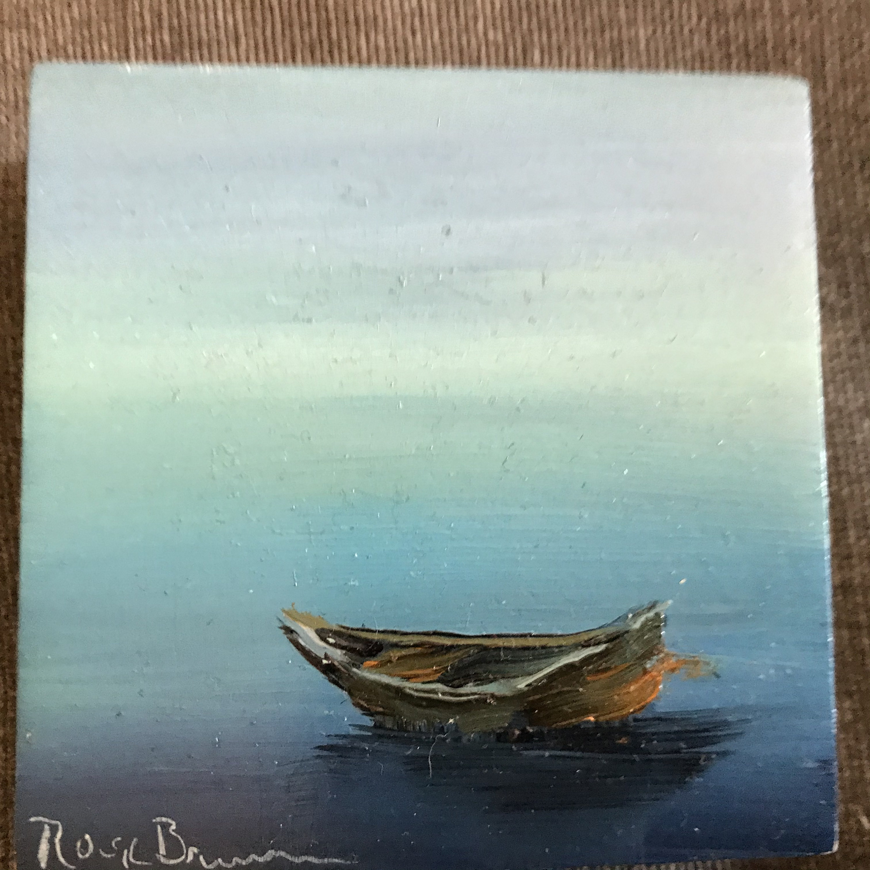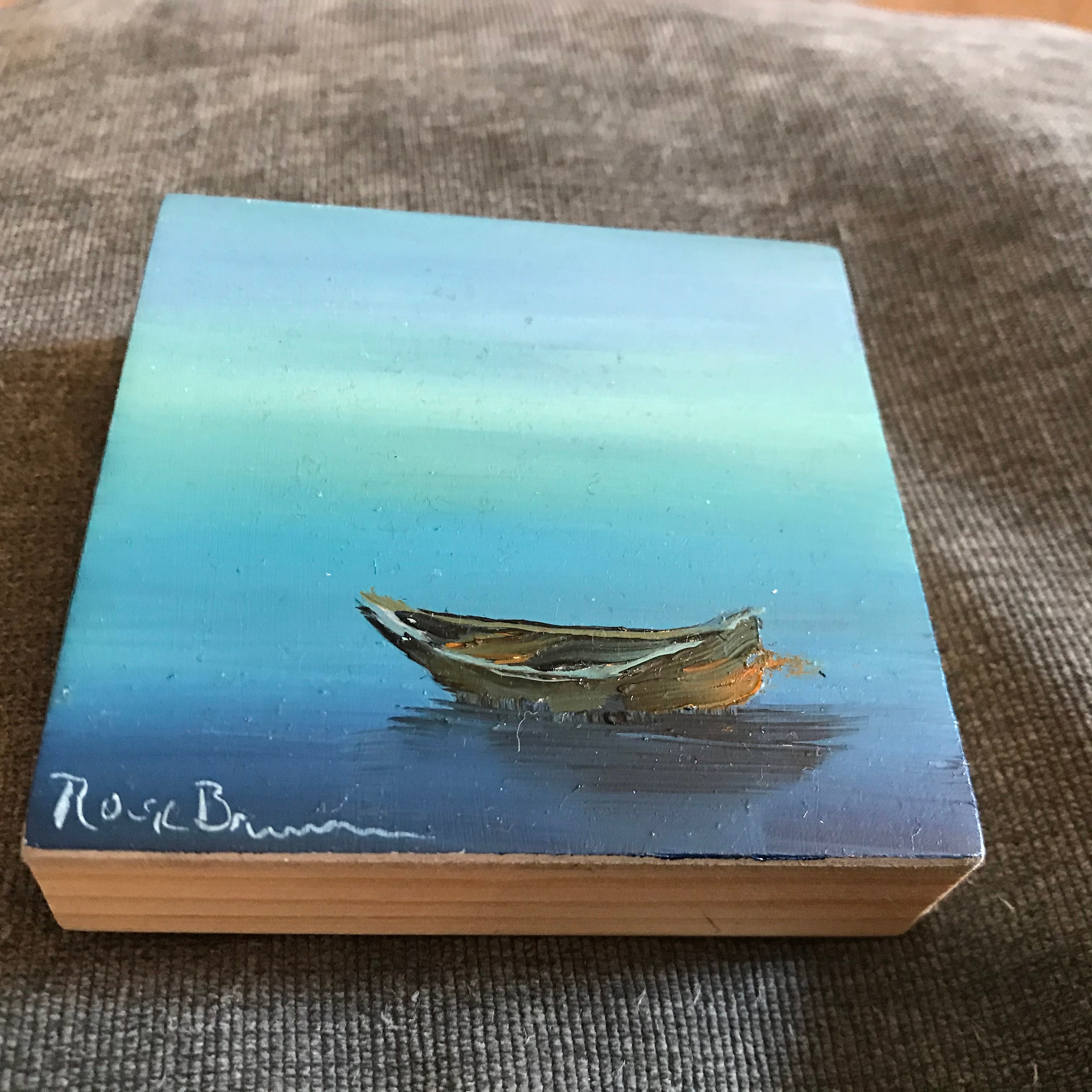 THE EMPTY BOAT is a 3” x 3” Unframed painting on a 3/4" deep wood canvas. This is a wonderful mini masterpiece that fits so well on the office desk or a little shelf in the bedroom. This amazing scene shows an empty fishing boat done in an impressionist style. The atmosphere is misty at dawn. The colors are bright and vivid.